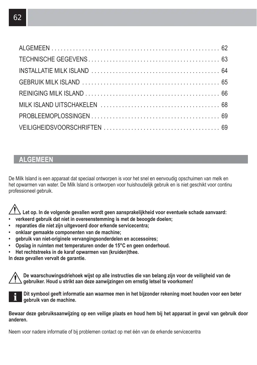 Opgelet: kaak de karaf en de andere onderdelen schoon alvorens de Milk Island te gebruiken. Controller of alle onderdelen correct geinstalleerd zijn. Het glas van de karaf kan hog temperaturen bereiken: gevaar voor brandwonden! Gebruik alleen melk en water in de Milk Island. Het is verboden andere vloeistoffen met andere chemische samenstelingen te gebruiken in het apparaat.
