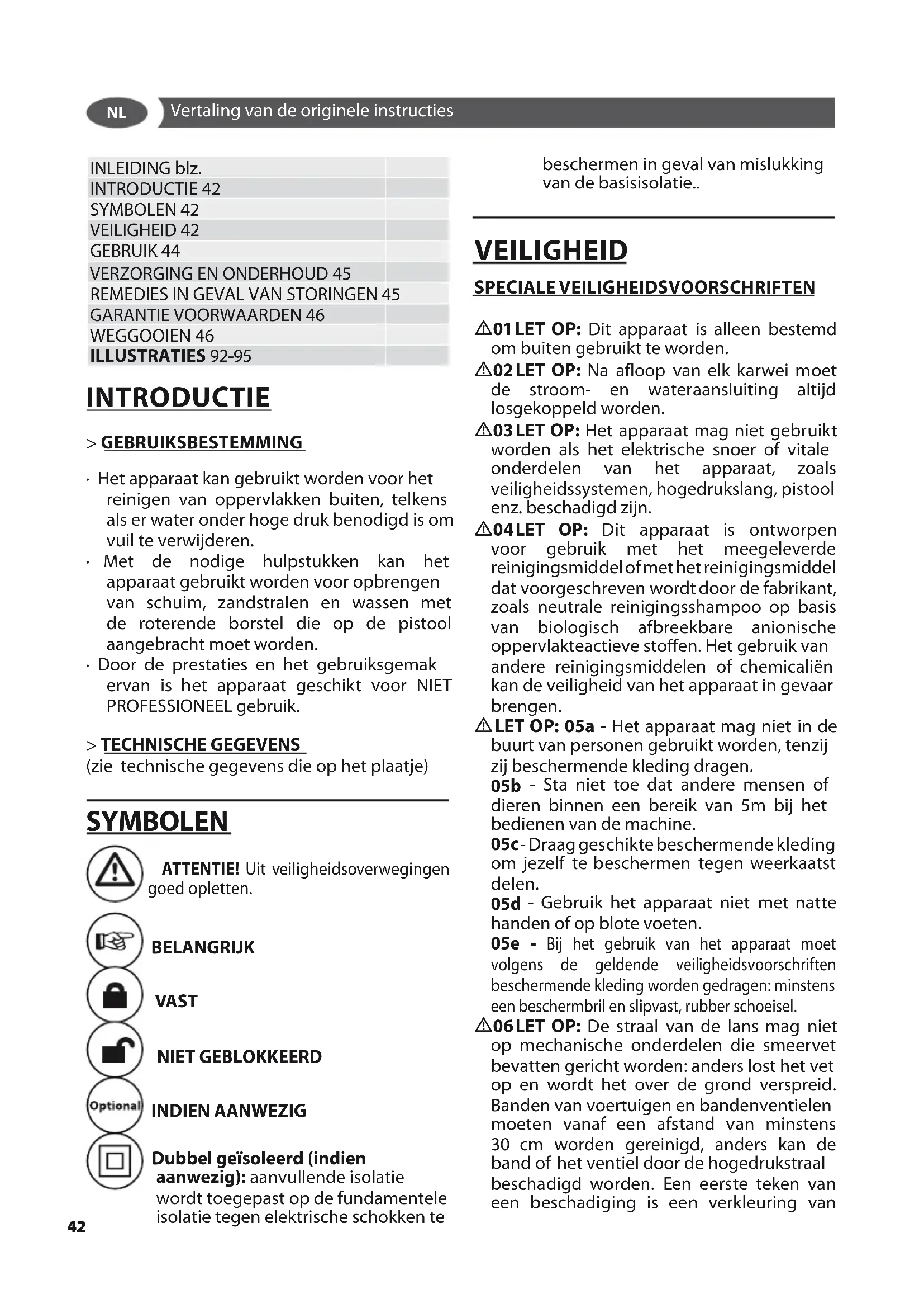 - 03 LET OP: Het apparaat mag niet gebruikt worden als het elektrische snoer of vitale onderdelen van het apparaat, zoals veiligheidssystemen, hogedrukslang, pistool enz. beschadigd zijn.
