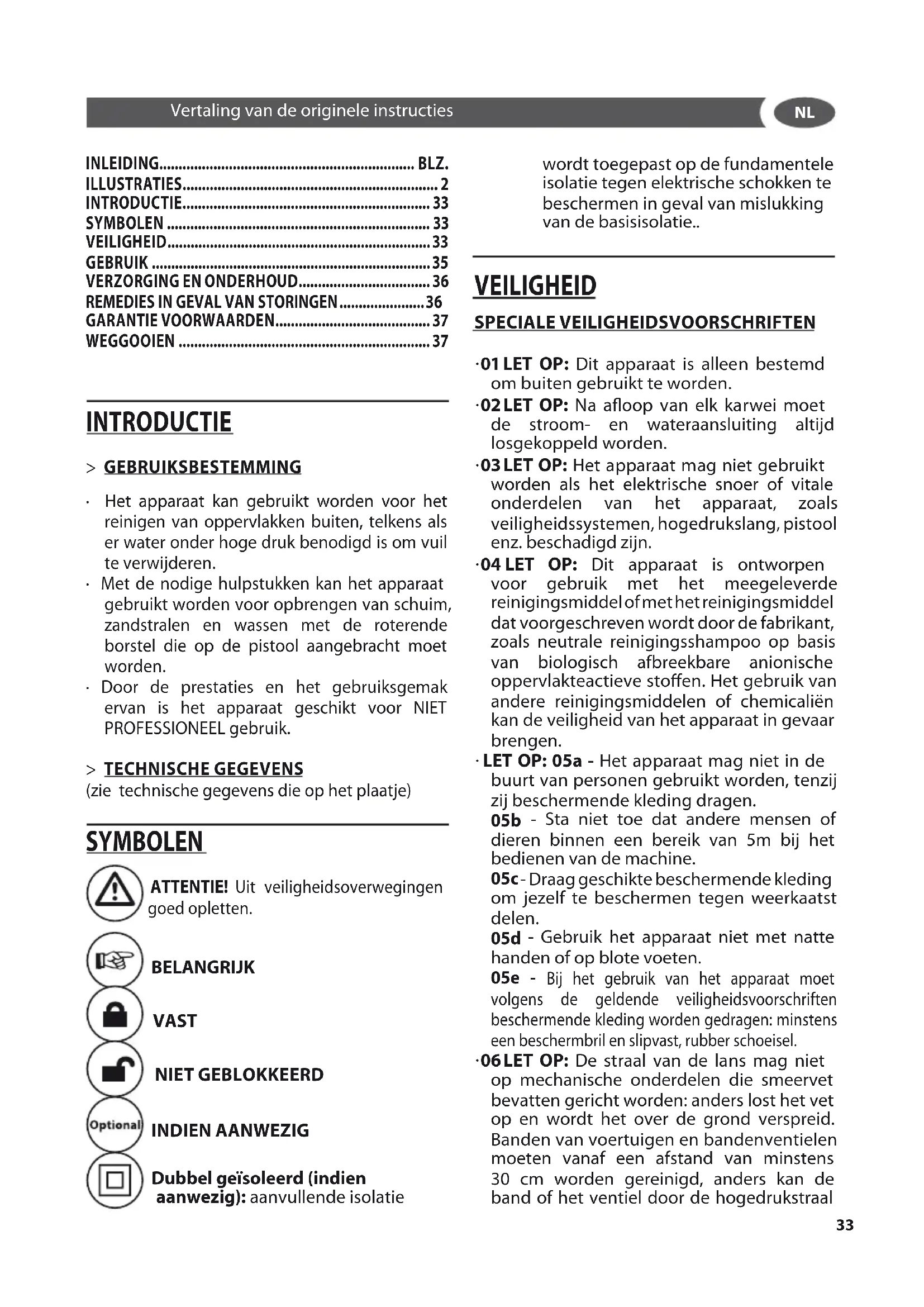 - 06 LET OP: De straal van de lans mag niet op mechanische onderdelen die smeervet bevatten gericht worden: anders lost het vet op en wordt het over de grond verspreid. Banden van voertuigen en bandenventielen moeten vanaf een afstand van minstens 30 cm worden gereinigd, anders kan de band of het ventiel door de hogedrukstraal INLEIDING .................................................................. BLZ. ILLUSTRATIES .................................................................. 2 INTRODUCTIE ................................................................ 33 SYMBOLEN .................................................................... 33 VEILIGHEID .................................................................... 33 GEBRUIK ........................................................................ 35