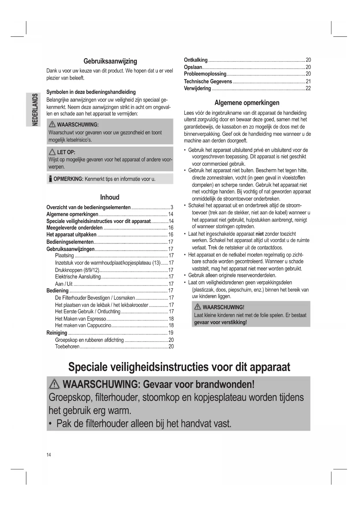 - Laat om veiligheidsredenen geen verpakkingsdelen (plasticzak, doos, piepschuim, enz.) binnen het bereik van uw kinderen liggen. WAARSCHUWING! Laat kleine kinderen niet met de folie spelen. Er bestaat gevaar voor verstikking! Gebruiksaanwijzing Dank u voor uw keuze van dit product. We hopen dat u er veel plezier van beleeft. Symbolen in deze bedieningshandleiding Belangrijke aanwijzingen voor uw veiligheid zijn speciaal ge- kenmerkt. Neem deze aanwijzingen strikt in acht om ongeval- len en schade aan het apparaat te vermijden: WAARSCHUWING: Waarschuwt voor gevaren voor uw gezondheid en toont mogelijk letselrisico’s. LET OP: Wijst op mogelijke gevaren voor het apparaat of andere voor- werpen. OPMERKING: Kenmerkt tips en informatie voor u. Inhoud Overzicht van de bedieningselementen ................................ 3 Algemene opmerkingen .........................................................14 Speciale veiligheidsinstructies voor dit apparaat...............14 Meegeleverde onderdelen .....................................................16 Het apparaat uitpakken ..........................................................16 Bedieningselementen .............................................................17 Gebruiksaanwijzingen ............................................................17 Plaatsing .............................................................................17 Inzetstuk voor de warmhoudplaat/kopjesplateau (13) ...... 17 Drukknoppen (8/9/12).........................................................17 Elektrische Aansluiting........................................................17 Aan / Uit .............................................................................. 17 Bediening .................................................................................17 De Filterhouder Bevestigen / Losmaken ........................... 17 Het plaatsen van de lekbak / het lekbakrooster ................ 17 Het Eerste Gebruik / Ontluchting ....................................... 17 Het Maken van Espresso ...................................................18 Het maken van Cappuccino ...............................................18 Reiniging ..................................................................................19 Groepskop en rubberen afdichting ....................................20 Toebehoren ......................................................................... 20 Speciale veiligheidsinstructies voor dit apparaat WAARSCHUWING: Gevaar voor brandwonden! Groepskop, lterhouder, stoomkop en kopjesplateau worden tijdens het gebruik erg warm.