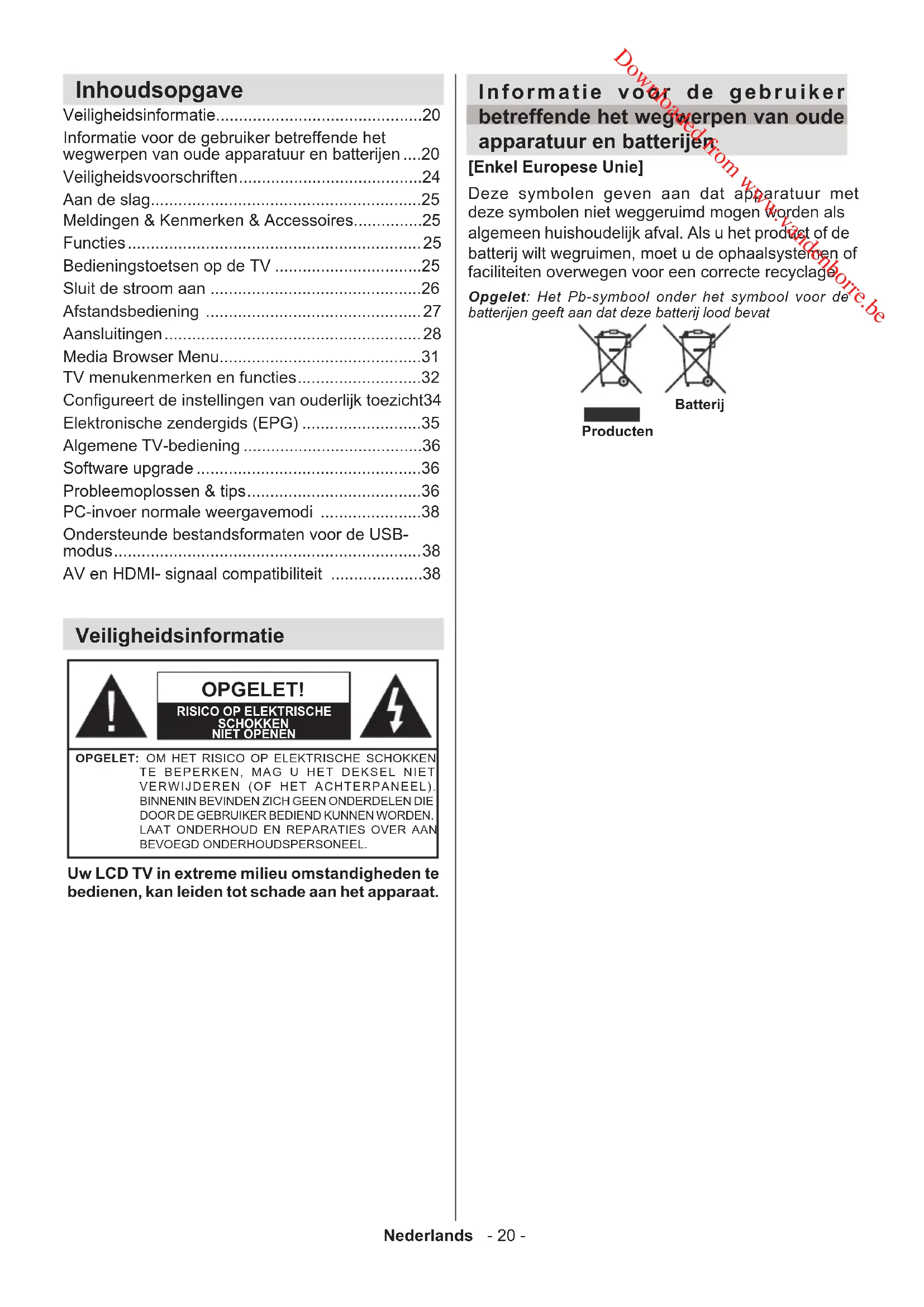 - Darty Plc © UK: EC1N 6TE 26/05/2014 Downloaded from www.vandenborre.beNederlands - 20 - Veiligheidsinformatie Uw LCD TV in extreme milieu omstandigheden te bedienen, kan leiden tot schade aan het apparaat. OPGELET! RISICO OP ELEKTRISCHE SCHOKKENNIET OPENENOPGELET: OM HET RISICO OP ELEKTRISCHE SCHOKKEN TE BEPERKEN, MAG U HET DEKSEL NIET VERWIJDEREN (OF HET ACHTERPANEEL). BINNENIN BEVINDEN ZICH GEEN ONDERDELEN DIE DOOR DE GEBRUIKER BEDIEND KUNNEN WORDEN. LAAT ONDERHOUD EN REPARATIES OVER AAN BEVOEGD ONDERHOUDSPERSONEEL. Inhoudsopgave Veiligheidsinformatie p. 20