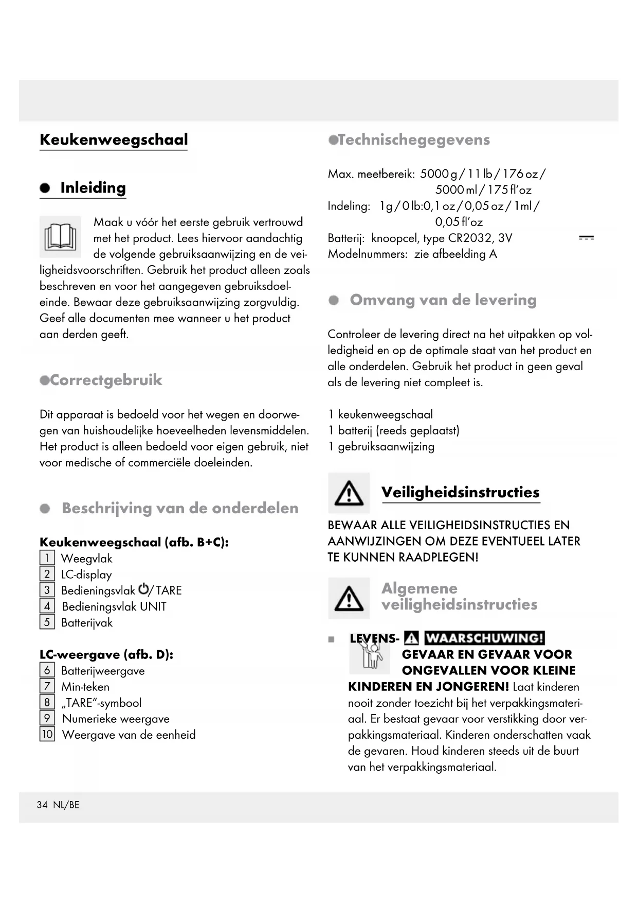 Weergave van de eenheid Technische gegevens Max. meetbereik: 5000 g / 11 lb / 176 oz / 5000 ml / 175 fl’oz Indeling: 1g / 0 lb:0,1 oz / 0,05 oz / 1ml / 0,05 fl’oz Batterij: knoopcel, type CR2032, 3V Modelnummers: zie afbeelding A Omvang van de levering Controleer de levering direct na het uitpakken op vol- ledigheid en op de optimale staat van het product en alle onderdelen. Gebruik het product in geen geval als de levering niet compleet is. 1 keukenweegschaal 1 batterij (reeds geplaatst) 1 gebruiksaanwijzing Veiligheidsinstructies