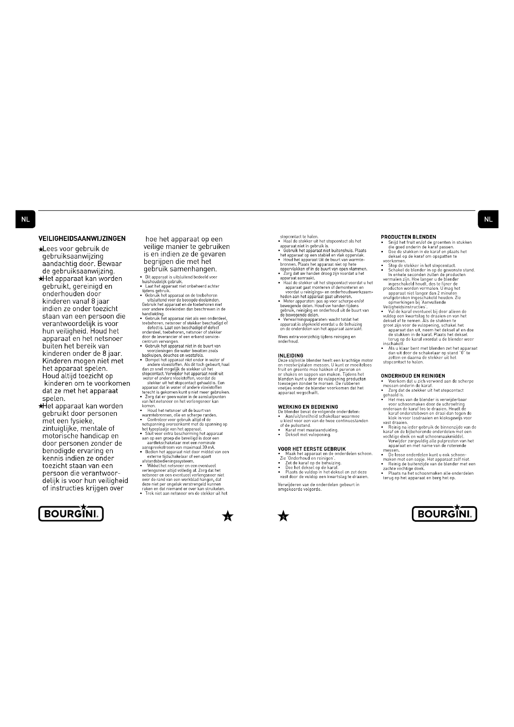© THE BOURGINI COMPANY B.V. WWW.BOURGINI.COMVEILIGHEIDSAANWIJZINGEN Lees voor gebruik de gebruiksaanwijzing aandachtig door. Bewaar de gebruiksaanwijzing. Het apparaat kan worden gebruikt, gereinigd en onderhouden door kinderen vanaf 8 jaar indien ze onder toezicht staan van een persoon die verantwoordelijk is voor hun veiligheid. Houd het apparaat en het netsnoer buiten het bereik van kinderen onder de 8 jaar. Kinderen mogen niet met het apparaat spelen. Houd altijd toezicht op kinderen om te voorkomen dat ze met het apparaat spelen. Het apparaat kan worden gebruikt door personen met een fysieke, zintuiglijke, mentale of motorische handicap en door personen zonder de benodigde ervaring en kennis indien ze onder toezicht staan van een persoon die verantwoor- delijk is voor hun veiligheid of instructies krijgen over hoe het apparaat op een veilige manier te gebruiken is en indien ze de gevaren begrijpen die met het gebruik samenhangen.