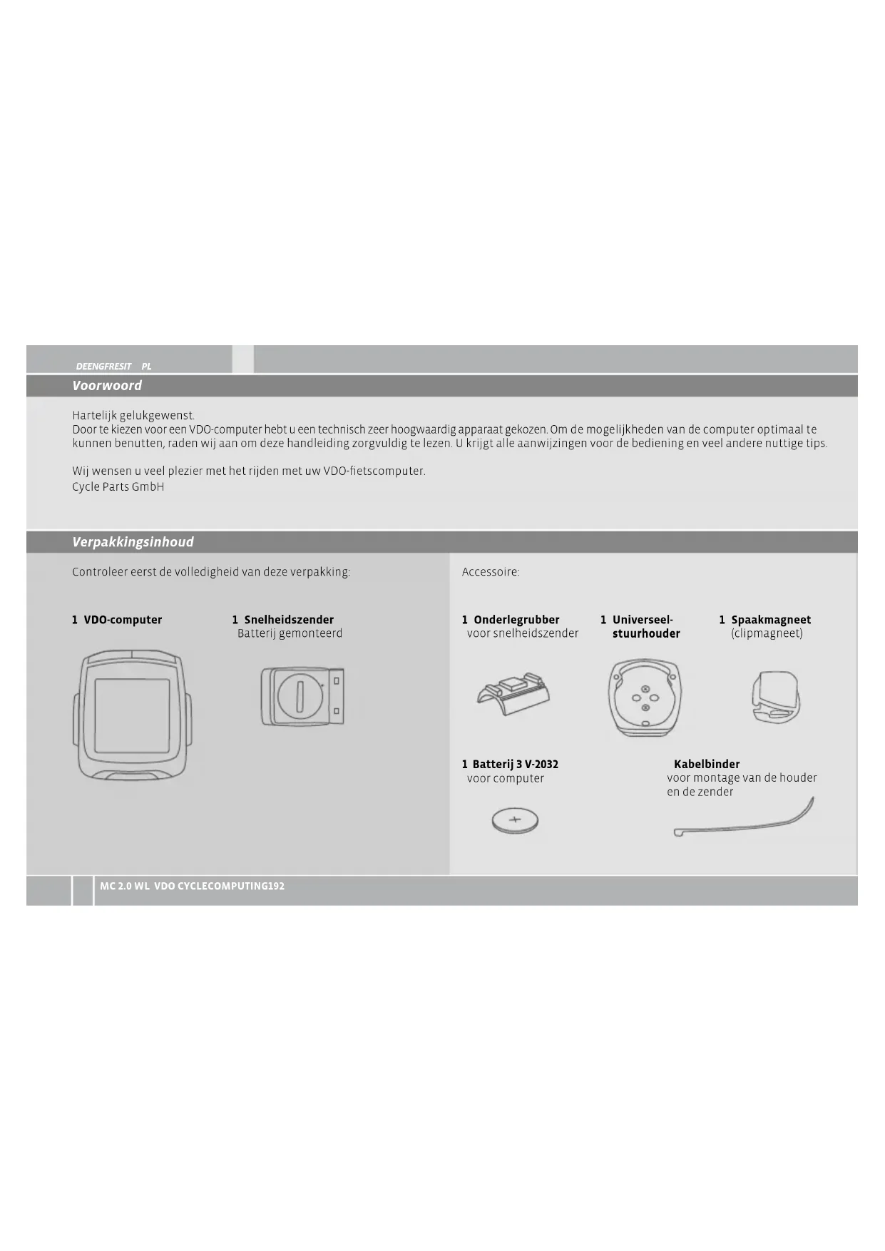 Voorwoord Hartelijk gelukgewenst. Door te kiezen voor een VDO-computer hebt u een technisch zeer hoogwaardig apparaat gekozen. Om de mogelijkheden van de computer optimaal te kunnen benutten, raden wij aan om deze handleiding zorgvuldig te lezen. U krijgt alle aanwijzingen voor de bediening en veel andere nuttige tips. Wij wensen u veel plezier met het rijden met uw VDO-fietscomputer. Cycle Parts GmbH Verpakkingsinhoud Controleer eerst de volledigheid van deze verpakking: 1 VDO-computer Accessoire: 1 Snelheidszender Batterij gemonteerd 1 Universeel- stuurhouder 1 Spaakmagneet (clipmagneet) 1 Batterij 3 V-2032 voor computer Kabelbinder voor montage van de houder en de zender 1 Onderlegrubber voor snelheidszenderITNLPL FRES ENG DE www.vdocyclecomputing.com MC 2.0 WL 193 Inhoudsopgave