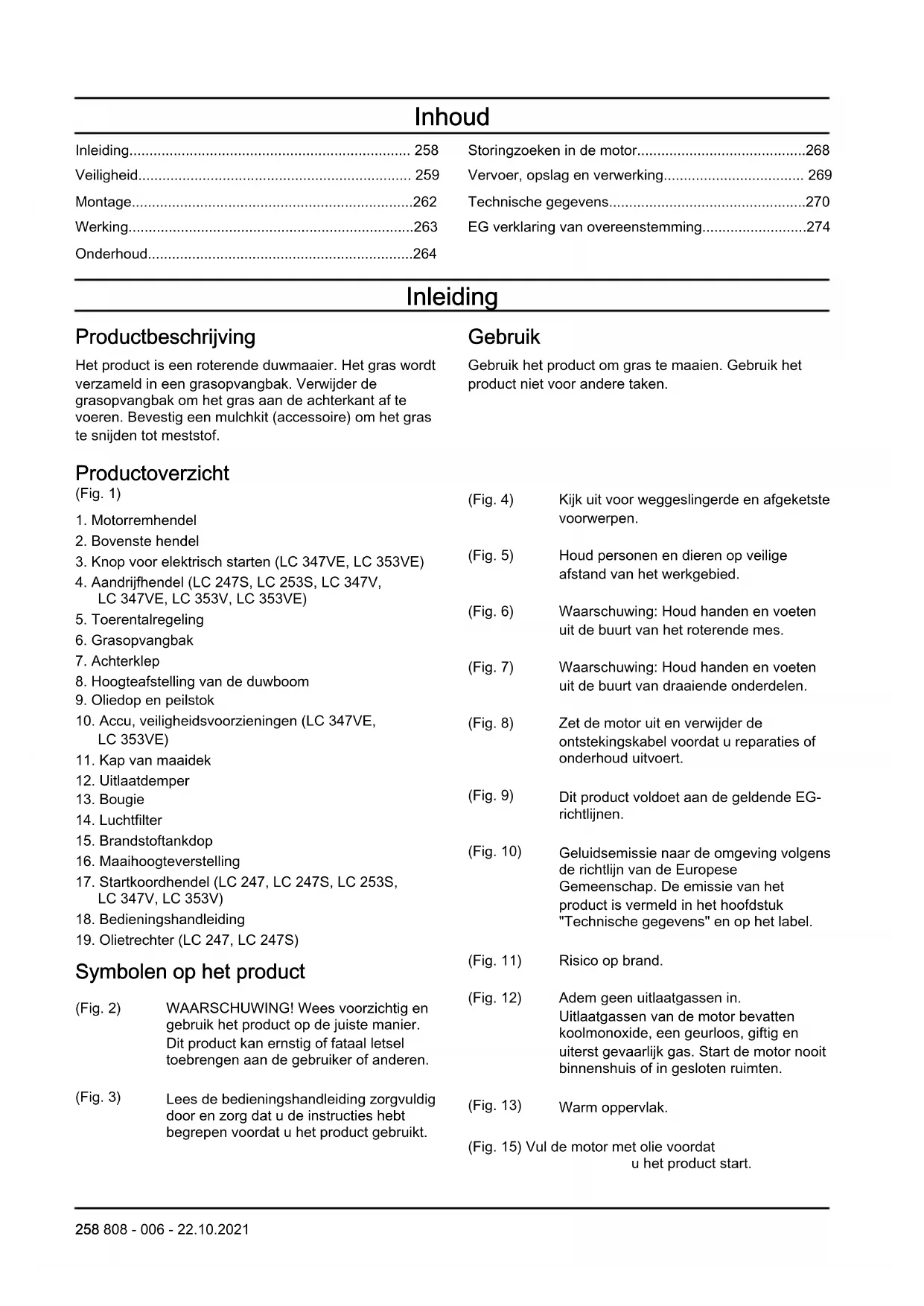 Symbolen op het product (Fig. 2) WAARSCHUWING! Wees voorzichtig en gebruik het product op de juiste manier. Dit product kan ernstig of fataal letsel toebrengen aan de gebruiker of anderen. (Fig. 3) Lees de bedieningshandleiding zorgvuldig door en zorg dat u de instructies hebt begrepen voordat u het product gebruikt. (Fig. 4) Kijk uit voor weggeslingerde en afgeketste voorwerpen. (Fig. 5) Houd personen en dieren op veilige afstand van het werkgebied. (Fig. 6) Waarschuwing: Houd handen en voeten uit de buurt van het roterende mes. (Fig. 7) Waarschuwing: Houd handen en voeten uit de buurt van draaiende onderdelen. (Fig. 8) Zet de motor uit en verwijder de ontstekingskabel voordat u reparaties of onderhoud uitvoert. (Fig. 9) Dit product voldoet aan de geldende EG- richtlijnen. (Fig. 10) Geluidsemissie naar de omgeving volgens de richtlijn van de Europese Gemeenschap. De emissie van het product is vermeld in het hoofdstuk "Technische gegevens" en op het label. (Fig. 11) Risico op brand. (Fig. 12) Adem geen uitlaatgassen in. Uitlaatgassen van de motor bevatten koolmonoxide, een geurloos, giftig en uiterst gevaarlijk gas. Start de motor nooit binnenshuis of in gesloten ruimten. (Fig. 13) Warm oppervlak. (Fig. 15) Vul de motor met olie voordat u het product start. 258 808 - 006 - 22.10.2021(Fig. 16) Startprocedure voor LC 247, LC 247S, LC 253S, LC 347V, LC 353V: Duw de remhendel van de motor omlaag en trek aan de greep van het start- koord. (Fig. 17) Startprocedure voor LC 347VE, LC 353VE: Duw de motorremhendel omlaag en druk op de startknop. (Fig. 14) Scanbare code. Let op: Andere symbolen/stickers op het product hebben betrekking op certificeringseisen voor overige commerciële markten. Euro V-emissies WAARSCHUWING: De EU- typegoedkeuring van dit product vervalt als ongeoorloofde wijzigingen aan de motor aangebracht worden. Productaansprakelijkheid Zoals uiteengezet in de wet voor productaansprakelijkheid zijn wij niet aansprakelijk voor schade die door ons product wordt veroorzaakt, indien: