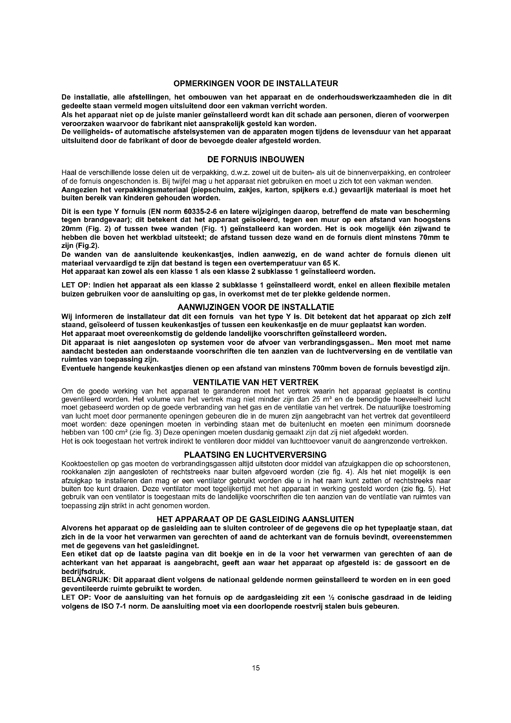 Wij informeren de installateur dat dit een fornuis van het type Y is. Dit betekent dat het apparaat op zich zelf staand, geïsoleerd of tussen keukenkastjes of tussen een keukenkastje en de muur geplaatst kan worden. Het apparaat moet overeenkomstig de geldende landelijke voorschriften geïnstalleerd worden. Dit apparaat is niet aangesloten op systemen voor de afvoer van verbrandingsgassen.. Men moet met name aandacht besteden aan onderstaande voorschriften die ten aanzien van de luchtverversing en de ventilatie van ruimtes van toepassing zijn. Eventuele hangende keukenkastjes dienen op een afstand van minstens 700mm boven de fornuis bevestigd zijn.