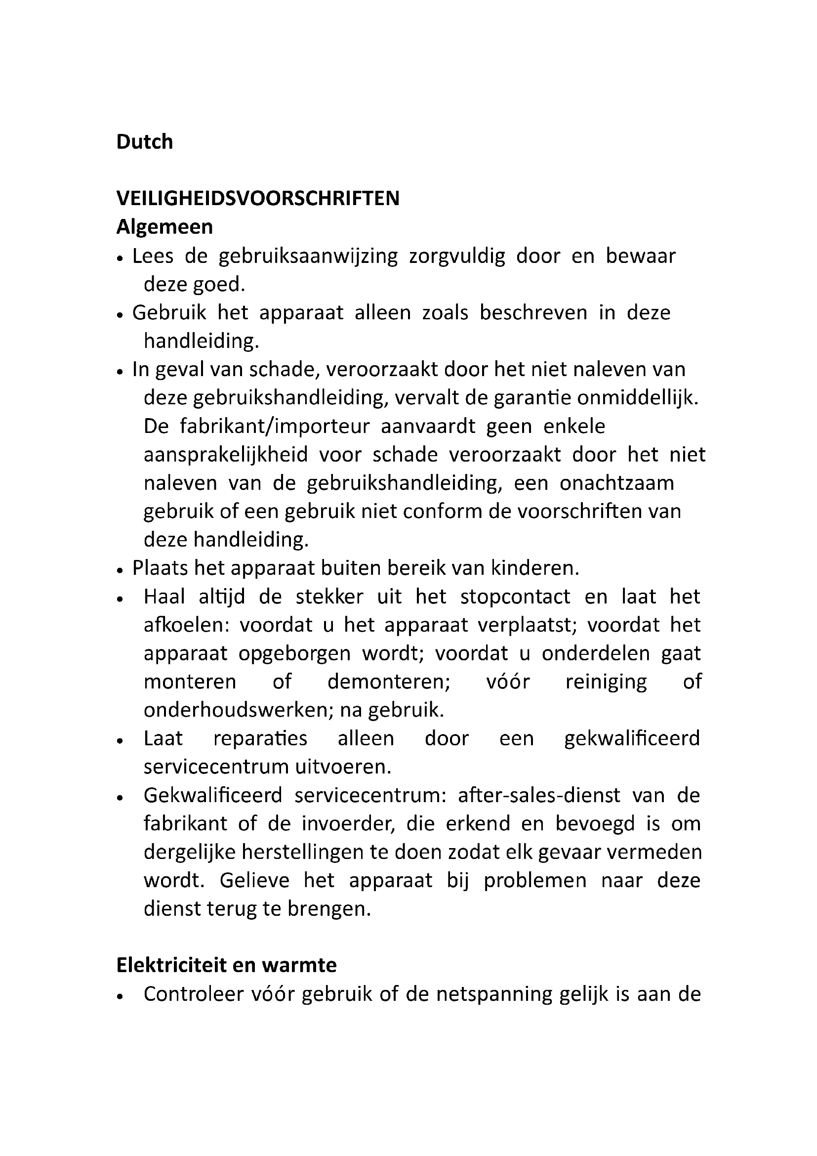 Gebreken die het gevolg zich van ondeskundig gebruik van het toestel, foutenijdens ingrepen en reparations door derden of door de inbouw van vreme de onderdelen, vallen nicht onder deze garantie. Bewaar algtduw aankoopnota, zonder aankoopnotakest u geen aanspraak maken op enige vorm van garantie. Bij schade veroorzaakt door het Niet opvolgen van de gebruiksaanwijzing verralt hetrecht op garantie. Voorervolgschade die hieruit ontstaat+kennen wij net verantwoordelijk gehonden worden. Voor materiele schade of persoonlijk letselveroorzaakt door ondeskundig gebruikof het Niet opvolgen van de veiligheidsvoorschriften zich wij Niet aansprakelijk. In dergelijkkeGeVallenvervalt iedere aanspraak op garantie. Schade aan accessoires of onderdelen betekend Niet dat het gehele apparaat za worden verrangen. Afgebrozen glazen of kunststof onderdelen of accessoires vallen Niet onder de garantie en zullen gegen vergoeding verrangen+kennen worden.Defecten aan hulpstukken of aan slijtage onderhevige onderdelen, alsmede reiniging, onderhoud of de verwangng van slijtende delen vallen Niet onder de garantie en zullen dus in rekening gebracht worden.