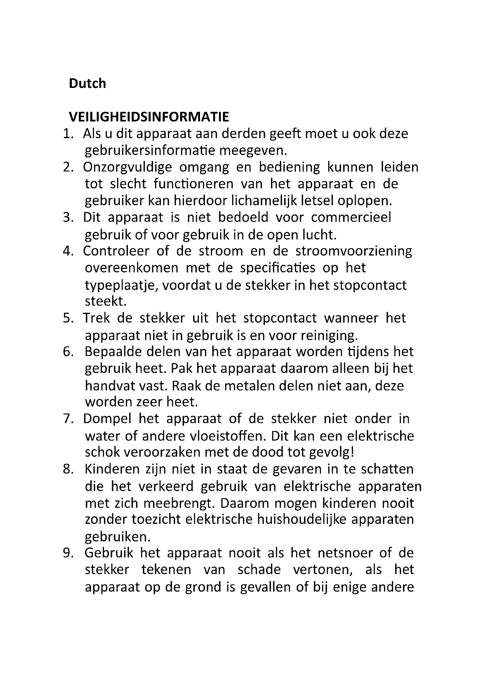 - Dompel het apparaat of de stekker niet onder in water of andere vloeistoffen. Dit kan een elektrische schok veroorzaken met de dood tot gevolg!