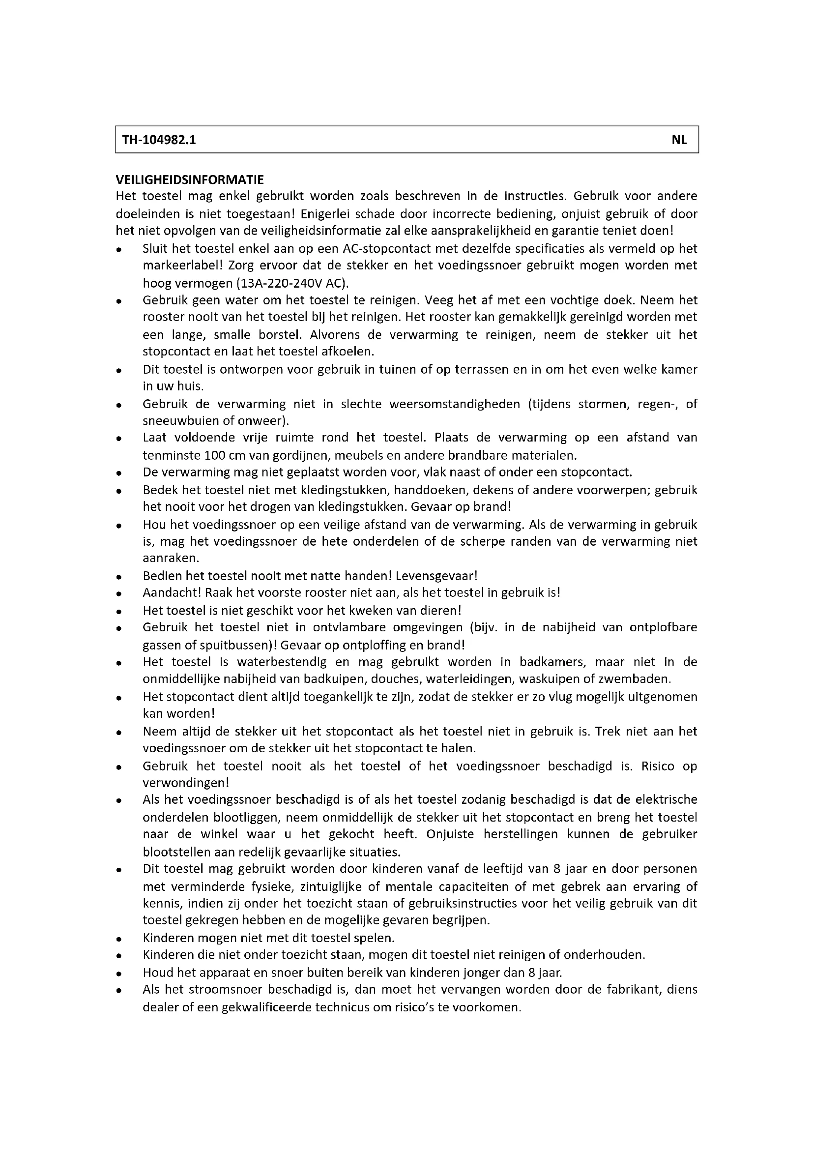 - Alhoewel deze terrasverwarming waterbestendig is, mag hij nicht gebrukt worden tijdens regenbuien of in andere vochtige omstandigheden.