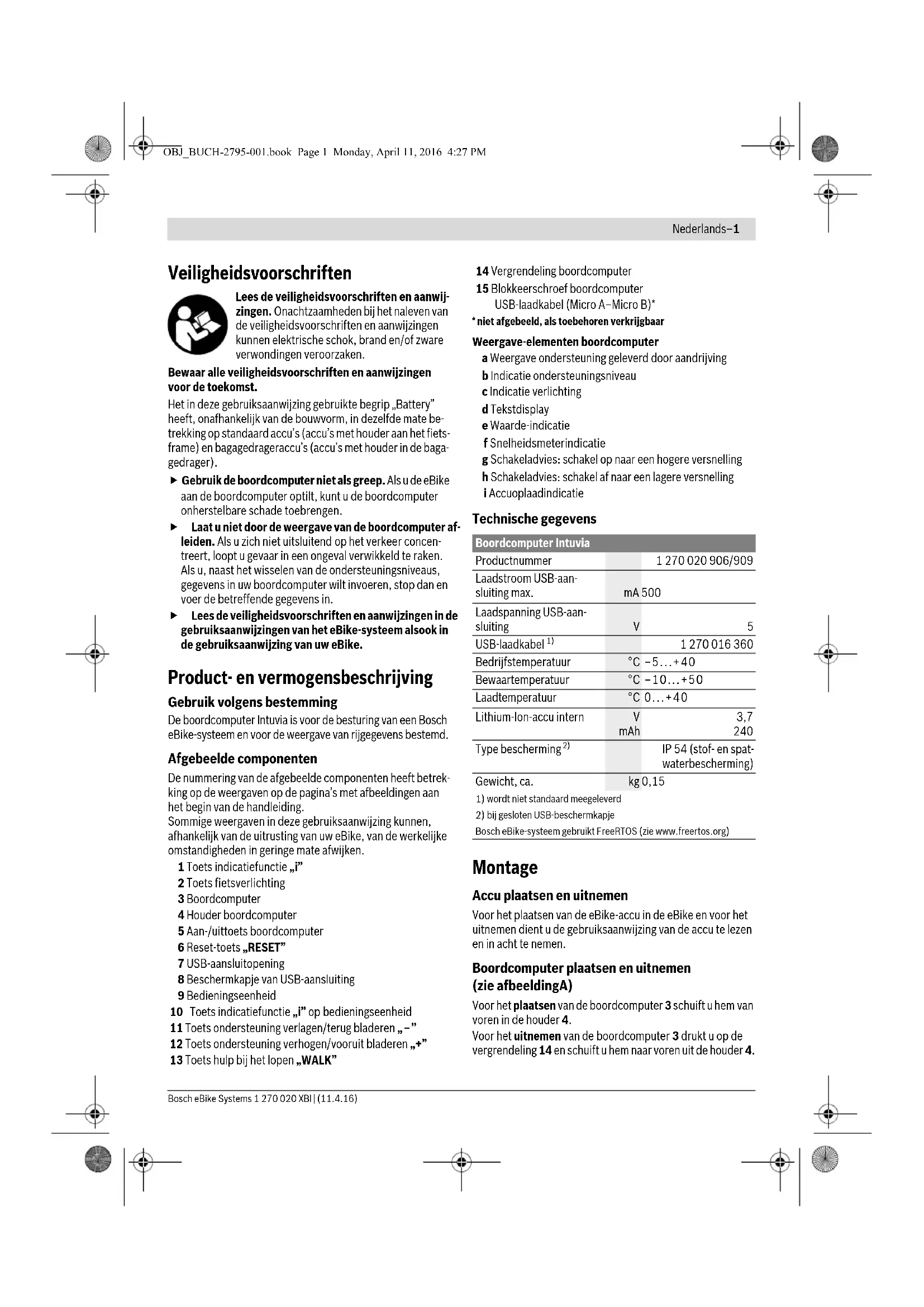 Softwareversiefout Neem contact op met uw Bosch eBike-dealer zodat hij de Software- update uitvoert. 7xx Versnellingsfout Gelieve de gebruiksaanwijzing van de fabrikant van de versnelling in acht te nemen. Geen indicatie Interne fout van de boordcomputer Herstart uw eBike-systeem door het uit- en opnieuw inschakelen. Code Oorzaak Oplossing OBJ_BUCH-2795-001.book Page 8 Monday, April 11, 2016 4:27 PMNederlands–9 Bosch eBike Systems 1 270 020 XBI | (11.4.16) Klantenservice en gebruiksadviezen Neem bij alle vragen over het eBike-systeem en zijn compo- nenten contact op met een erkende rijwielhandel. Contactgegevens van de erkende rijwielhandel vindt u op de internetpagina www.bosch-ebike.com Vervoer Wanneer u uw eBike buiten uw auto, bijv. op een fiets- drager, meeneemt, verwijder dan de boordcomputer en de eBike-accu om beschadigingen te vermijden. (Boordcomputers die niet op een houder gestoken kunnen worden, kunnen niet van de fiets genomen worden. In dit geval kan de boordcomputer op de fiets blijven.) De accu’s vallen onder de vereisten van het recht i.v.m. ge- vaarlijke goederen. Onbeschadigde accu’s kunnen door de privégebruiker zonder verdere verplichtingen over de weg ge- transporteerd worden. Bij het transport door professionele gebruikers of bij het transport door derden (bijv. luchttransport of transportbe- drijf) moeten specifieke vereisten aan verpakking en aandui- ding in acht genomen worden (bijv. voorschriften van de ADR). Indien nodig kan bij de voorbereiding van het verzend- stuk het advies van een expert voor gevaarlijke goederen in- gewonnen worden. Neem bij alle vragen over het vervoer van de accu’s contact op met een erkende rijwielhandel. Bij de rijwielhandel kunt u ook een geschikte transportverpakking bestellen. Afvalverwijdering Aandrijfeenheid, boordcomputer incl. bedienings- eenheid, accu, snelheidssensor, toebehoren en ver- pakkingen moeten op een milieuvriendelijke manier afgevoerd worden. Gooi een eBike of componenten daarvan niet bij het huisvuil! Alleen voor landen van de EU: Volgens de Europese richtlijn 2012/19/EU moe- ten niet meer bruikbare elektrische apparaten en volgens de Europese richtlijn 2006/66/EG moeten defecte of lege accu’s en batterijen apart worden ingezameld en op een voor het milieu verantwoorde wijze worden gerecycled. De in de boordcomputer geïntegreerde accu mag alleen uitge- nomen worden om af te voeren. Door het openen van de behui- zingsschakelaar kan de boordcomputer vernietigd worden. Gelieve niet meer bruikbare accu’s en boordcomputers bij een geautoriseerde fietsenhandelaar af te geven. Li-ion: Lees de aanwijzingen in het gedeelte „Vervoer”, pagina Nederlands–9 en neem deze in acht. Wijzigingen voorbehouden. OBJ_BUCH-2795-001.book Page 9 Monday, April 11, 2016 4:27 PMDansk–1 1 270 020 XBI | (11.4.16) Bosch eBike Systems Sikkerhedsinstrukser Læs alle sikkerhedsinstrukser og anvisnin- ger. Forsømmelser ved overholdelsen af sik- kerhedsinstrukser og anvisninger kan forårsa- ge elektrisk stød, brand og/eller alvorlige kvæstelser. Opbevar alle sikkerhedsinstrukser og anvisninger til fremtidig brug. Det i brugsanvisningen anvendte begreb „akku“ vedrører, uaf- hængigt af konstruktionen, både standard-akkuer (akkuer med holder på cyklens stel) og bagagebærer-akkuer (akkuer med holder i bagagebæreren). Brug ikke cykelcomputeren som håndtag. Hvis du løfter eBiken i cykelcomputeren, kan du beskadige cykelcompu- teren irreparabelt. Lad dig ikke aflede af visningen på cykelcomputeren. Hvis du ikke koncentrerer dig 100 % om trafikken, risikerer du at blive involveret i en ulykke. Hvis du ønsker at foretage indtastninger i din cykelcomputer ud over understøtnings- niveauet, skal du standse og indtaste de pågældende data. Læs og overhold sikkerhedsanvisningerne og instrukti- onerne i alle brugsanvisninger til eBike-systemet og i brugsanvisningen til din eBike. Beskrivelse af produkt og ydelse Beregnet anvendelse CykelcomputerenIntuvia er beregnet til styring af et Bosch eBike-system samt visning af køredata. Illustrerede komponenter Nummereringen af de afbildede komponenter vedrører illu- strationerne på grafiksiderne i begyndelsen af vejledningen. Enkelte billeder i denne brugsanvisning kan, afhængigt af din eBikes udstyr, afvige en smule fra de faktiske forhold. 1 Taste indikatorfunktion „i“ 2 Tast til cykelbelysning 3 Cykelcomputer 4 Holder til cykelcomputer 5 Tænd/sluk-tast cykelcomputer 6 Reset-taste „RESET“ 7 USB-bøsning 8 Beskyttelseskappe til USB-bøsning 9 Betjeningsenhed 10 Taste visefunktion „i“ på betjeningsenheden 11 Taste sænk understøtning/blad nedad „–“ 12 Taste forøg understøtning/blad opad „+“ 13 Taste skubbehjælp „WALK“ 14 Låsning cykelcomputer 15 Blokeringsskrue cykelcomputer USB-ladekabel (Micro A–Micro B)*
