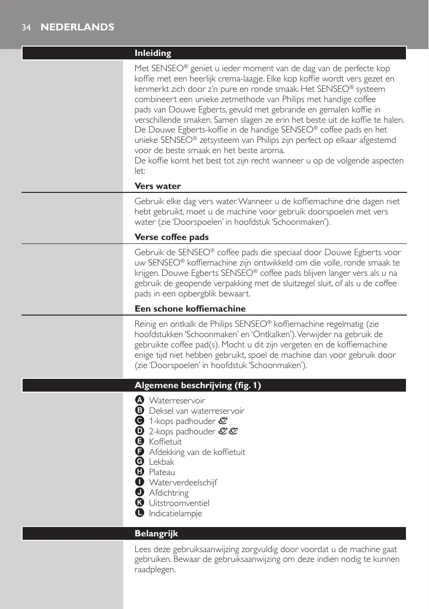 Nederlands Inleiding Met SENSEO® geniet u ieder moment van de dag van de perfecte kop koffie met een heerlijk crema-laagje. Elke kop koffie wordt vers gezet en kenmerkt zich door z’n pure en ronde smaak. Het SENSEO® systeem combineert een unieke zetmethode van Philips met handige coffee pads van Douwe Egberts, gevuld met gebrande en gemalen koffie in verschillende smaken. Samen slagen ze erin het beste uit de koffie te halen. De Douwe Egberts-koffie in de handige SENSEO® coffee pads en het unieke SENSEO® zetsysteem van Philips zijn perfect op elkaar afgestemd voor de beste smaak en het beste aroma. De koffie komt het best tot zijn recht wanneer u op de volgende aspecten let: Vers water Gebruik elke dag vers water. Wanneer u de koffiemachine drie dagen niet hebt gebruikt, moet u de machine voor gebruik doorspoelen met vers water (zie ‘Doorspoelen’ in hoofdstuk ‘Schoonmaken’). Verse coffee pads Gebruik de SENSEO® coffee pads die speciaal door Douwe Egberts voor uw SENSEO® koffiemachine zijn ontwikkeld om die volle, ronde smaak te krijgen. Douwe Egberts SENSEO® coffee pads blijven langer vers als u na gebruik de geopende verpakking met de sluitzegel sluit, of als u de coffee pads in een opbergblik bewaart. Een schone koffiemachine Reinig en ontkalk de Philips SENSEO® koffiemachine regelmatig (zie hoofdstukken ‘Schoonmaken’ en ‘Ontkalken’). Verwijder na gebruik de gebruikte coffee pad(s). Mocht u dit zijn vergeten en de koffiemachine enige tijd niet hebben gebruikt, spoel de machine dan voor gebruik door (zie ‘Doorspoelen’ in hoofdstuk ‘Schoonmaken’). Algemene beschrijving (fig. 1)
