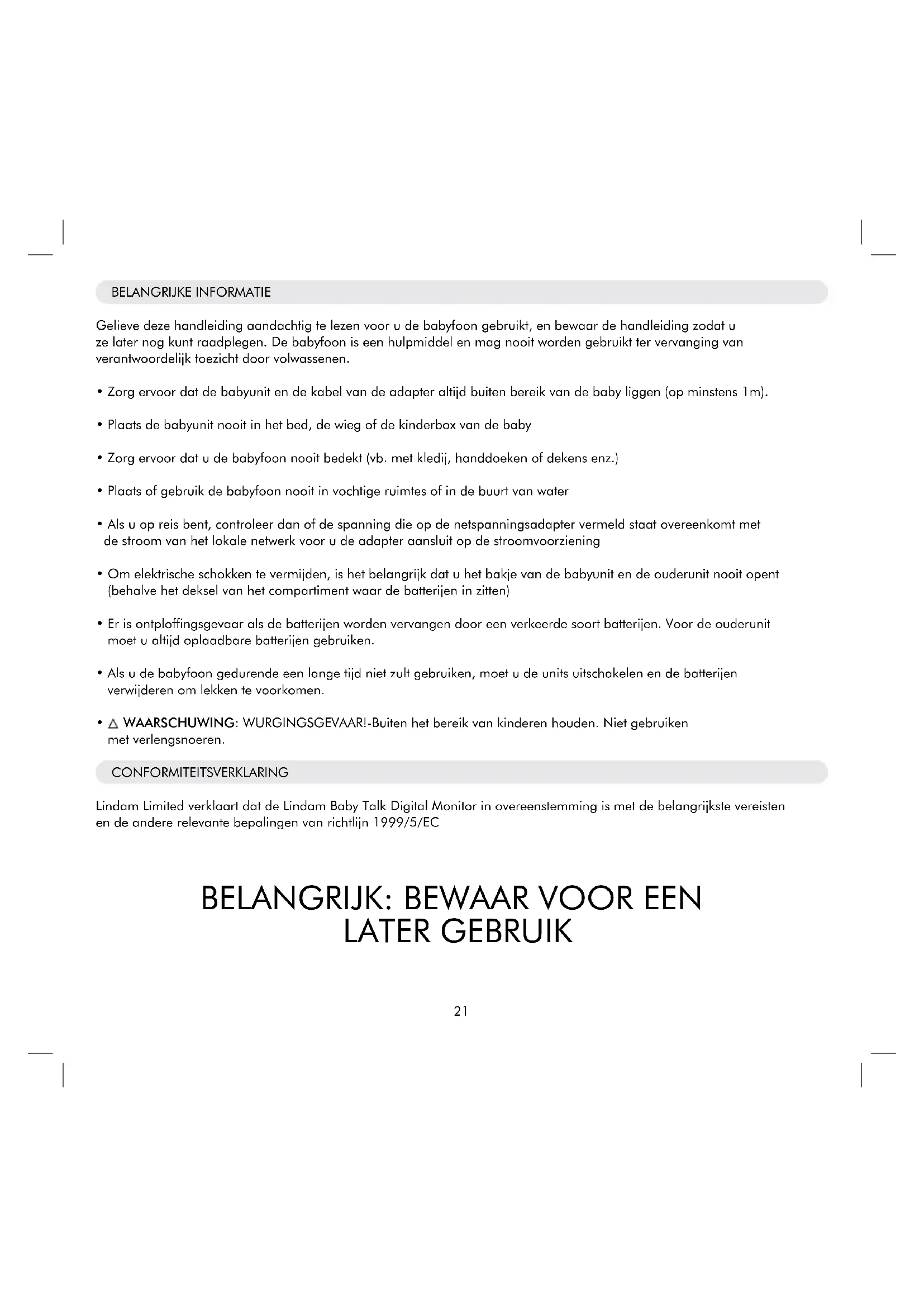 Lindam Limited verklaart dat de Lindam Baby Talk Digital Monitor in overeenstemming is met de belangrijkke vereisten en de andere relevante bepalingen van richtlijn 1999/5/EC