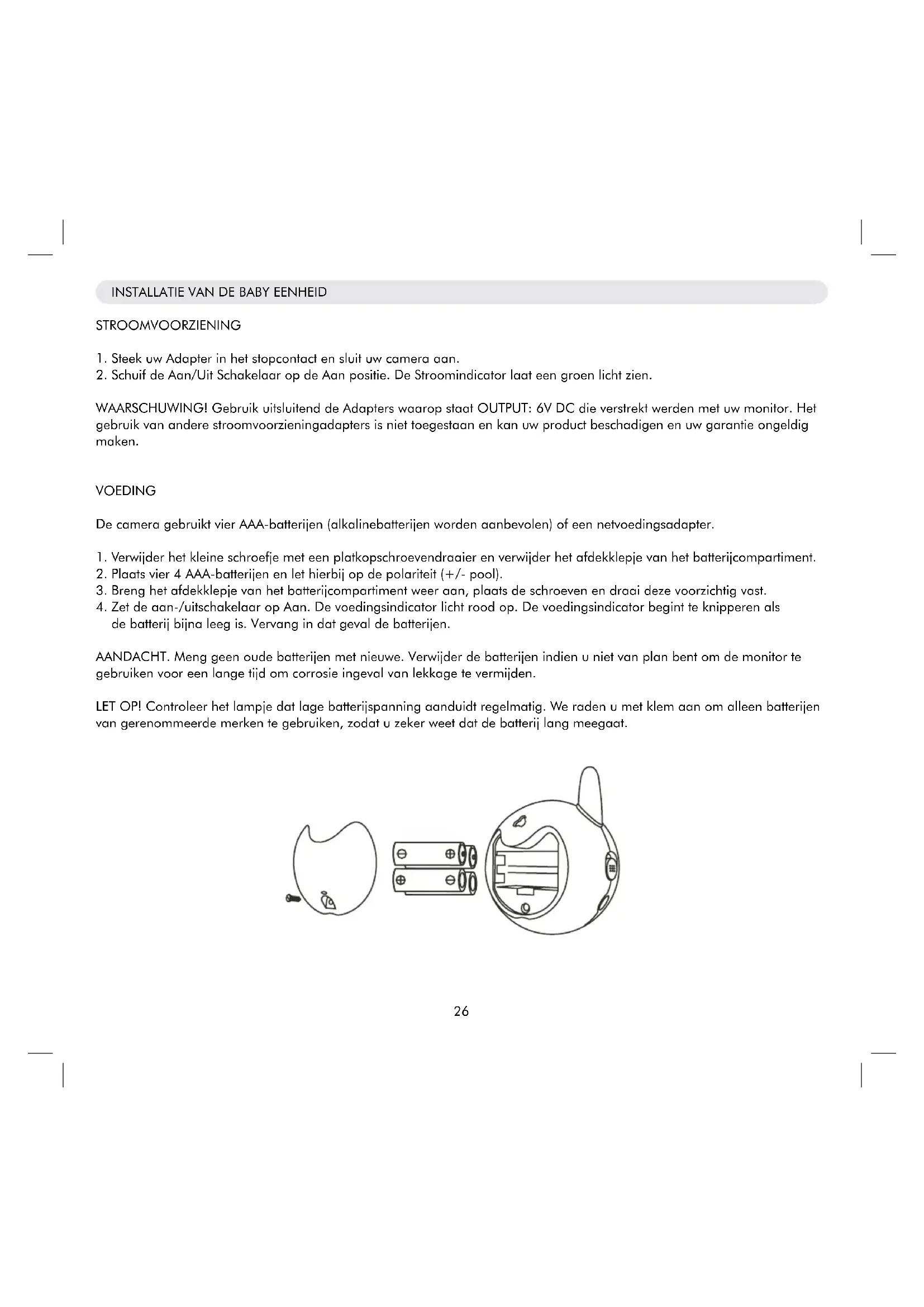 WAARSCHUWING! Gebruik uitsluitend de Adapters waarop staat OUTPUT: 6V DC die met uw monitor werden geleverd. Het gebruik van andere Stroomvoorzieningadapters is Niet toegestaan en kan uw product beschaden en za uw garantie ongelidig maken.