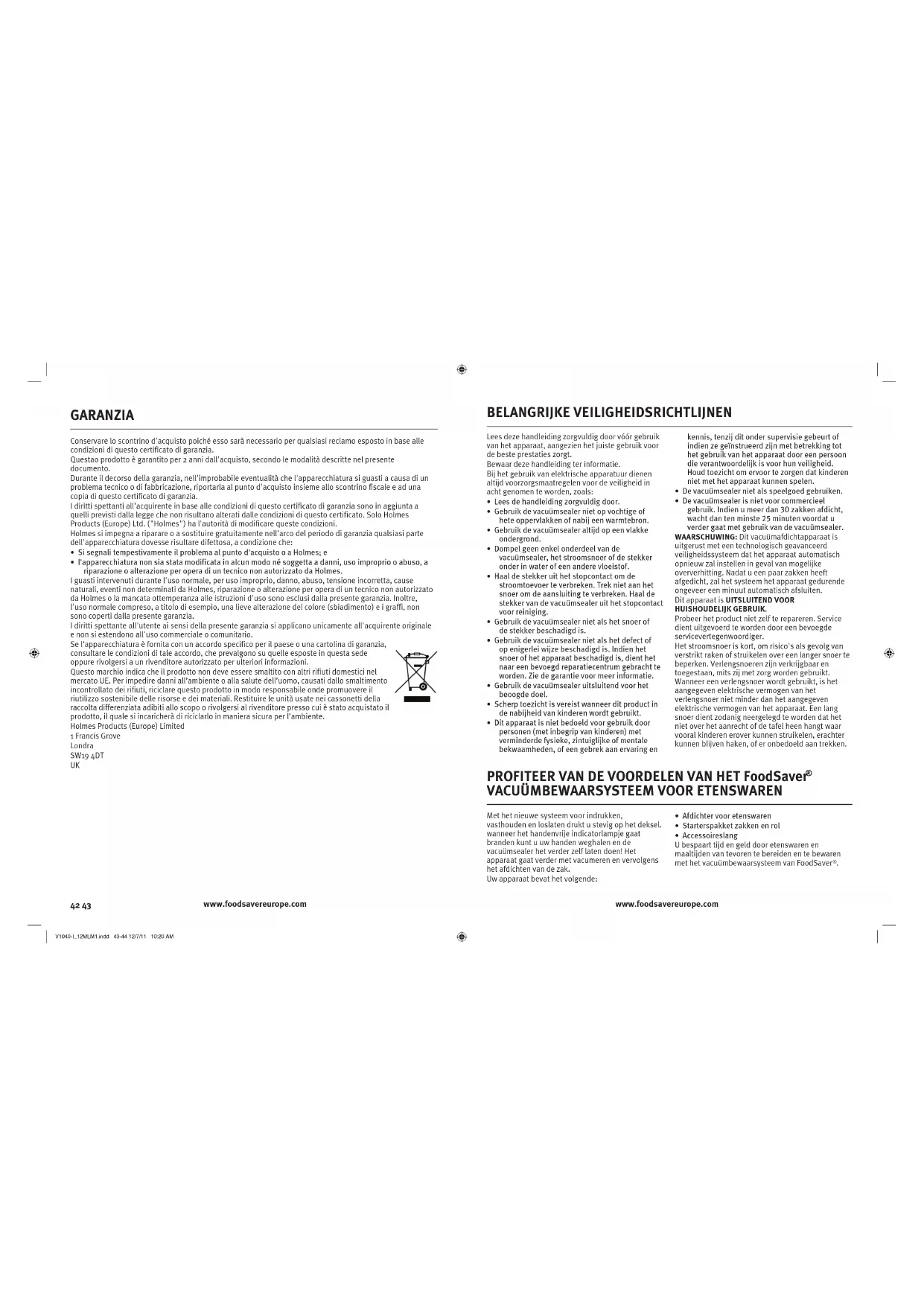 - het apparaat niet gewijzigd, beschadigd, onjuist gebruikt, misbruikt of gerepareerd is door een persoon die daartoe niet door Holmes is gemachtigd. Defecten veroorzaakt door onjuist gebruik, beschadiging, misbruik, gebruik met een onjuiste netspanning, natuurrampen, gebeurtenissen waarop Holmes geen invloed heeft, reparatie of wijziging door een persoon die daartoe niet door Holmes is gemachtigd of het niet naleven van de handleiding, worden niet door deze garantie gedekt. Verder wordt gewone slijtage, met inbegrip van maar niet beperkt tot geringe verkleuring en krassen, niet door deze garantie gedekt. Ook worden eventuele frankeer -/ verzendkosten niet gedekt door deze garantiebepaling. De rechten onder deze garantie gelden alleen voor de oorspronkelijke aankoper en zijn niet van toepassing op commercieel of gemeenschappelijk gebruik. Als u bij uw apparaat een landspecifieke garantie hebt ontvangen, raadpleegt u de bepalingen van die landspecifieke garantie in plaats van deze garantie of neemt u voor meer informatie contact op met uw plaatselijke gemachtigde dealer. Elektrische afvalproducten mogen niet samen met huishoudelijk afval worden weggeworpen. Recycleer deze producten op de voorgeschreven wijze. Stuur ons een e-mail op enquiriesEurope@jardencs.com voor verdere informatie over recyclage en de AEEA-richtlijn. Holmes Products (Europe) Limited 1 Francis Grove London SW19 4DTUK GARANTIE BÖRJA NJUTA AV FÖRDELARNA MED DITT FoodSaver