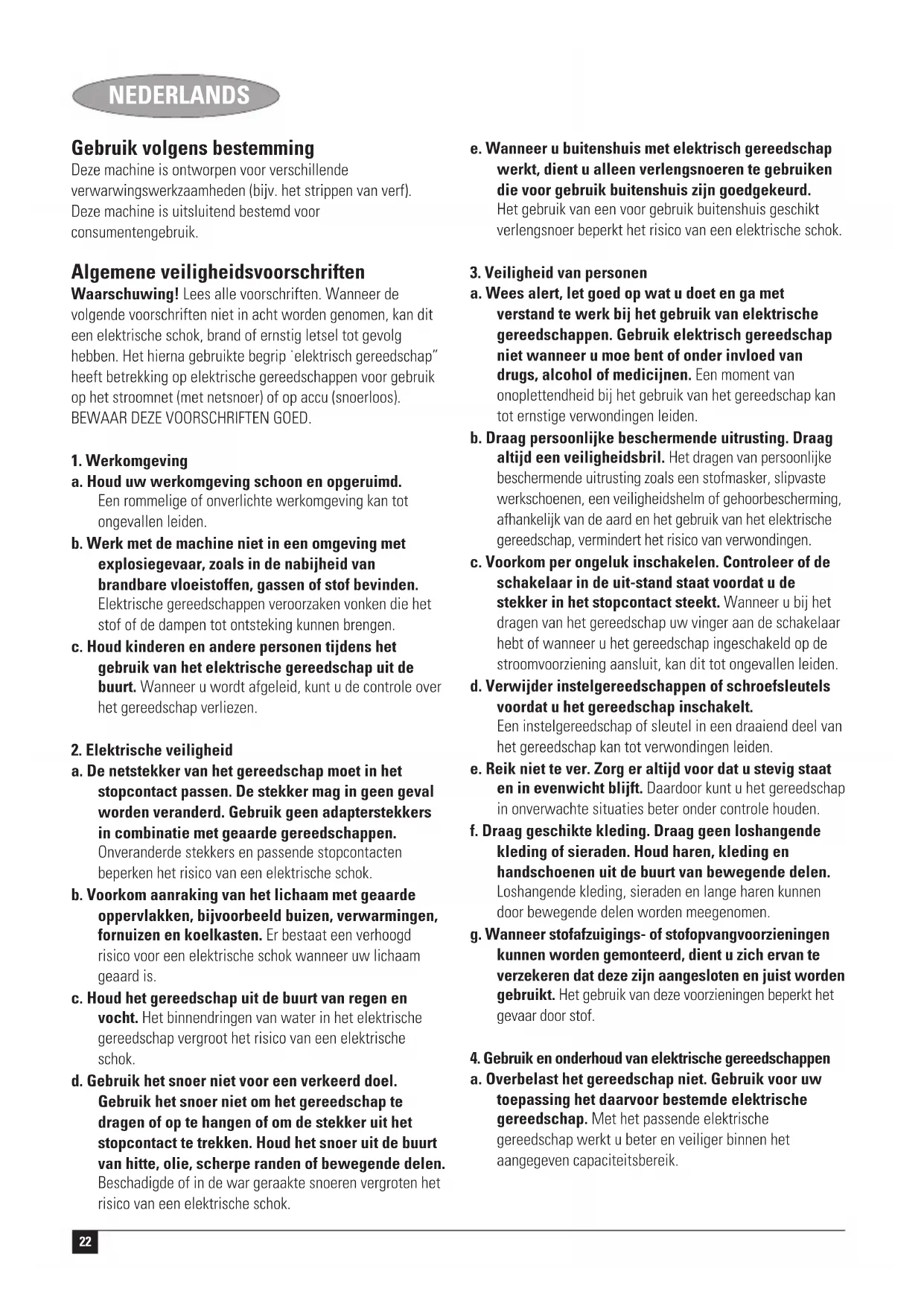 g. Gebruik elektrische gereedschappen, toebehoren, inzetgereedschappen en dergelijkke volgens deze aanwijzingen en zoals voor dit speciale gereedschapstyle voorgeschreven.Let waar bij op de arbeidsomstandigheden en de uit te voeren werkzaamheden. Het gebruik van elektrische gereedschappen voor andere dan de Voorziene toepassingen kan tot gevaarlijke situatuies leiden.