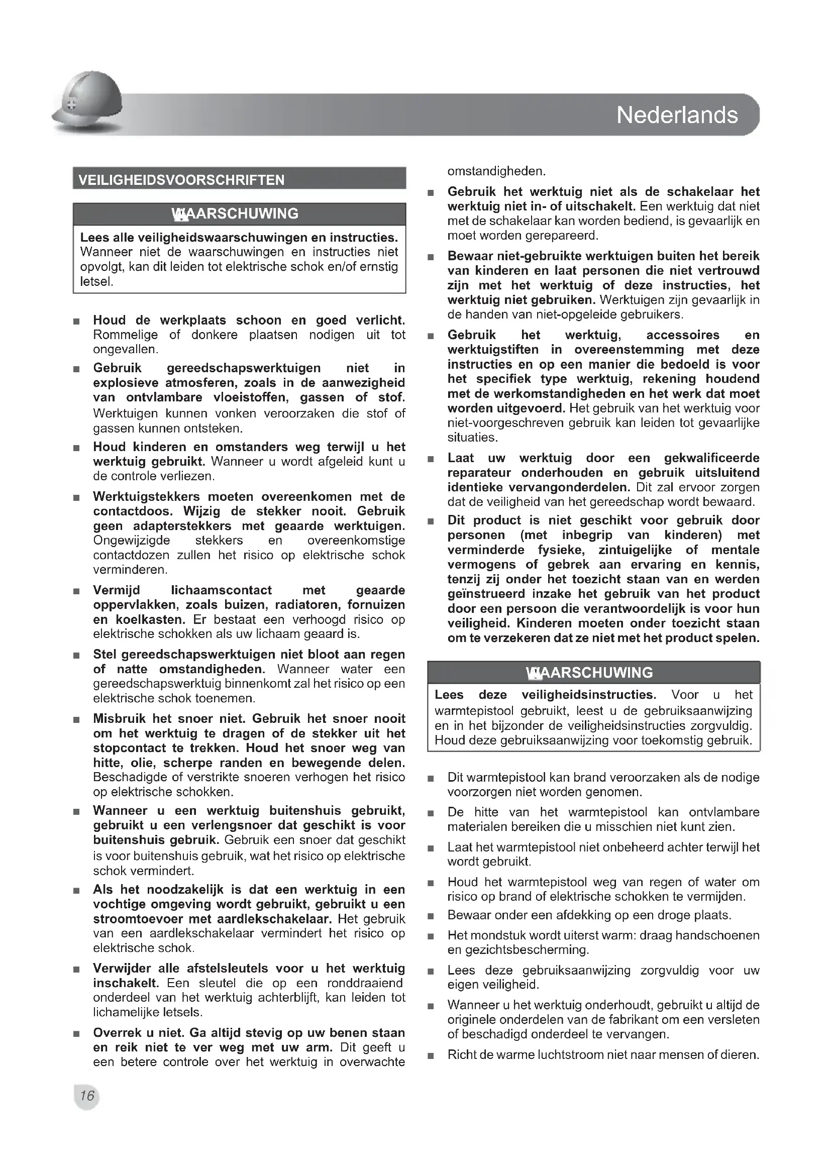 Wanneer u het warmtepistol gebruikt, draagt u geen losse kledij of jewelen, draagt u antislipschoenen en een haarnet om uwaar te beschemen en samen te honden.