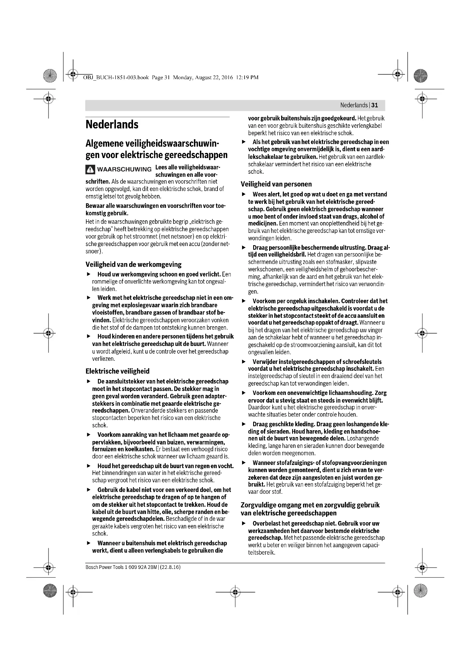 Scopo dell’operazione Figura Osservare Pagina OBJ_BUCH-1851-003.book Page 30 Monday, August 22, 2016 12:19 PMNederlands | 31 Bosch Power Tools 1 609 92A 2BM | (22.8.16) Nederlands Algemene veiligheidswaarschuwin- gen voor elektrische gereedschappen Lees alle veiligheidswaar- schuwingen en alle voor- schriften. Als de waarschuwingen en voorschriften niet worden opgevolgd, kan dit een elektrische schok, brand of ernstig letsel tot gevolg hebben. Bewaar alle waarschuwingen en voorschriften voor toe- komstig gebruik. Het in de waarschuwingen gebruikte begrip „elektrisch ge- reedschap” heeft betrekking op elektrische gereedschappen voor gebruik op het stroomnet (met netsnoer) en op elektri- sche gereedschappen voor gebruik met een accu (zonder net- snoer). Veiligheid van de werkomgeving Houd uw werkomgeving schoon en goed verlicht. Een rommelige of onverlichte werkomgeving kan tot ongeval- len leiden. Werk met het elektrische gereedschap niet in een om- geving met explosiegevaar waarin zich brandbare vloeistoffen, brandbare gassen of brandbaar stof be- vinden. Elektrische gereedschappen veroorzaken vonken die het stof of de dampen tot ontsteking kunnen brengen. Houd kinderen en andere personen tijdens het gebruik van het elektrische gereedschap uit de buurt. Wanneer u wordt afgeleid, kunt u de controle over het gereedschap verliezen. Elektrische veiligheid De aansluitstekker van het elektrische gereedschap moet in het stopcontact passen. De stekker mag in geen geval worden veranderd. Gebruik geen adapter- stekkers in combinatie met geaarde elektrische ge- reedschappen. Onveranderde stekkers en passende stopcontacten beperken het risico van een elektrische schok. Voorkom aanraking van het lichaam met geaarde op- pervlakken, bijvoorbeeld van buizen, verwarmingen, fornuizen en koelkasten. Er bestaat een verhoogd risico door een elektrische schok wanneer uw lichaam geaard is. Houd het gereedschap uit de buurt van regen en vocht. Het binnendringen van water in het elektrische gereed- schap vergroot het risico van een elektrische schok. Gebruik de kabel niet voor een verkeerd doel, om het elektrische gereedschap te dragen of op te hangen of om de stekker uit het stopcontact te trekken. Houd de kabel uit de buurt van hitte, olie, scherpe randen en be- wegende gereedschapdelen. Beschadigde of in de war geraakte kabels vergroten het risico van een elektrische schok. Wanneer u buitenshuis met elektrisch gereedschap werkt, dient u alleen verlengkabels te gebruiken die voor gebruik buitenshuis zijn goedgekeurd. Het gebruik van een voor gebruik buitenshuis geschikte verlengkabel beperkt het risico van een elektrische schok. Als het gebruik van het elektrische gereedschap in een vochtige omgeving onvermijdelijk is, dient u een aard- lekschakelaar te gebruiken. Het gebruik van een aardlek- schakelaar vermindert het risico van een elektrische schok. Veiligheid van personen Wees alert, let goed op wat u doet en ga met verstand te werk bij het gebruik van het elektrische gereed- schap. Gebruik geen elektrisch gereedschap wanneer u moe bent of onder invloed staat van drugs, alcohol of medicijnen. Een moment van onoplettendheid bij het ge- bruik van het elektrische gereedschap kan tot ernstige ver- wondingen leiden. Draag persoonlijke beschermende uitrusting. Draag al- tijd een veiligheidsbril. Het dragen van persoonlijke be- schermende uitrusting zoals een stofmasker, slipvaste werkschoenen, een veiligheidshelm of gehoorbescher- ming, afhankelijk van de aard en het gebruik van het elek- trische gereedschap, vermindert het risico van verwondin- gen. Voorkom per ongeluk inschakelen. Controleer dat het elektrische gereedschap uitgeschakeld is voordat u de stekker in het stopcontact steekt of de accu aansluit en voordat u het gereedschap oppakt of draagt. Wanneer u bij het dragen van het elektrische gereedschap uw vinger aan de schakelaar hebt of wanneer u het gereedschap in- geschakeld op de stroomvoorziening aansluit, kan dit tot ongevallen leiden. Verwijder instelgereedschappen of schroefsleutels voordat u het elektrische gereedschap inschakelt. Een instelgereedschap of sleutel in een draaiend deel van het gereedschap kan tot verwondingen leiden. Voorkom een onevenwichtige lichaamshouding. Zorg ervoor dat u stevig staat en steeds in evenwicht blijft. Daardoor kunt u het elektrische gereedschap in onver- wachte situaties beter onder controle houden. Draag geschikte kleding. Draag geen loshangende kle- ding of sieraden. Houd haren, kleding en handschoe- nen uit de buurt van bewegende delen. Loshangende kleding, lange haren en sieraden kunnen door bewegende delen worden meegenomen. Wanneer stofafzuigings- of stofopvangvoorzieningen kunnen worden gemonteerd, dient u zich ervan te ver- zekeren dat deze zijn aangesloten en juist worden ge- bruikt. Het gebruik van een stofafzuiging beperkt het ge- vaar door stof. Zorgvuldige omgang met en zorgvuldig gebruik van elektrische gereedschappen Overbelast het gereedschap niet. Gebruik voor uw werkzaamheden het daarvoor bestemde elektrische gereedschap. Met het passende elektrische gereedschap werkt u beter en veiliger binnen het aangegeven capaci- teitsbereik. WAARSCHUWING OBJ_BUCH-1851-003.book Page 31 Monday, August 22, 2016 12:19 PM32 | Nederlands 1 609 92A 2BM | (22.8.16) Bosch Power Tools Gebruik geen elektrisch gereedschap waarvan de schakelaar defect is. Elektrisch gereedschap dat niet meer kan worden in- of uitgeschakeld, is gevaarlijk en moet worden gerepareerd. Trek de stekker uit het stopcontact of neem de accu uit het elektrische gereedschap voordat u het gereed- schap instelt, toebehoren wisselt of het gereedschap weglegt. Deze voorzorgsmaatregel voorkomt onbedoeld starten van het elektrische gereedschap. Bewaar niet-gebruikte elektrische gereedschappen buiten bereik van kinderen. Laat het gereedschap niet gebruiken door personen die er niet mee vertrouwd zijn en deze aanwijzingen niet hebben gelezen. Elektri- sche gereedschappen zijn gevaarlijk wanneer dez