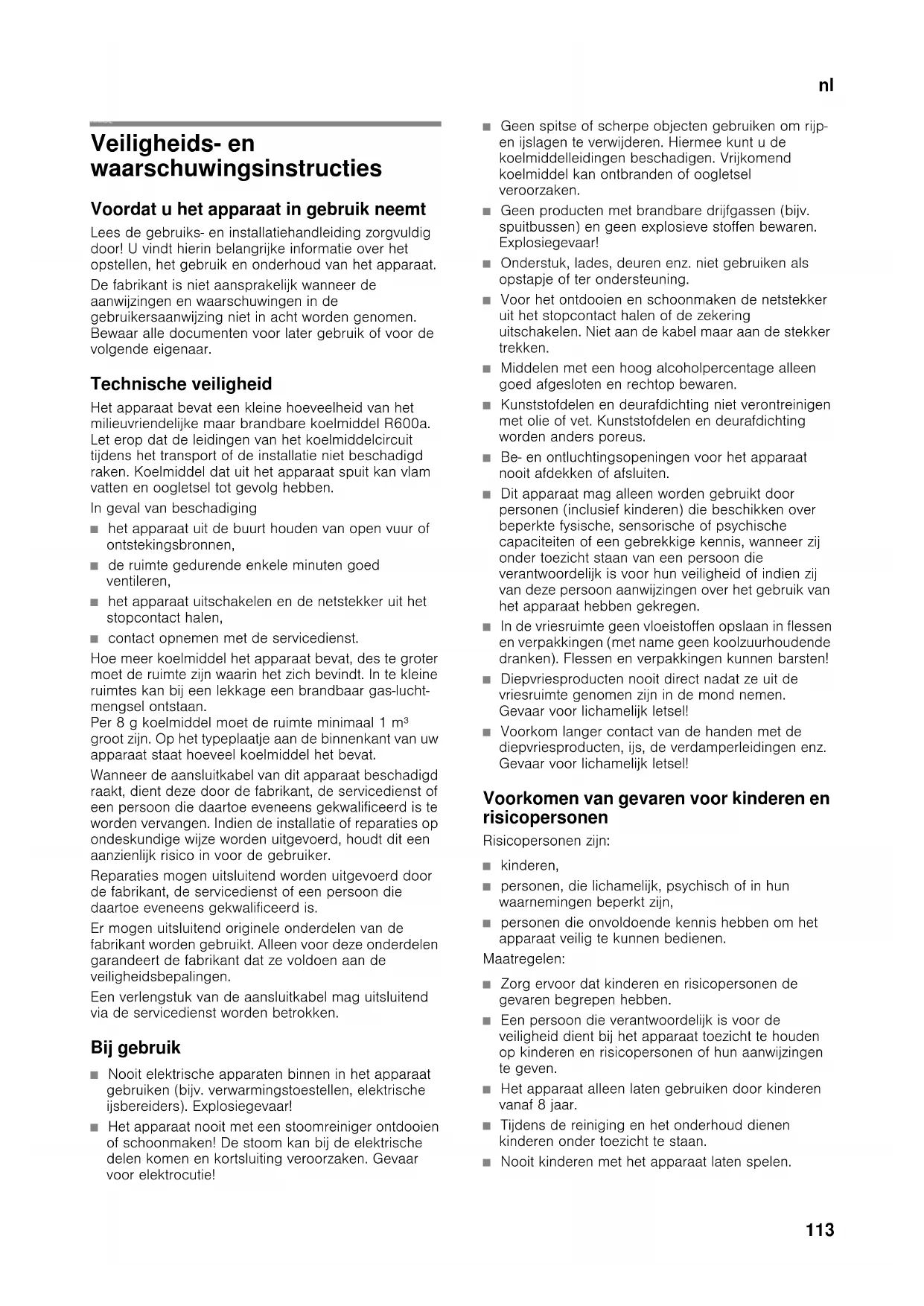 nlInhoudsopgave nlGebruikersaanwijzing Veiligheids- en waarschuwingsinstructies Voordat u het apparaat in gebruik neemt Lees de gebruiks- en installatiehandleiding zorgvuldig door! U vindt hierin belangrijke informatie over het opstellen, het gebruik en onderhoud van het apparaat. De fabrikant is niet aansprakelijk wanneer de aanwijzingen en waarschuwingen in de gebruikersaanwijzing niet in acht worden genomen. Bewaar alle documenten voor later gebruik of voor de volgende eigenaar. Technische veiligheid Het apparaat bevat een kleine hoeveelheid van het milieuvriendelijke maar brandbare koelmiddel R600a. Let erop dat de leidingen van het koelmiddelcircuit tijdens het transport of de installatie niet beschadigd raken. Koelmiddel dat uit het apparaat spuit kan vlam vatten en oogletsel tot gevolg hebben. In geval van beschadiging ■ het apparaat uit de buurt houden van open vuur of ontstekingsbronnen, ■ de ruimte gedurende enkele minuten goed ventileren, ■ het apparaat uitschakelen en de netstekker uit het stopcontact halen, ■ contact opnemen met de servicedienst. Hoe meer koelmiddel het apparaat bevat, des te groter moet de ruimte zijn waarin het zich bevindt. In te kleine ruimtes kan bij een lekkage een brandbaar gas-lucht- mengsel ontstaan. Per 8 g koelmiddel moet de ruimte minimaal 1 m³ groot zijn. Op het typeplaatje aan de binnenkant van uw apparaat staat hoeveel koelmiddel het bevat. Wanneer de aansluitkabel van dit apparaat beschadigd raakt, dient deze door de fabrikant, de servicedienst of een persoon die daartoe eveneens gekwalificeerd is te worden vervangen. Indien de installatie of reparaties op ondeskundige wijze worden uitgevoerd, houdt dit een aanzienlijk risico in voor de gebruiker. Reparaties mogen uitsluitend worden uitgevoerd door de fabrikant, de servicedienst of een persoon die daartoe eveneens gekwalificeerd is. Er mogen uitsluitend originele onderdelen van de fabrikant worden gebruikt. Alleen voor deze onderdelen garandeert de fabrikant dat ze voldoen aan de veiligheidsbepalingen. Een verlengstuk van de aansluitkabel mag uitsluitend via de servicedienst worden betrokken. Bij gebruik ■ Nooit elektrische apparaten binnen in het apparaat gebruiken (bijv. verwarmingstoestellen, elektrische ijsbereiders). Explosiegevaar! ■ Het apparaat nooit met een stoomreiniger ontdooien of schoonmaken! De stoom kan bij de elektrische delen komen en kortsluiting veroorzaken. Gevaar voor elektrocutie! ■ Geen spitse of scherpe objecten gebruiken om rijp- en ijslagen te verwijderen. Hiermee kunt u de koelmiddelleidingen beschadigen. Vrijkomend koelmiddel kan ontbranden of oogletsel veroorzaken. ■ Geen producten met brandbare drijfgassen (bijv. spuitbussen) en geen explosieve stoffen bewaren. Explosiegevaar! ■ Onderstuk, lades, deuren enz. niet gebruiken als opstapje of ter ondersteuning. ■ Voor het ontdooien en schoonmaken de netstekker uit het stopcontact halen of de zekering uitschakelen. Niet aan de kabel maar aan de stekker trekken. ■ Middelen met een hoog alcoholpercentage alleen goed afgesloten en rechtop bewaren. ■ Kunststofdelen en deurafdichting niet verontreinigen met olie of vet. Kunststofdelen en deurafdichting worden anders poreus. ■ Be- en ontluchtingsopeningen voor het apparaat nooit afdekken of afsluiten. ■ Dit apparaat mag alleen worden gebruikt door personen (inclusief kinderen) die beschikken over beperkte fysische, sensorische of psychische capaciteiten of een gebrekkige kennis, wanneer zij onder toezicht staan van een persoon die verantwoordelijk is voor hun veiligheid of indien zij van deze persoon aanwijzingen over het gebruik van het apparaat hebben gekregen. ■ In de vriesruimte geen vloeistoffen opslaan in flessen en verpakkingen (met name geen koolzuurhoudende dranken). Flessen en verpakkingen kunnen barsten! ■ Diepvriesproducten nooit direct nadat ze uit de vriesruimte genomen zijn in de mond nemen. Gevaar voor lichamelijk letsel! ■ Voorkom langer contact van de handen met de diepvriesproducten, ijs, de verdamperleidingen enz. Gevaar voor lichamelijk letsel! Voorkomen van gevaren voor kinderen en risicopersonen Risicopersonen zijn: ■ kinderen, ■ personen, die lichamelijk, psychisch of in hun waarnemingen beperkt zijn, ■ personen die onvoldoende kennis hebben om het apparaat veilig te kunnen bedienen. Maatregelen: ■ Zorg ervoor dat kinderen en risicopersonen de gevaren begrepen hebben. ■ Een persoon die verantwoordelijk is voor de veiligheid dient bij het apparaat toezicht te houden op kinderen en risicopersonen of hun aanwijzingen te geven. ■ Het apparaat alleen laten gebruiken door kinderen vanaf 8 jaar. ■ Tijdens de reiniging en het onderhoud dienen kinderen onder toezicht te staan. ■ Nooit kinderen met het apparaat laten spelen.nl