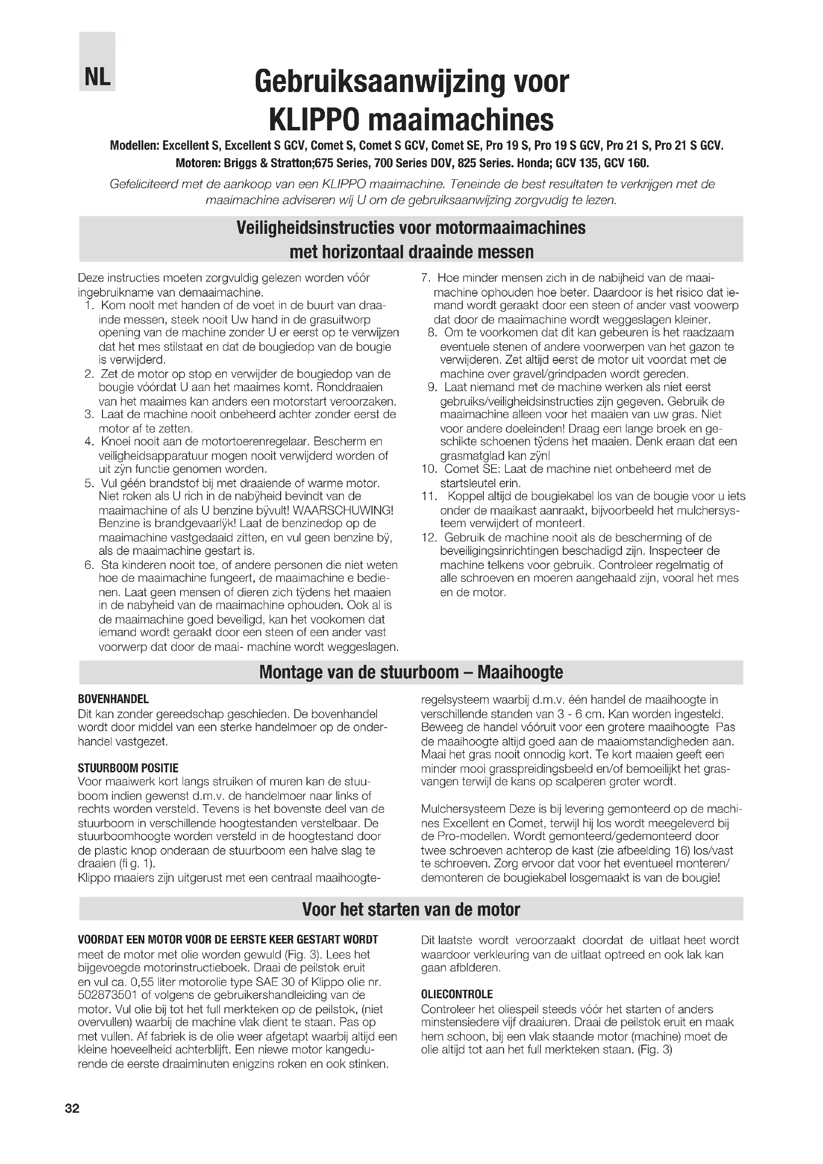 beveiligingsinrichtingen beschadigd zijn. Inspecteer de machine telkens voor gebruik. Controleer regelmatig of alle schroeven en moeren aangehaald zijn, vooral het mes en de motor. Voor het starten van de motor BOVENHANDEL Dit kan zonder gereedschap geschieden. De bovenhandel wordt door middel van een sterke handelmoer op de onder- handel vastgezet. STUURBOOM POSITIE Voor maaiwerk kort langs struiken of muren kan de stuu- boom indien gewenst d.m.v. de handelmoer naar links of rechts worden versteld. Tevens is het bovenste deel van de stuurboom in verschillende hoogtestanden verstelbaar. De stuurboomhoogte worden versteld in de hoogtestand door de plastic knop onderaan de stuurboom een halve slag te draaien (fi g. 1). Klippo maaiers zijn uitgerust met een centraal maaihoogte- regelsysteem waarbij d.m.v. één handel de maaihoogte in verschillende standen van 3 - 6 cm. Kan worden ingesteld. Beweeg de handel vóóruit voor een grotere maaihoogte Pas de maaihoogte altijd goed aan de maaiomstandigheden aan. Maai het gras nooit onnodig kort. Te kort maaien geeft een minder mooi grasspreidingsbeeld en/of bemoeilijkt het gras- vangen terwijl de kans op scalperen groter wordt. Mulchersysteem Deze is bij levering gemonteerd op de machi- nes Excellent en Comet, terwijl hij los wordt meegeleverd bij de Pro-modellen. Wordt gemonteerd/gedemonteerd door twee schroeven achterop de kast (zie afbeelding 16) los/vast te schroeven. Zorg ervoor dat voor het eventueel monteren/ demonteren de bougiekabel losgemaakt is van de bougie! VOORDAT EEN MOTOR VOOR DE EERSTE KEER GESTART WORDT meet de motor met olie worden gewuld (Fig. 3). Lees het bijgevoegde motorinstructieboek. Draai de peilstok eruit en vul ca. 0,55 liter motorolie type SAE 30 of Klippo olie nr. 502873501 of volgens de gebruikershandleiding van de motor. Vul olie bij tot het full merkteken op de peilstok, (niet overvullen) waarbij de machine vlak dient te staan. Pas op met vullen. Af fabriek is de olie weer afgetapt waarbij altijd een kleine hoeveelheid achterblijft. Een niewe motor kangedu- rende de eerste draaiminuten enigzins roken en ook stinken. Dit laatste wordt veroorzaakt doordat de uitlaat heet wordt waardoor verkleuring van de uitlaat optreed en ook lak kan gaan afblderen. OLIECONTROLE Controleer het oliespeil steeds vóór het starten of anders minstensiedere vijf draaiuren. Draai de peilstok eruit en maak hem schoon, bij een vlak staande motor (machine) moet de olie altijd tot aan het full merkteken staan. (Fig. 3) Montage van de stuurboom – Maaihoogte Veiligheidsinstructies voor motormaaimachines met horizontaal draainde messen NL33 Starten van de motor Algemene opmerkingen 825 Series-motoren