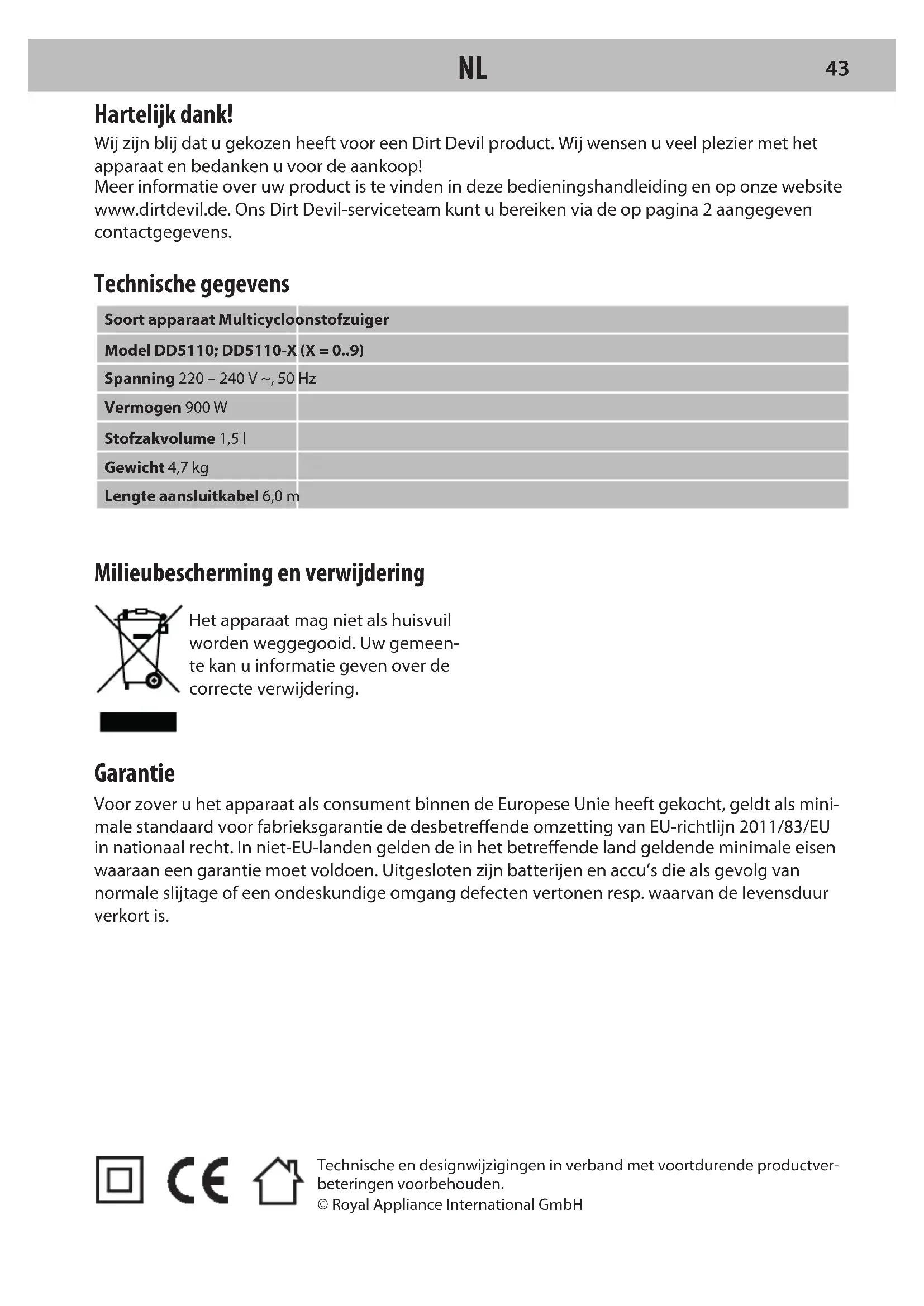 PTTechnische en designwijzigingen in verband met voortdurende productver- beteringen voorbehouden. © Royal Appliance International GmbH Hartelijk dank! Wij zijn blij dat u gekozen heeft voor een Dirt Devil product. Wij wensen u veel plezier met het apparaat en bedanken u voor de aankoop! Meer informatie over uw product is te vinden in deze bedieningshandleiding en op onze website www.dirtdevil.de. Ons Dirt Devil-serviceteam kunt u bereiken via de op pagina 2 aangegeven contactgegevens. Technische gegevens Soort apparaat Multicycloonstofzuiger Model DD5110; DD5110-X (X = 0..9) Spanning 220 – 240 V ~, 50 Hz Vermogen 900 W Stofzakvolume 1,5 l Gewicht 4,7 kg Lengte aansluitkabel 6,0 m Milieubescherming en verwijdering Het apparaat mag niet als huisvuil worden weggegooid. Uw gemeen- te kan u informatie geven over de correcte verwijdering. Garantie Voor zover u het apparaat als consument binnen de Europese Unie heeft gekocht, geldt als mini- male standaard voor fabrieksgarantie de desbetreende omzetting van EU-richtlijn 2011/83/EU in nationaal recht. In niet-EU-landen gelden de in het betreende land geldende minimale eisen waaraan een garantie moet voldoen. Uitgesloten zijn batterijen en accu’s die als gevolg van normale slijtage of een ondeskundige omgang defecten vertonen resp. waarvan de levensduur verkort is.