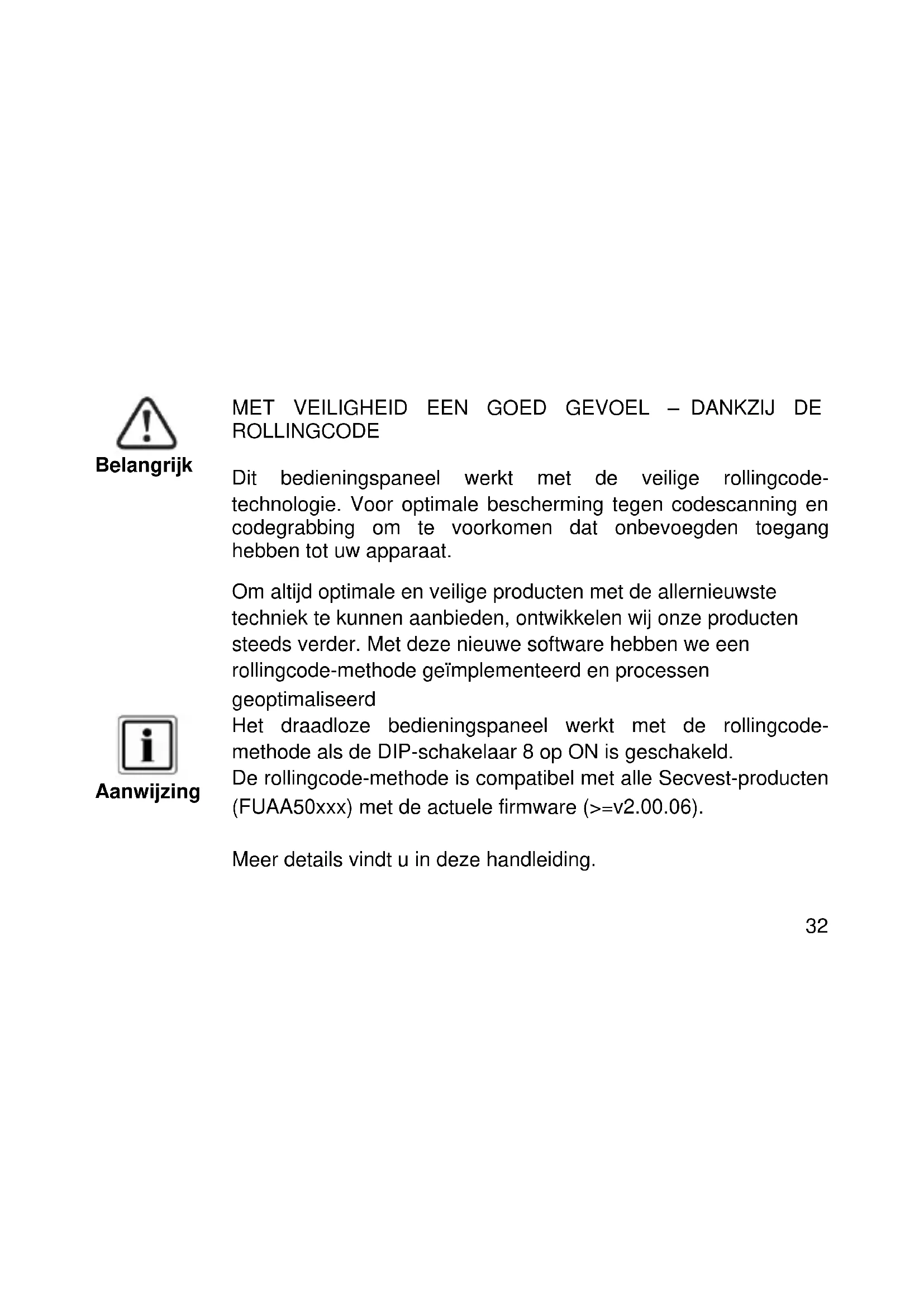 Het draadloze bedieningspaneel werkt met de rollingcodemethode als de DIP-schakelaar 8 op ON is geschakeld. De rollingcode-methode is compatibel met alle Secvest-producten (FUAA50xxx) met de actuèle firmware (>=v2.00.06) .