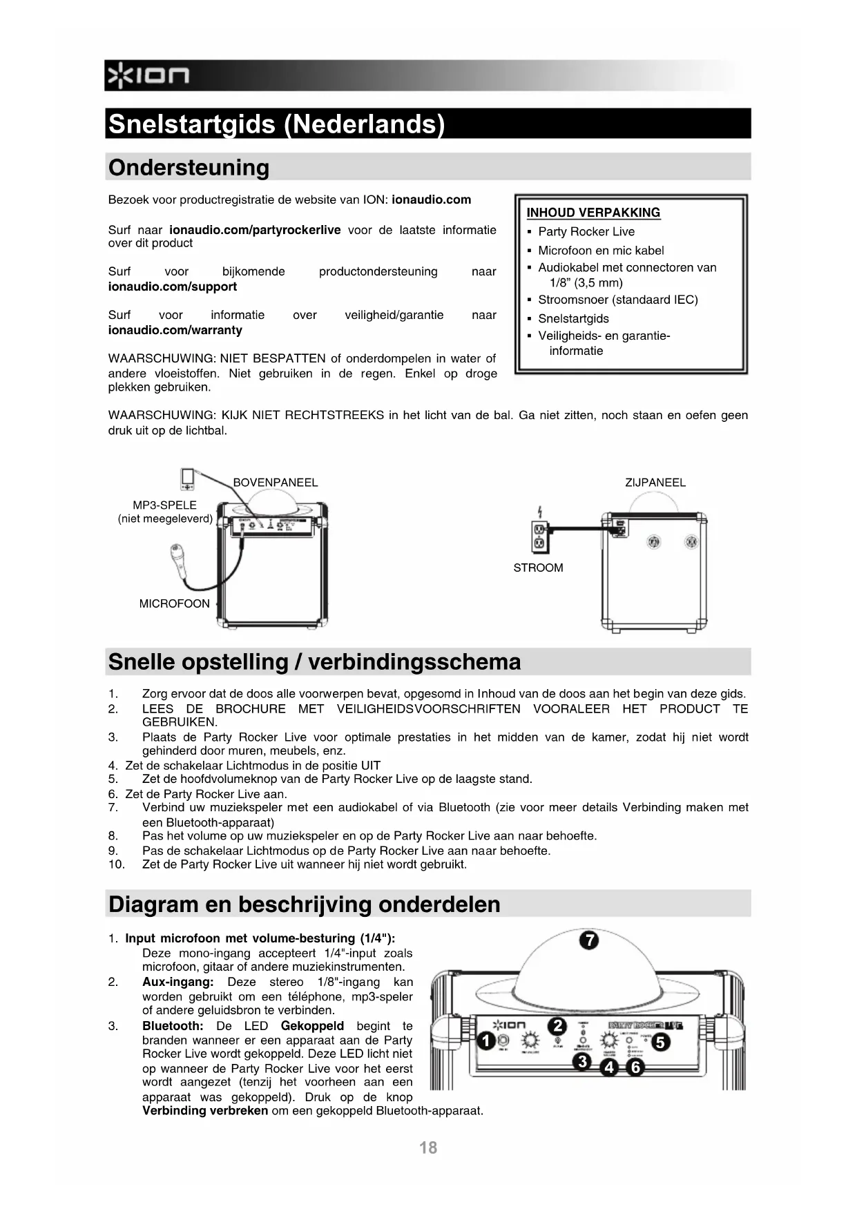 - Beat Sync vs. Auto-Modus18 Snelstartgids (Nederlands) Ondersteuning Bezoek voor productregistratie de website van ION: ionaudio.com Surf naar ionaudio.com/partyrockerlive voor de laatste informatie over dit product Surf voor bijkomende productondersteuning naar ionaudio.com/support Surf voor informatie over veiligheid/garantie naar ionaudio.com/warranty WAARSCHUWING: NIET BESPATTEN of onderdompelen in water of andere vloeistoffen. Niet gebruiken in de regen. Enkel op droge plekken gebruiken. WAARSCHUWING: KIJK NIET RECHTSTREEKS in het licht van de bal. Ga niet zitten, noch staan en oefen geen druk uit op de lichtbal.