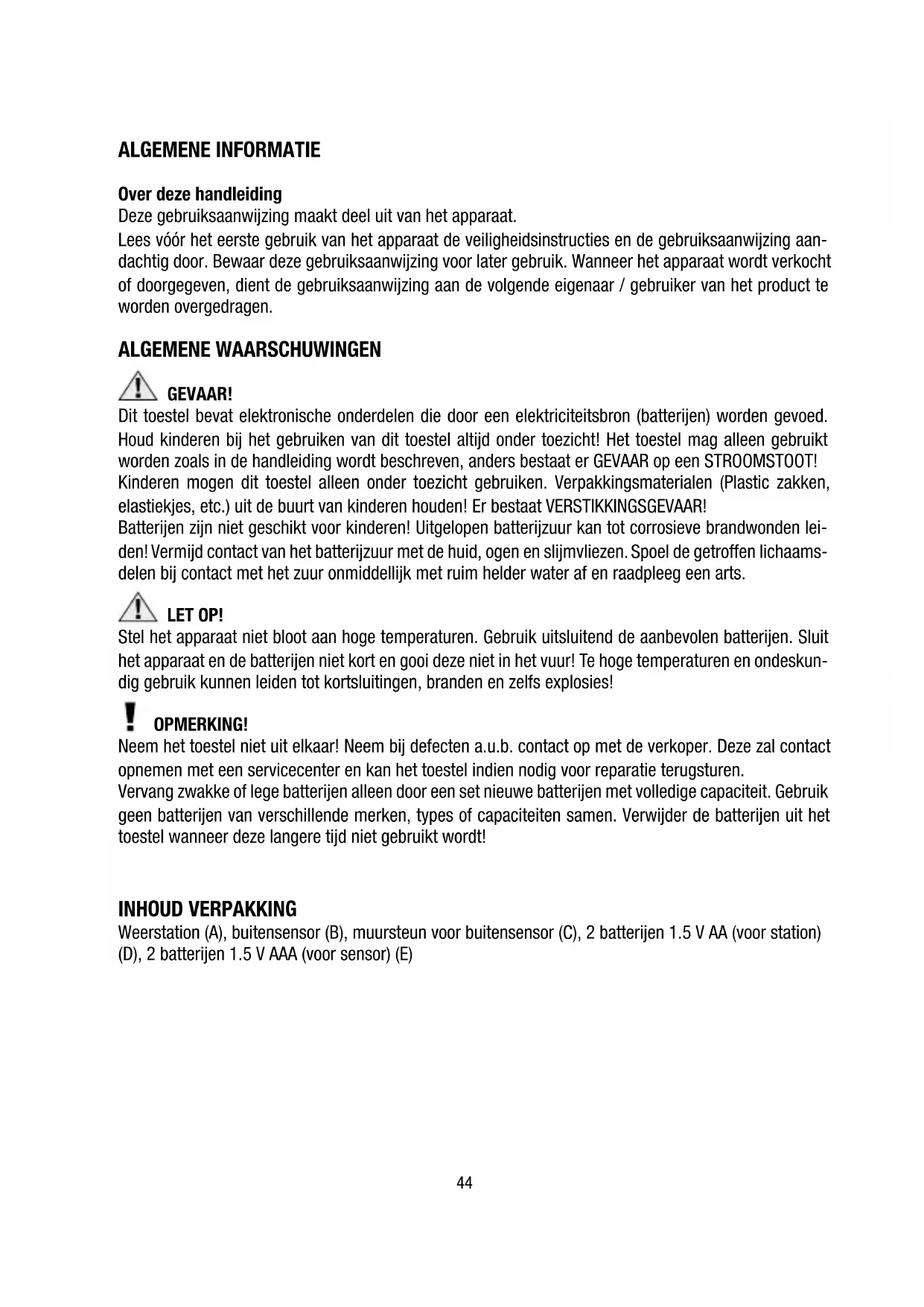 FOEHN FOEHN BISE BISE MISTRAL MISTRAL SCIROCCO SCIROCCO TRAMONTANA TRAMONTANA43 GB/IE WARRANTY & SERVICE The regular guarantee period is 2 years and begins on the day of purchase. To benefit from an extended voluntary guarantee period as stated on the gift box, registration on our website is required. You can consult the full guarantee terms as well as information on extending the guarantee period and details of our services at www.bresser.de/warranty_terms.44 ALGEMENE INFORMATIE Over deze handleiding Deze gebruiksaanwijzing maakt deel uit van het apparaat. Lees vóór het eerste gebruik van het apparaat de veiligheidsinstructies en de gebruiksaanwijzing aan- dachtig door. Bewaar deze gebruiksaanwijzing voor later gebruik. Wanneer het apparaat wordt verkocht of doorgegeven, dient de gebruiksaanwijzing aan de volgende eigenaar / gebruiker van het product te worden overgedragen. ALGEMENE WAARSCHUWINGEN GEVAAR! Dit toestel bevat elektronische onderdelen die door een elektriciteitsbron (batterijen) worden gevoed. Houd kinderen bij het gebruiken van dit toestel altijd onder toezicht! Het toestel mag alleen gebruikt worden zoals in de handleiding wordt beschreven, anders bestaat er GEVAAR op een STROOMSTOOT! Kinderen mogen dit toestel alleen onder toezicht gebruiken. Verpakkingsmaterialen (Plastic zakken, elastiekjes, etc.) uit de buurt van kinderen houden! Er bestaat VERSTIKKINGSGEVAAR! Batterijen zijn niet geschikt voor kinderen! Uitgelopen batterijzuur kan tot corrosieve brandwonden lei- den! Vermijd contact van het batterijzuur met de huid, ogen en slijmvliezen. Spoel de getroffen lichaams- delen bij contact met het zuur onmiddellijk met ruim helder water af en raadpleeg een arts. LET OP! Stel het apparaat niet bloot aan hoge temperaturen. Gebruik uitsluitend de aanbevolen batterijen. Sluit het apparaat en de batterijen niet kort en gooi deze niet in het vuur! Te hoge temperaturen en ondeskun- dig gebruik kunnen leiden tot kortsluitingen, branden en zelfs explosies! OPMERKING! Neem het toestel niet uit elkaar! Neem bij defecten a.u.b. contact op met de verkoper. Deze zal contact opnemen met een servicecenter en kan het toestel indien nodig voor reparatie terugsturen. Vervang zwakke of lege batterijen alleen door een set nieuwe batterijen met volledige capaciteit. Gebruik geen batterijen van verschillende merken, types of capaciteiten samen. Verwijder de batterijen uit het toestel wanneer deze langere tijd niet gebruikt wordt! INHOUD VERPAKKING Weerstation (A), buitensensor (B), muursteun voor buitensensor (C), 2 batterijen 1.5 V AA (voor station) (D), 2 batterijen 1.5 V AAA (voor sensor) (E)45 NL/BE WAT U VOOR HET EERSTE GEBRUIK MOET WETEN Uw Meteo-time weerstation is anders dan de meeste weerstations die alleen de belangrijkste weers- omstandigheden meten; de gegevens van dit weerstation zijn gebaseerd op METEOTIME, die iedere dag ontwikkeld wordt door professionele meteorologen met behulp van de nieuwste instrumenten. Het Meteotime-weerstation is zo opgebouwd dat het de gecodeerde METEOTIME-signalen, met alle weersinformatie, kan ontvangen. Het signaal inclusief informatie wordt uitgezonden door de DCF, een zendstation voor radiobediende uurwerken (gevestigd in Duitsland). Daarom is uw Meteotime-weer- station ook een radiobediend uurwerk met alle daarvan bekende voordelen, zoals bv. altijd exacte tijdweergave of automatisch omschakelen van winter- naar zomertijd en omgekeerd. U kunt weersvoorspellingen voor 60 meteorologische regio’s in Europa en een periode van maximaal 4 dagen (vandaag tot de dag na overmorgen) ontvangen en krijgt voorspellingen voor nog eens 30 regio’s en 2 dagen aangeboden. WAT IS ER NODIG VOOR GOEDE ONTVANGST? Net als bij de draadloze signalen van het mobiele telefoonnet of radio- en televisiezenders kan het voorkomen dat het Meteotime-weerstation de signalen niet altijd en overal kan ontvangen. Hierna geven we u een aantal tips die u in ieder geval dient op te volgen om te zorgen dat het instrument correct functioneert. De plaats waar u het Meteotime-weerstation opstelt is zeer belangrijk. Daarom is het voorzien van een innovatieve ([TEST √]-knop) waarmee u de ontvangstkwaliteit in uw omgeving kunt testen, en het instrument op die plek kunt zetten waar de omstandigheden optimaal zijn. Probeer verbinding te maken als u het Meteotime-weerstation testen zoals beschreven in de hand- leiding. Zet daarvoor alstublieft in de ruimte waar u het instrument wilt plaatsen eerst alle mogelijke storingsbronnen (bv. televisie) uit. Zet dan het Meteotime-weerstation op de plek en in de richting die u wenst, maar wel ten minste 1 meter verwijderd van mogelijke storingsbronnen. Let op de symbolen GOEDE ONTVANGST of SLECHTE ONTVANGST op de display. Laat het Mete- otime-weerstation zo staan als u de juiste plaats waar GOEDE ONTVANGST is gevonden heeft. Het zal nu binnen enkele minuten uw gegevens analyseren uit het uurwerk-radiosignaal, en de datum verschijnt. De overdracht van de veel grotere hoeveelheid gegevens van de weersvoor- spellingen voor alle regio’s en dagen kost veel meer tijd. Het kan tot 24 uur na ingebruikname duren tot de ontvangst van deze gegevens compleet is.46 MOGELIJKE STORINGSBRONNEN Met alle Meteotime-weerstations kunnen metingen worden uitgevoerd om de best mogelijke ontvangst te bereiken. DCF is een lange-golfzender met een grote reikwijdte (ongeveer 1500 km). Zoals nu eenmaal het geval is met lange-golfzenders kunnen er zich storingen voordoen, die vaak de volgende oorzaken hebben: