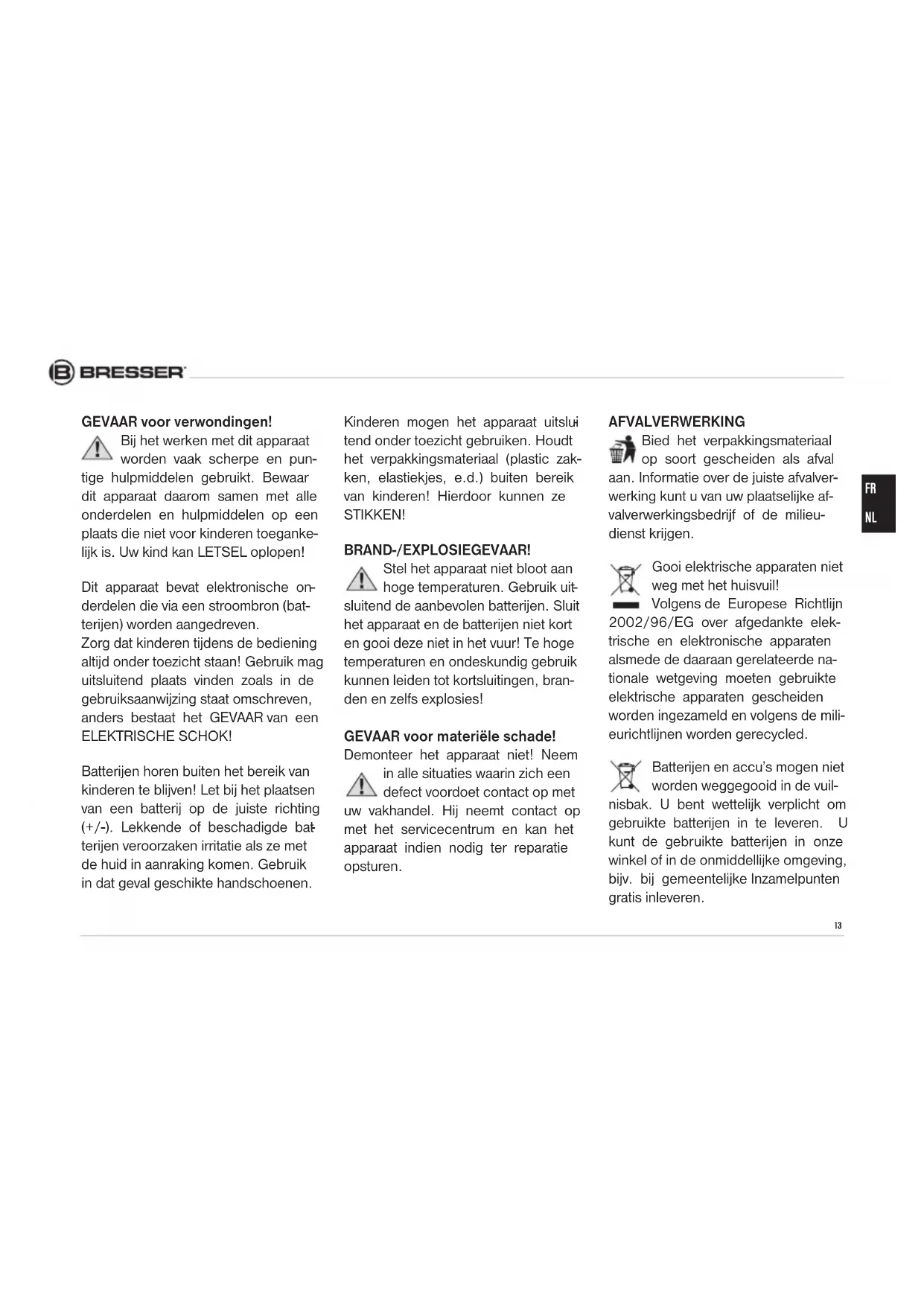sluitend de aanbevolen batterijen. Sluit het apparaat en de batterijen niet kort en gooi deze niet in het vuur! Te hoge temperaturen en ondeskundig gebruik kunnen leiden tot kortsluitingen, bran- den en zelfs explosies! GEVAAR voor materiële schade! Demonteer het apparaat niet! Neem in alle situaties waarin zich een defect voordoet contact op met uw vakhandel. Hij neemt contact op met het servicecentrum en kan het apparaat indien nodig ter reparatie opsturen. AFVALVERWERKING Bied het verpakkingsmateriaal op soort gescheiden als afval aan. Informatie over de juiste afvalver- werking kunt u van uw plaatselijke af- valverwerkingsbedrijf of de milieu- dienst krijgen. Gooi elektrische apparaten niet weg met het huisvuil! Volgens de Europese Richtlijn 2002/96/EG over afgedankte elek- trische en elektronische apparaten alsmede de daaraan gerelateerde na- tionale wetgeving moeten gebruikte elektrische apparaten gescheiden worden ingezameld en volgens de mili- eurichtlijnen worden gerecycled. Batterijen en accu’s mogen niet worden weggegooid in de vuil- nisbak. U bent wettelijk verplicht om gebruikte batterijen in te leveren. U kunt de gebruikte batterijen in onze winkel of in de onmiddellijke omgeving, bijv. bij gemeentelijke Inzamelpunten gratis inleveren.14 Batterijen en accu’s zijn gemarkeerd met een doorgestreepte vuilnisbak en het chemische symbool van de veront- reinigingende stoffen: “Cd” staat voor Cadmium, “Hg” staat voor Kwik en “Pb” voor Lood. Cd¹ Hg² Pb³