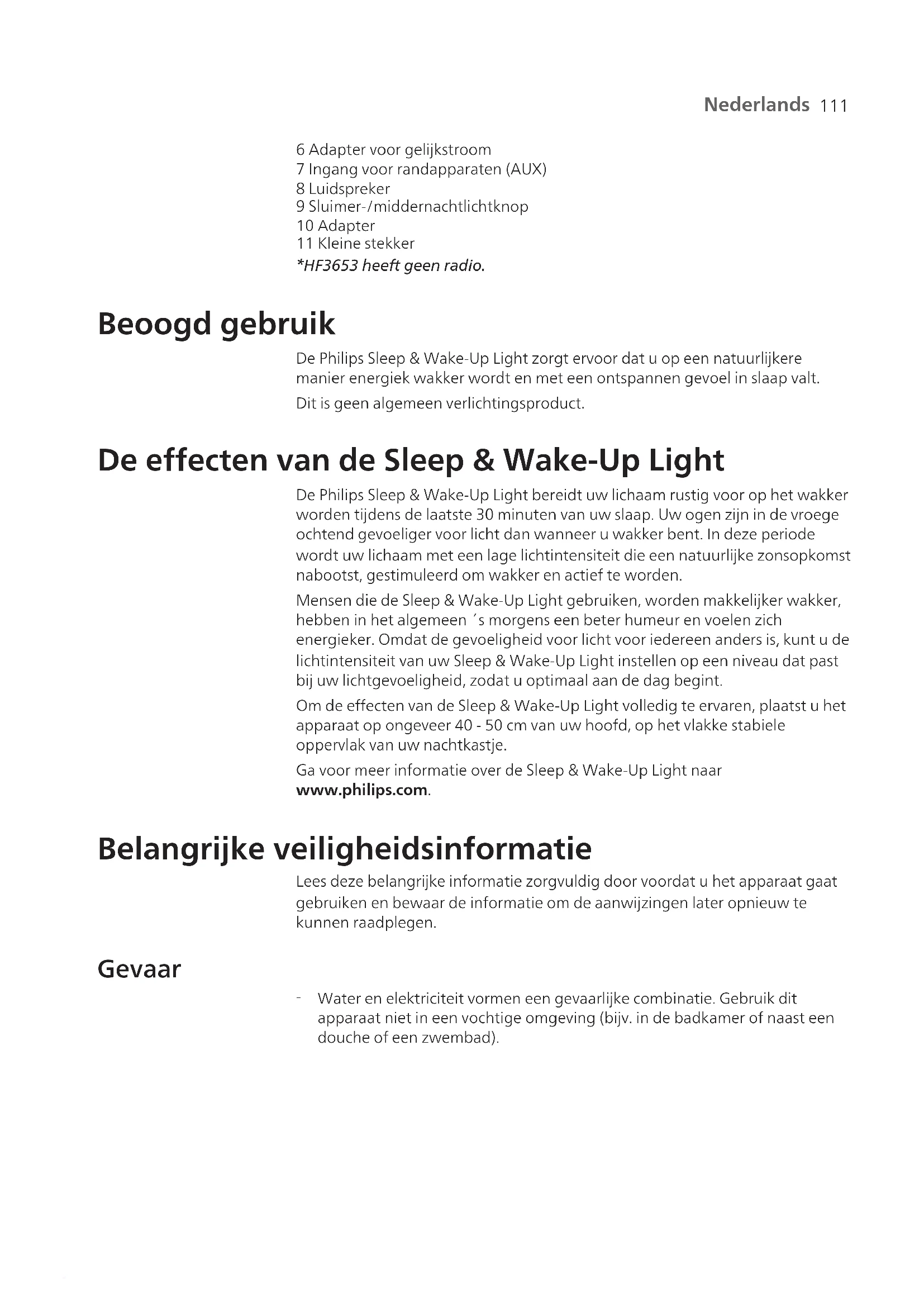 Nederlands Inhoud Introductie _______________________________________________________________________________ 110 Algemene beschrijving_____________________________________________________________________ 110 Beoogd gebruik ___________________________________________________________________________ 111 De effecten van de Sleep & Wake-Up Light ___________________________________________________ 111 Belangrijke veiligheidsinformatie ____________________________________________________________ 111 Veiligheid en naleving van richtlijnen ________________________________________________________ 113 Elektromagnetische velden (EMV) ___________________________________________________________ 113 Interactieve menupictogrammen____________________________________________________________ 114 Navigeren in het menu_____________________________________________________________________ 115 Wekprofielen instellen _____________________________________________________________________ 115 Tijd + back-upalarm________________________________________________________________________ 116 Sluimeren ________________________________________________________________________________ 116 Het alarm uitzetten ________________________________________________________________________ 117 De Sleep & Wake-Up Light als bedlamp gebruiken_____________________________________________ 117 Middernachtlamp _________________________________________________________________________ 117 Instellingen_______________________________________________________________________________ 117 Muziek___________________________________________________________________________________ 119 Ontspanningsprogramma's_________________________________________________________________ 120 Uw mobiele telefoon opladen ______________________________________________________________ 122 Schoonmaken en opbergen ________________________________________________________________ 122 Recyclen _________________________________________________________________________________ 122 Garantie en ondersteuning _________________________________________________________________ 122 Problemen oplossen _______________________________________________________________________ 122 Open-source software en software van derden________________________________________________ 124 Specificaties ______________________________________________________________________________ 125 Introductie Gefeliciteerd met uw aankoop en welkom bij Philips. Registreer uw product op www.philips.com/welcome om optimaal gebruik te kunnen maken van de door Philips geboden ondersteuning. Met de Philips Sleep & Wake-Up Light wordt u op een aangenamere manier wakker. Als de zonsopkomstsimulatie is geactiveerd neemt de lichtintensiteit van de lamp geleidelijk toe tot het ingestelde niveau en verandert de kleur van het licht van een rode ochtendgloed naar helder daglicht. Op de ingestelde tijd wordt uw lichaam door het licht langzaam voorbereid op het wakker worden. Om nog plezieriger wakker te worden, kunt u zich door natuurlijke wekgeluiden of de FM-radio* laten wekken. *HF3653 heeft geen radio. Algemene beschrijving 1 Lampbehuizing 2 Display 3 USB-oplaadpoort 4 Resetknop 5 Radioantenne*111 Nederlands 6 Adapter voor gelijkstroom 7 Ingang voor randapparaten (AUX) 8 Luidspreker 9 Sluimer-/middernachtlichtknop 10 Adapter 11 Kleine stekker *HF3653 heeft geen radio. Beoogd gebruik De Philips Sleep & Wake-Up Light zorgt ervoor dat u op een natuurlijkere manier energiek wakker wordt en met een ontspannen gevoel in slaap valt. Dit is geen algemeen verlichtingsproduct. De effecten van de Sleep & Wake-Up Light De Philips Sleep & Wake-Up Light bereidt uw lichaam rustig voor op het wakker worden tijdens de laatste 30 minuten van uw slaap. Uw ogen zijn in de vroege ochtend gevoeliger voor licht dan wanneer u wakker bent. In deze periode wordt uw lichaam met een lage lichtintensiteit die een natuurlijke zonsopkomst nabootst, gestimuleerd om wakker en actief te worden. Mensen die de Sleep & Wake-Up Light gebruiken, worden makkelijker wakker, hebben in het algemeen ´s morgens een beter humeur en voelen zich energieker. Omdat de gevoeligheid voor licht voor iedereen anders is, kunt u de lichtintensiteit van uw Sleep & Wake-Up Light instellen op een niveau dat past bij uw lichtgevoeligheid, zodat u optimaal aan de dag begint. Om de effecten van de Sleep & Wake-Up Light volledig te ervaren, plaatst u het apparaat op ongeveer 40-50cm van uw hoofd, op het vlakke stabiele oppervlak van uw nachtkastje. Ga voor meer informatie over de Sleep & Wake-Up Light naar www.philips.com. Belangrijke veiligheidsinformatie Lees deze belangrijke informatie zorgvuldig door voordat u het apparaat gaat gebruiken en bewaar de informatie om de aanwijzingen later opnieuw te kunnen raadplegen. Gevaar