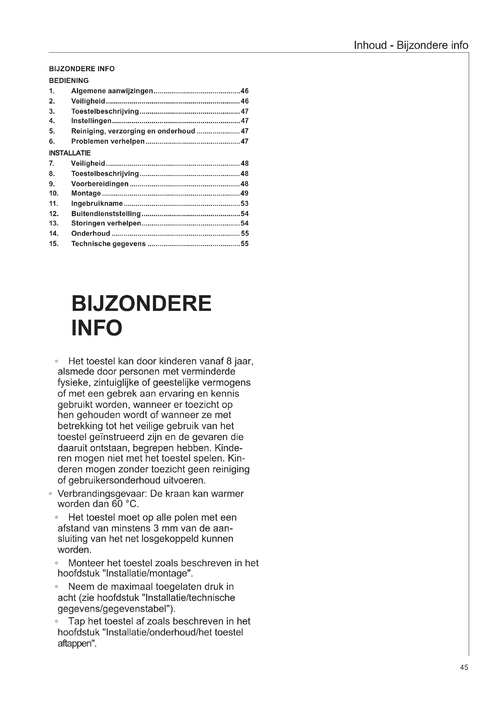 Inhoud - Bijzondere info BIJZONDERE INFO BEDIENING