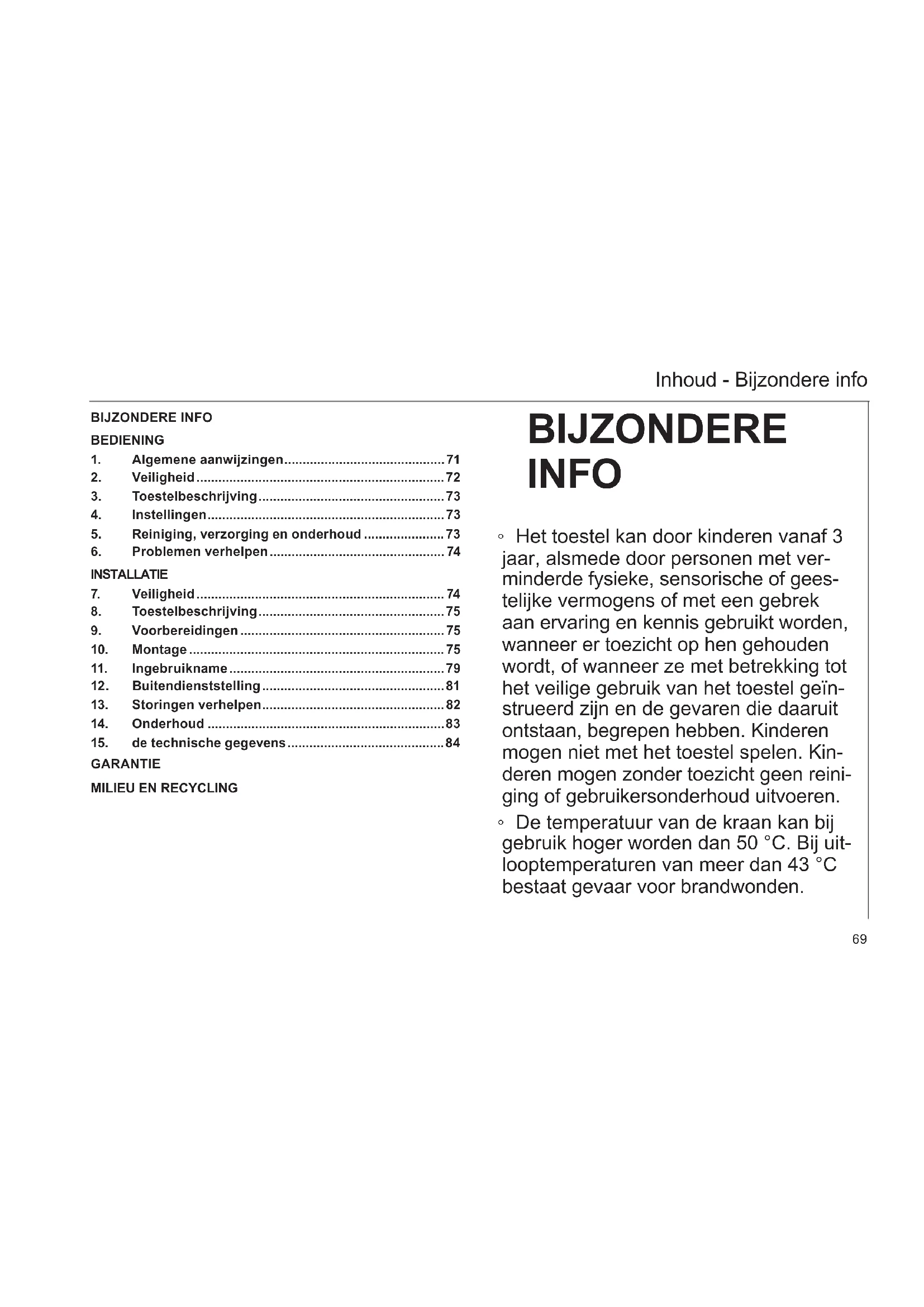 - De temperatuur van de kraan kan bij gebruik hoger worden dan 50 °C. Bij uit- looptemperaturen van meer dan 43 °C bestaat gevaar voor brandwonden.70 Bijzondere info