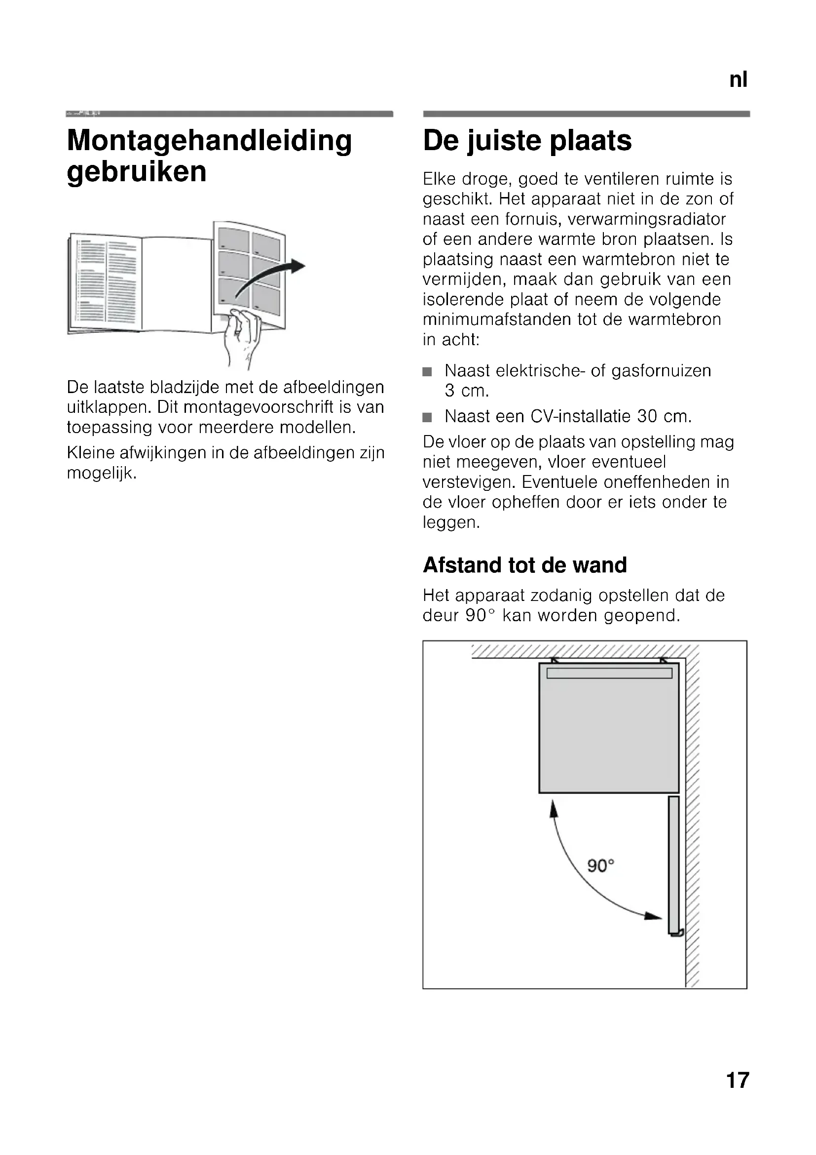 nlIn houd nlMontagevoorschrift Vrijstaand appa raat Montagehandleiding gebruiken De laatste bladzijde met de afbeeldingen uitklappen. Dit montagevoorschrift is van toepassing voor meerdere modellen. Kleine afwijkingen in de afbeeldingen zijn mogelijk. De juiste plaats Elke droge, goed te ventileren ruimte is geschikt. Het apparaat niet in de zon of naast een fornuis, verwarmingsradiator of een andere warmte bron plaatsen. Is plaatsing naast een warmtebron niet te vermijden, maak dan gebruik van een isolerende plaat of neem de volgende minimumafstanden tot de warmtebron in acht: ■ Naast elektrische- of gasfornuizen 3cm. ■ Naast een CV-installatie 30 cm. De vloer op de plaats van opstelling mag niet meegeven, vloer eventueel verstevigen. Eventuele oneffenheden in de vloer opheffen door er iets onder te leggen. Afstand tot de wand Het apparaat zodanig opstellen dat de deur 90° kan worden geopend.nl