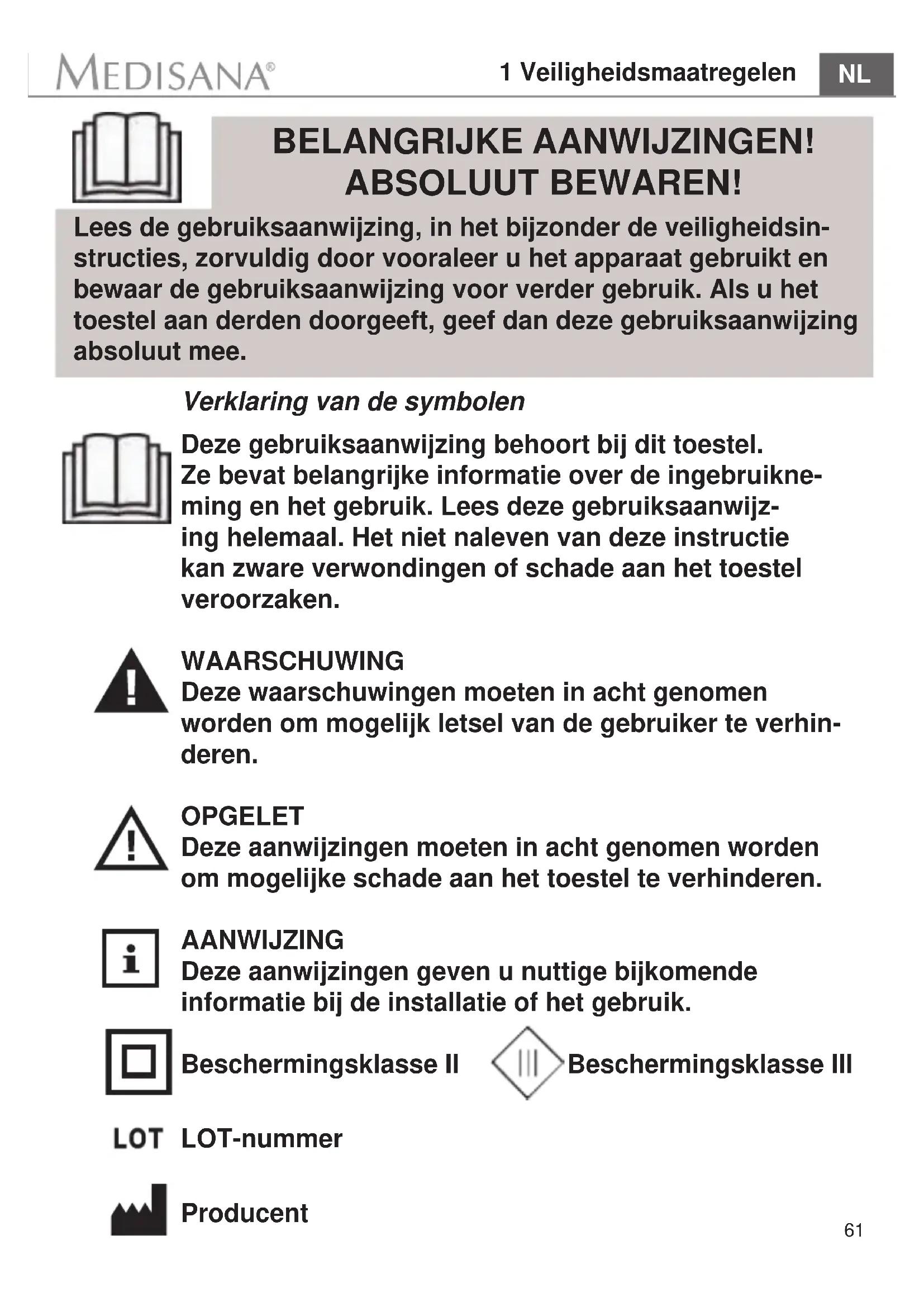 Verklaring van de symbolen Deze gebruiksaanwijzing behoort bij dit toestel. Ze bevat belangrijke informatie over de ingebruikne- ming en het gebruik. Lees deze gebruiksaanwijz- ing helemaal. Het niet naleven van deze instructie kan zware verwondingen of schade aan het toestel veroorzaken. WAARSCHUWING Deze waarschuwingen moeten in acht genomen worden om mogelijk letsel van de gebruiker te verhin- deren. OPGELET Deze aanwijzingen moeten in acht genomen worden om mogelijke schade aan het toestel te verhinderen. AANWIJZING Deze aanwijzingen geven u nuttige bijkomende informatie bij de installatie of het gebruik. Beschermingsklasse II Beschermingsklasse III LOT-nummer Producent Lees de gebruiksaanwijzing, in het bijzonder de veiligheidsin- structies, zorvuldig door vooraleer u het apparaat gebruikt en bewaar de gebruiksaanwijzing voor verder gebruik. Als u het toestel aan derden doorgeeft, geef dan deze gebruiksaanwijzing absoluut mee. BELANGRIJKE AANWIJZINGEN! ABSOLUUT BEWAREN!62 1 Veiligheidsmaatregelen