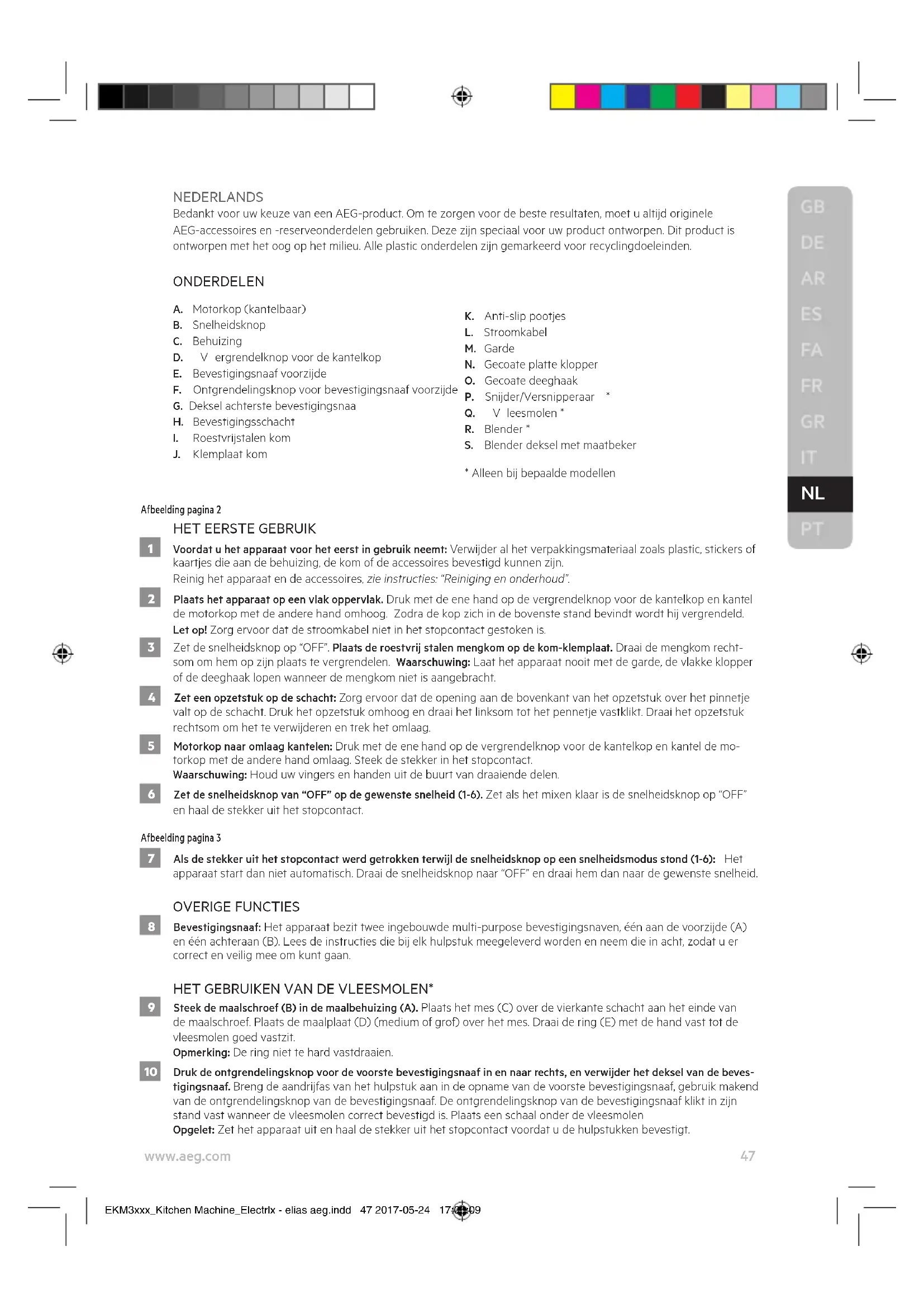 - Dit apparaat kan worden gebruikt door mensen met beperkte lichamelijke, zintuiglijke of verstandelijke vermogens of een gebrek aan ervaring en kennis, indien zij onder toezicht staan of instructies hebben gekregen over het veilig gebruiken van het apparaat en indien EKM3xxx_Kitchen Machine_Electrlx - elias aeg.indd 48 2017-05-24 17:06:0949 www.aeg.com