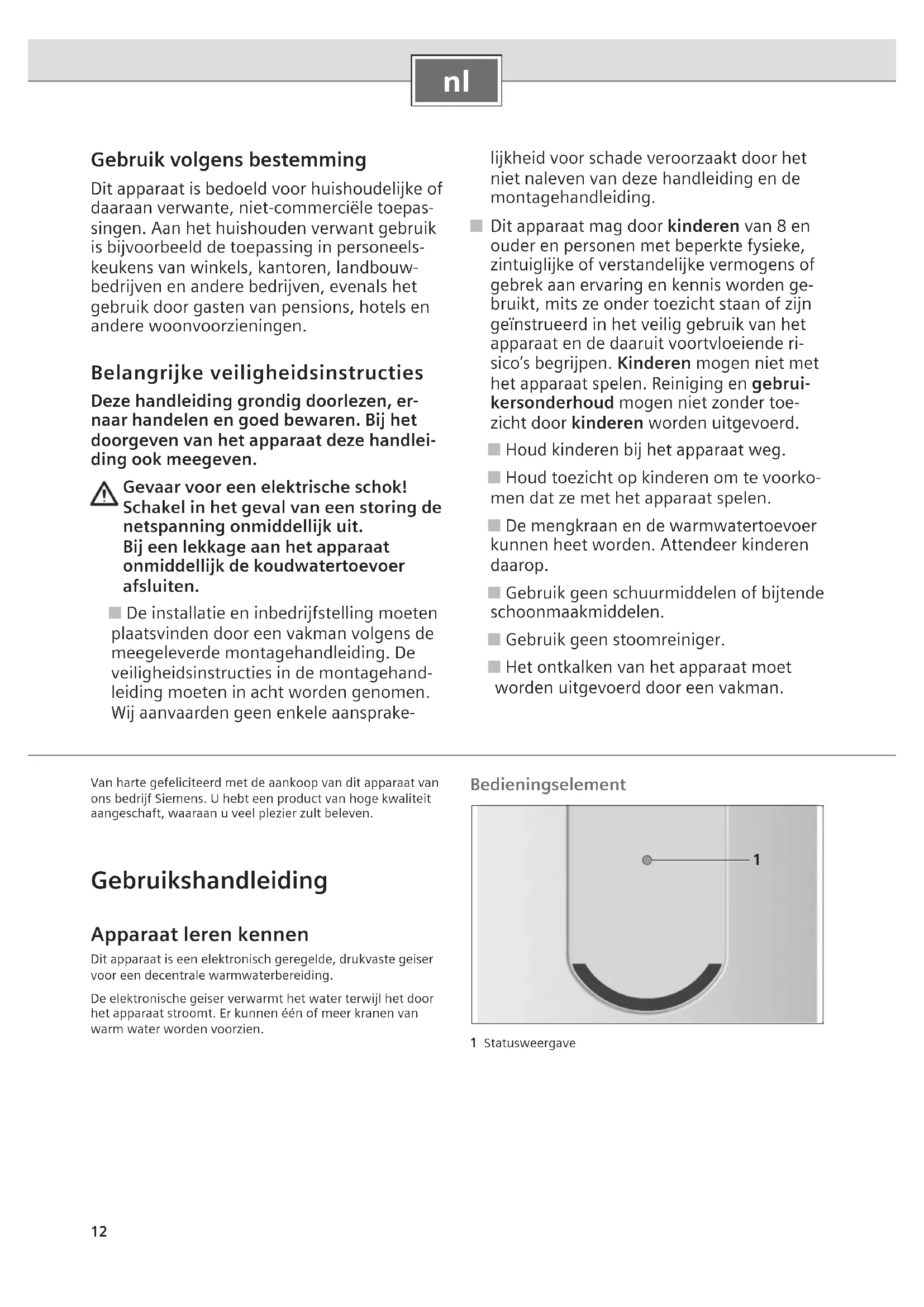 Gebruik volgens bestemming Dit apparaat is bedoeld voor huishoudelijke of daaraan verwante, niet-commerciële toepas- singen. Aan het huishouden verwant gebruik is bijvoorbeeld de toepassing in personeels- keukens van winkels, kantoren, landbouw- bedrijven en andere bedrijven, evenals het gebruik door gasten van pensions, hotels en andere woonvoorzieningen. Belangrijke veiligheidsinstructies Deze handleiding grondig doorlezen, er- naar handelen en goed bewaren. Bij het doorgeven van het apparaat deze handlei- ding ook meegeven. Gevaar voor een elektrische schok! Schakel in het geval van een storing de netspanning onmiddellijk uit. Bij een lekkage aan het apparaat onmiddellijk de koudwatertoevoer afsluiten. ■ De installatie en inbedrijfstelling moeten plaatsvinden door een vakman volgens de meegeleverde montagehandleiding. De veiligheidsinstructies in de montagehand- leiding moeten in acht worden genomen. Wij aanvaarden geen enkele aansprake- lijkheid voor schade veroorzaakt door het niet naleven van deze handleiding en de montagehandleiding. ■ Dit apparaat mag door kinderen van 8 en ouder en personen met beperkte fysieke, zintuiglijke of verstandelijke vermogens of gebrek aan ervaring en kennis worden ge- bruikt, mits ze onder toezicht staan of zijn geïnstrueerd in het veilig gebruik van het apparaat en de daaruit voortvloeiende ri- sico’s begrijpen. Kinderen mogen niet met het apparaat spelen. Reiniging en gebrui- kersonderhoud mogen niet zonder toe- zicht door kinderen worden uitgevoerd. ■ Houd kinderen bij het apparaat weg. ■ Houd toezicht op kinderen om te voorko- men dat ze met het apparaat spelen. ■ De mengkraan en de warmwatertoevoer kunnen heet worden. Attendeer kinderen daarop. ■ Gebruik geen schuurmiddelen of bijtende schoonmaakmiddelen. ■ Gebruik geen stoomreiniger. ■ Het ontkalken van het apparaat moet worden uitgevoerd door een vakman. Van harte gefeliciteerd met de aankoop van dit apparaat van ons bedrijf Siemens. U hebt een product van hoge kwaliteit aangeschaft, waaraan u veel plezier zult beleven. Gebruikshandleiding Apparaat leren kennen Dit apparaat is een elektronisch geregelde, drukvaste geiser voor een decentrale warmwaterbereiding.De elektronische geiser verwarmt het water terwijl het door het apparaat stroomt. Er kunnen één of meer kranen van warm water worden voorzien. Bedieningselement