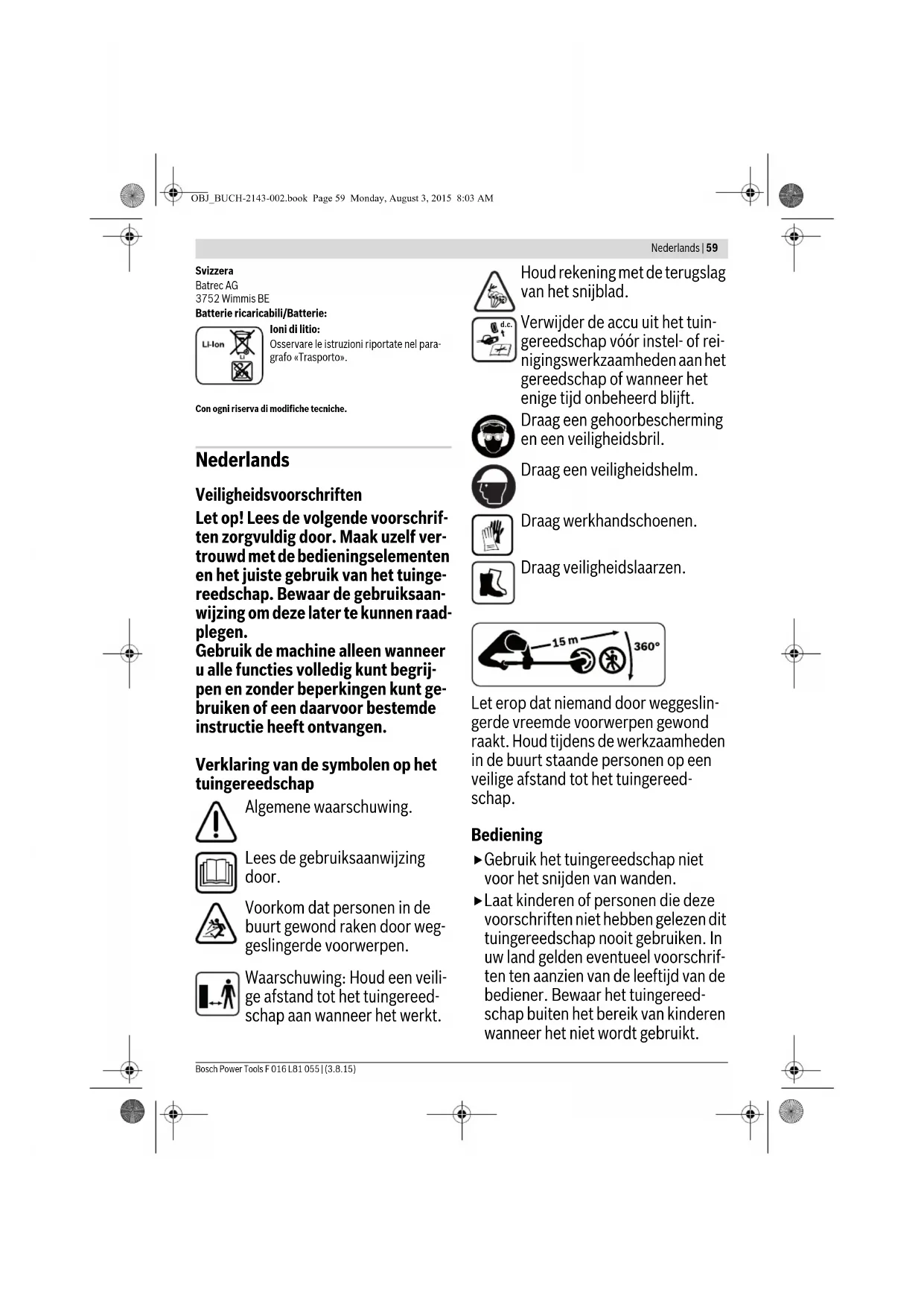 Montage en gebruik De nummeringen verwijzen naar de afbeeldingen op de pagi- na’s met afbeeldingen. Vervoeren van het tuingereedschap Vervoer het tuingereedschap alleen met gemonteerde messenbescherming. Vervoer het tuingereedschap alleen met gedemonteerde accu. U kunt het tuingereedschap voor het vervoer aan het oog voor de draagriem fixeren. Tips voor de werkzaamheden Henk Becker Executive Vice President Engineering Helmut Heinzelmann Head of Product Certification PT/ETM9 Handelingsdoel Afbeelding Pagina Meegeleverd