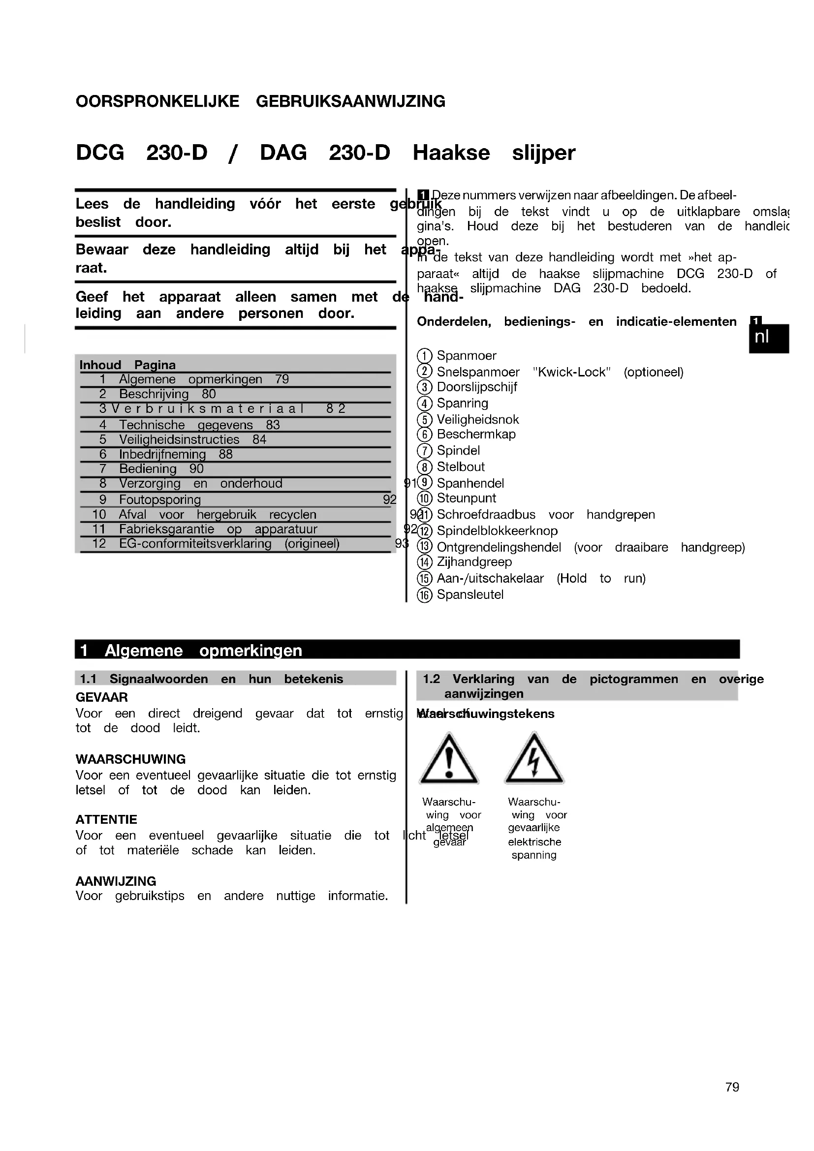Printed: 20.11.2013 | Doc-Nr: PUB / 5069494 / 000 / 02OORSPRONKELIJKE GEBRUIKSAANWIJZING DCG 230‑D / DAG 230‑D Haakse slijper Lees de handleiding vóór het eerste gebruik beslist door. Bewaar deze handleiding altijd bij het appa- raat. Geef het apparaat alleen samen met de hand- leiding aan andere personen door. Inhoud Pagina1 Algemene opmerkingen 792 Beschrijving 803Verbruiksmateriaal 824 Technische gegevens 835 Veiligheidsinstructies 846 Inbedrijfneming 887 Bediening 908 Verzorging en onderhoud 919 Foutopsporing 9210 Afval voor hergebruik recyclen 9211 Fabrieksgarantie op apparatuur 9212 EG-conformiteitsverklaring (origineel) 93 1 Deze nummers verwijzen naar afbeeldingen. De afbeel- dingen bij de tekst vindt u op de uitklapbare omslagpa-gina's. Houd deze bij het bestuderen van de handleidingopen. In de tekst van deze handleiding wordt met »het ap- paraat« altijd de haakse slijpmachine DCG 230‑D of dehaakse slijpmachine DAG 230‑D bedoeld.Onderdelen, bedienings- en indicatie-elementen 1 Spanmoer Snelspanmoer "Kwick-Lock" (optioneel) Doorslijpschijf Spanring Veiligheidsnok Beschermkap Spindel Stelbout Spanhendel Steunpunt Schroefdraadbus voor handgrepen Spindelblokkeerknop Ontgrendelingshendel (voor draaibare handgreep) Zijhandgreep Aan-/uitschakelaar (Hold to run) Spansleutel 1 Algemene opmerkingen 1.1 Signaalwoorden en hun betekenisGEVAARVoor een direct dreigend gevaar dat tot ernstig letsel oftot de dood leidt.WAARSCHUWING Voor een eventueel gevaarlijke situatie die tot ernstig letsel of tot de dood kan leiden.ATTENTIEVoor een eventueel gevaarlijke situatie die tot licht letselof tot materiële schade kan leiden.AANWIJZINGVoor gebruikstips en andere nuttige informatie.1.2 Verklaring van de pictogrammen en overigeaanwijzingenWaarschuwingstekensWaarschu-wing vooralgemeengevaarWaarschu-wing voorgevaarlijkeelektrischespanning