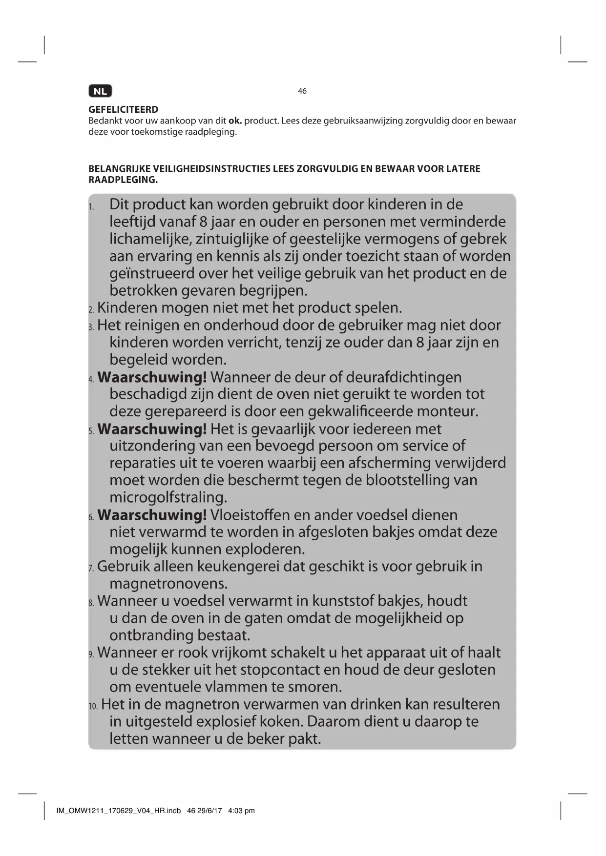 VOORGENOMEN GEBRUIK Dit apparaat is bedoeld om voedsel te ontdooien, op te warmen en te koken. Elk ander gebruik kan tot schade aan het product of tot letsel leiden. Imtron GmbH aanvaardt geen aansprakelijkheid voor schade aan het product, schade aan eigendommen of lichamelijk letsel als gevolg van onzorgvuldig of oneigenlijk gebruik van het product, of gebruik van het product die niet voldoet aan het doel opgegeven door de fabrikant. IM_OMW1211_170629_V04_HR.indb 48 29/6/17 4:03 pm49