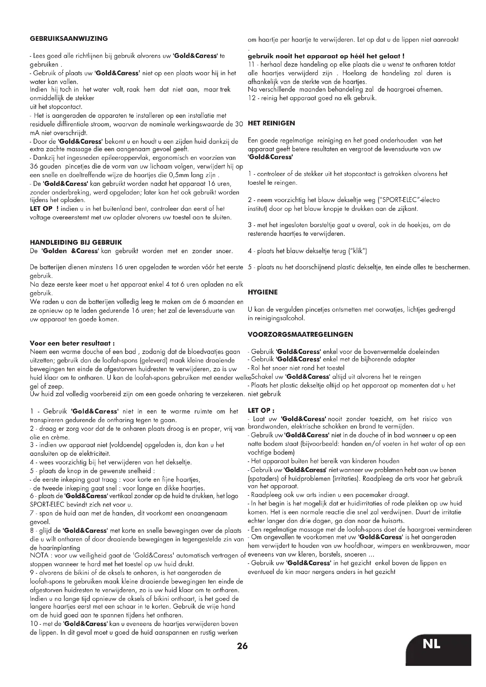 Het is aangeraden de apparaten te installeren op een installatie met residuele diffirentiale stroom, waarvan de nominale werkingswaarde de 30 mA niet overschrijdt. - Door de 'Gold&Caress' bekomt u en houdt u een zijden huid dankzij de extra zachte massage die een aangenaam gevoel geeft. - Dankzij het ingesneden epileeroppervlak, ergonomisch en voorzien van 36 gouden pincetjes die de vorm van uw lichaam volgen, verwijdert hij op een snelle en doeltreffende wijze de haartjes die 0,5mm lang zijn . - De 'Gold&Caress' kan gebruikt worden nadat het apparaat 16 uren, zonder onderbreking, werd opgeladen; later kan het ook gebruikt worden tijdens het opladen. LET OP ! indien u in het buitenland bent, controleer dan eerst of het voltage overeenstemt met uw oplader alvorens uw toestel aan te sluiten.