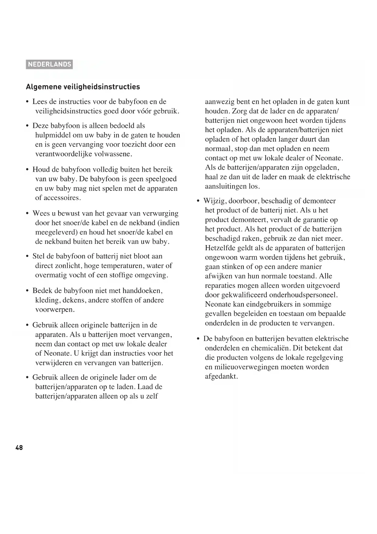 - Gebruik alleen de originele lader om de batterijen/apparaten op te laden. Laad de batterijen/apparaten alleen op als u zelf aanwezig bent en het opladen in de gaten kunt houden. Zorg dat de lader en de apparaten/ batterijen niet ongewoon heet worden tijdens het opladen. Als de apparaten/batterijen niet opladen of het opladen langer duurt dan normaal, stop dan met opladen en neem contact op met uw lokale dealer of Neonate. Als de batterijen/apparaten zijn opgeladen, haal ze dan uit de lader en maak de elektrische aansluitingen los.