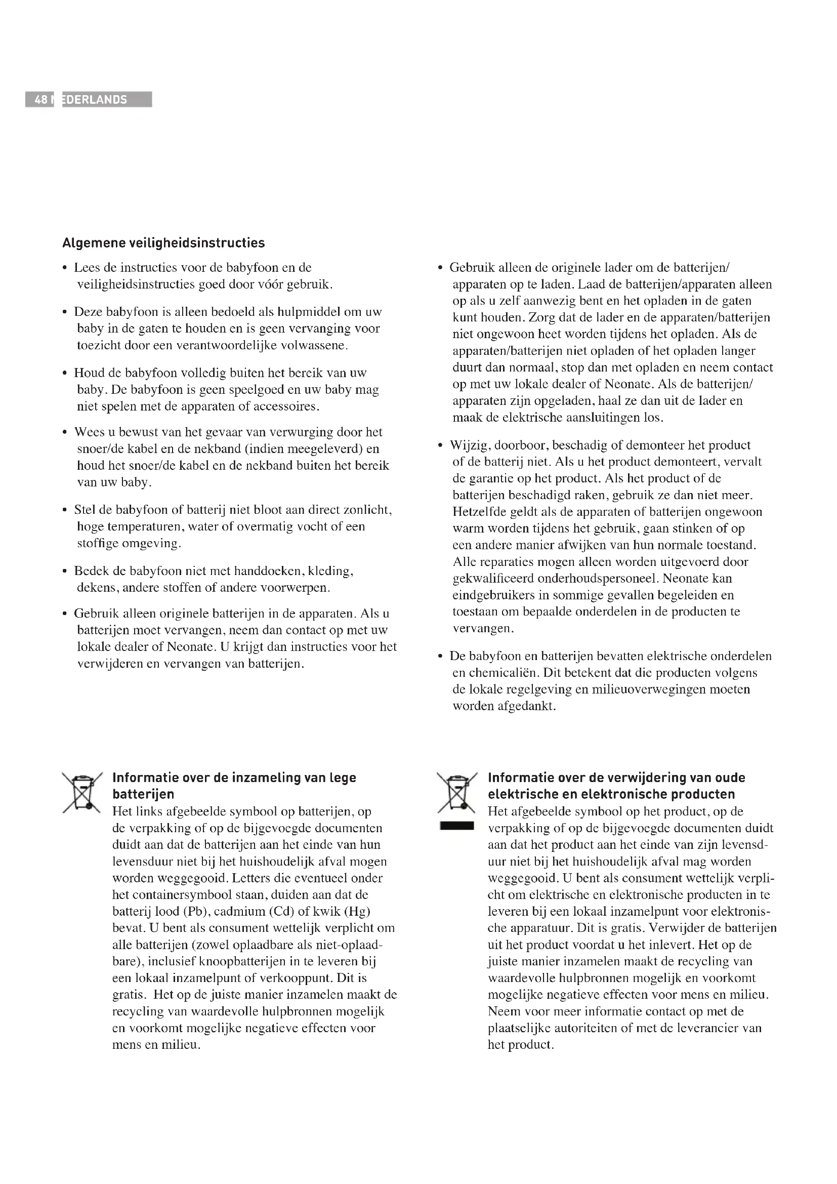 - De babyfoon en batterijen bevatten elektrische onderdelen en chemicaliën. Dit betekent dat die producten volgens de lokale regelgeving en milieuoverwegingen moeten worden afgedankt.49 Waarschuwing! Let goed op de batterijen. Als u een batterij oplaadt, is er altijd een risico op kort- sluiting of een fabrieksfout die ervoor zorgt dat de batterij oververhit raakt of ontvlamt. Daarom wordt er ten sterkste afgeraden om een batterij op te laden zonder toezicht. Waarschuwing!