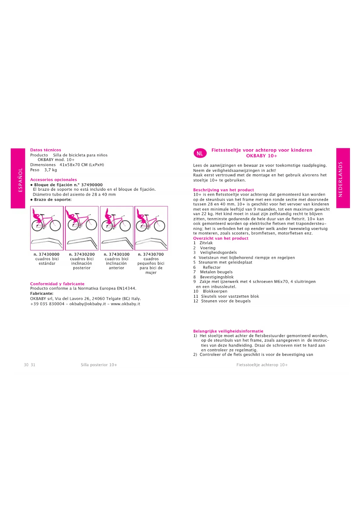 - Brazo de soporte: Conformidad y fabricante Producto conforme a la Normativa Europea EN14344. Fabricante: OKBABY srl, Via del Lavoro 26, 24060 Telgate (BG) Italy. +39 035 830004 - okbaby@okbaby.it - www.okbaby.it n. 37430200 cuadros bici inclinación posterior n. 37430100 cuadros bici inclinación anterior n. 37430700 cuadros pequeños bici para bici de mujer n. 37430000 cuadros bici estándar Fietsstoeltje voor achterop voor kinderen OKBABY 10+ Lees de aanwijzingen en bewaar ze voor toekomstige raadpleging. Neem de veiligheidsaanwijzingen in acht! Raak eerst vertrouwd met de montage en het gebruik alvorens het stoeltje 10+ te gebruiken. Beschrijving van het product 10+ is een etsstoeltje voor achterop dat gemonteerd kan worden op de steunbuis van het frame met een ronde sectie met doorsnede tussen 28 en 40 mm. 10+ is geschikt voor het vervoer van kinderen met een minimale leeftijd van 9 maanden, tot een maximum gewicht van 22 kg. Het kind moet in staat zijn zelfstandig recht te blijven zitten, tenminste gedurende de hele duur van de etsrit. 10+ kan ook gemonteerd worden op elektrische etsen met trapondersteu- ning; het is verboden het op eender welk ander tweewielig voertuig te monteren, zoals scooters, brometsen, motoretsen enz. Overzicht van het product 1 Zitvlak 2 Voering 3 Veiligheidsgordels 4 Voetsteun met bijbehorend riempje en regelpen 5 Steunarm met geleideplaat 6 Reflector 7 Metalen beugels 8 Bevestigingsblok 9 Zakje met ijzerwerk met 4 schroeven M6x70, 4 sluitringen en een inbussleutel. 10 Blokkeerpen 11 Sleutels voor vastzetten blok 12 Steunen voor de beugels Belangrijke veiligheidsinformatie