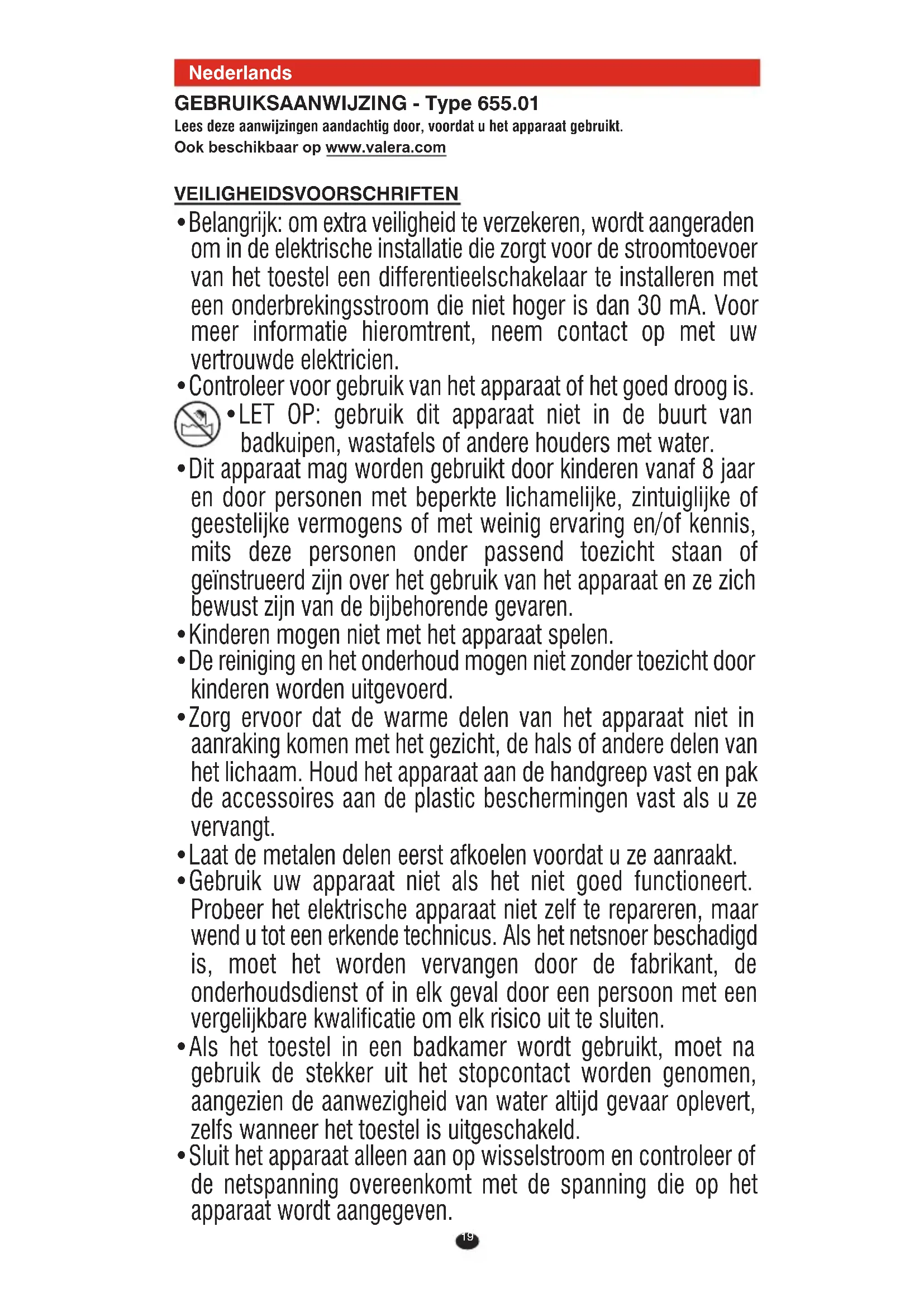 Haal de stekker altijd uit het stopcontact voordat u het apparaat schoonmaakt! Laat het apparaat goed afkoelen voor u het reinigt. U kunt uw apparaat met een vochtige doek schoonmaken, maar dompel het nooit onder in water of in een andere vloeistof! Dit apparaat voldoet aan de Europese richtlijnen 2004/108/EG, 2009/125/EG, 2006/95/EG en aan de verordening (EG) nr. 1275/2008. GARANTIE Valera biedt volgende garantievoorwaarden: 1 Van toepassing zijn de garantievoorwaarden die door onze officiële distributeur in het land van aankoop zijn vastgesteld. In Zwitserland en in de landen waar de Europese richtlijn 44/99/CE van kracht is, geldt een garantieperiode van 24 maanden bij huishoudelijk gebruik en van 12 maanden bij professioneel of soortgelijk gebruik. De garantieperiode loopt vanaf de aankoopdatum van het apparaat. De aankoopdatum is de datum die staat op dit volledig ingevulde en door de verkoper gestempelde garantiebewijs of op de aankoopbon.