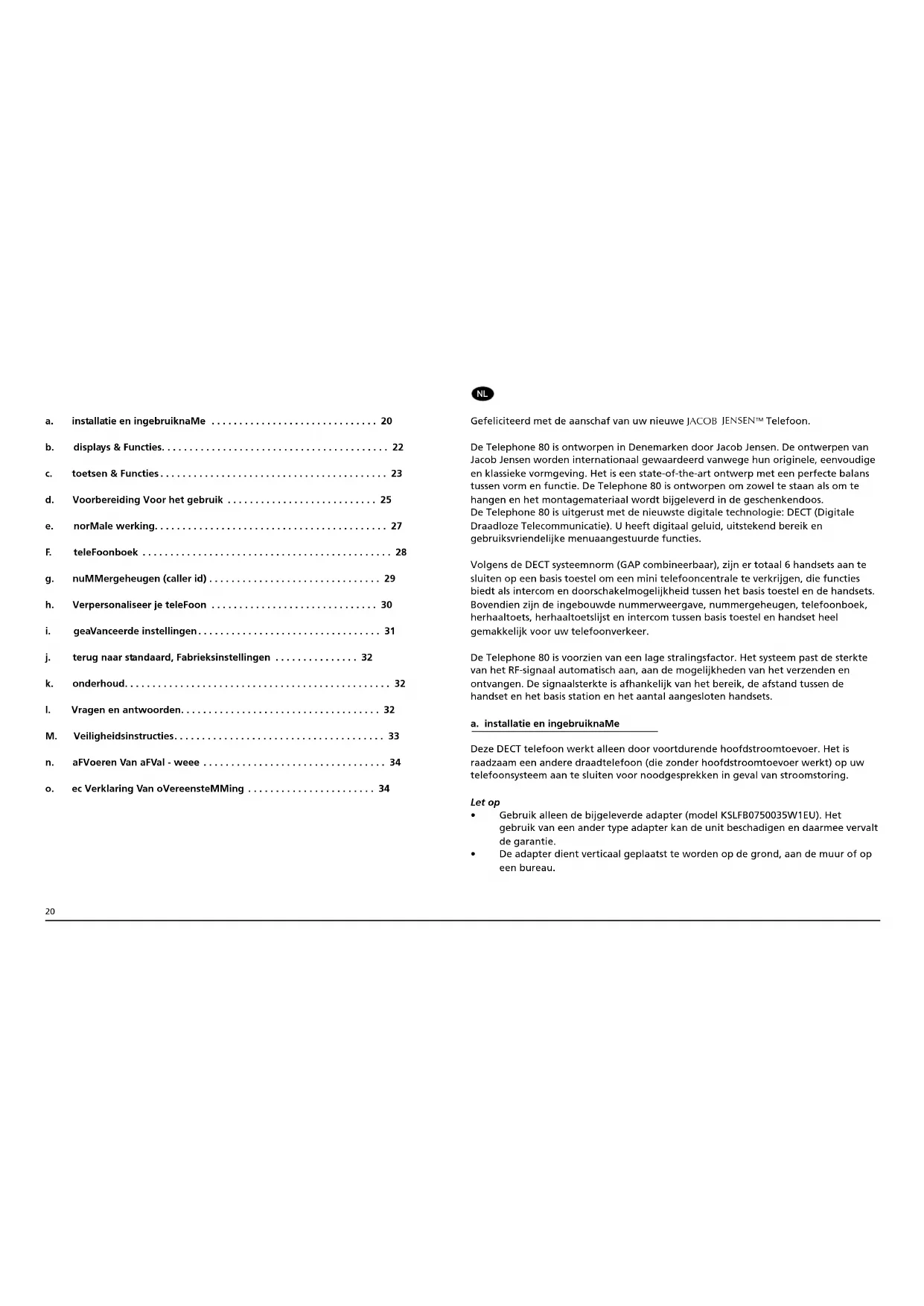 Telefoon. De Telephone 80 is ontworpen in Denemarken door Jacob Jensen. De ontwerpen van Jacob Jensen worden internationaal gewaardeerd vanwege hun originele, eenvoudige en klassieke vormgeving. Het is een state-of-the-art ontwerp met een perfecte balans tussen vorm en functie. De Telephone 80 is ontworpen om zowel te staan als om te hangen en het montagemateriaal wordt bijgeleverd in de geschenkendoos. De Telephone 80 is uitgerust met de nieuwste digitale technologie: DECT (Digitale Draadloze Telecommunicatie). U heeft digitaal geluid, uitstekend bereik en gebruiksvriendelijke menuaangestuurde functies. Volgens de DECT systeemnorm (GAP combineerbaar), zijn er totaal 6 handsets aan te sluiten op een basis toestel om een mini telefooncentrale te verkrijgen, die functies biedt als intercom en doorschakelmogelijkheid tussen het basis toestel en de handsets. Bovendien zijn de ingebouwde nummerweergave, nummergeheugen, telefoonboek, herhaaltoets, herhaaltoetslijst en intercom tussen basis toestel en handset heel gemakkelijk voor uw telefoonverkeer. De Telephone 80 is voorzien van een lage stralingsfactor. Het systeem past de sterkte van het RF-signaal automatisch aan, aan de mogelijkheden van het verzenden en ontvangen. De signaalsterkte is afhankelijk van het bereik, de afstand tussen de handset en het basis station en het aantal aangesloten handsets. a. installatie en ingebruiknaMe Deze DECT telefoon werkt alleen door voortdurende hoofdstroomtoevoer. Het is raadzaam een andere draadtelefoon (die zonder hoofdstroomtoevoer werkt) op uw telefoonsysteem aan te sluiten voor noodgesprekken in geval van stroomstoring. Let op Gebruik alleen de bijgeleverde adapter (model KSLFB0750035W1EU). Het gebruik van een ander type adapter kan de unit beschadigen en daarmee vervalt de garantie. De adapter dient verticaal geplaatst te worden op de grond, aan de muur of op een bureau.