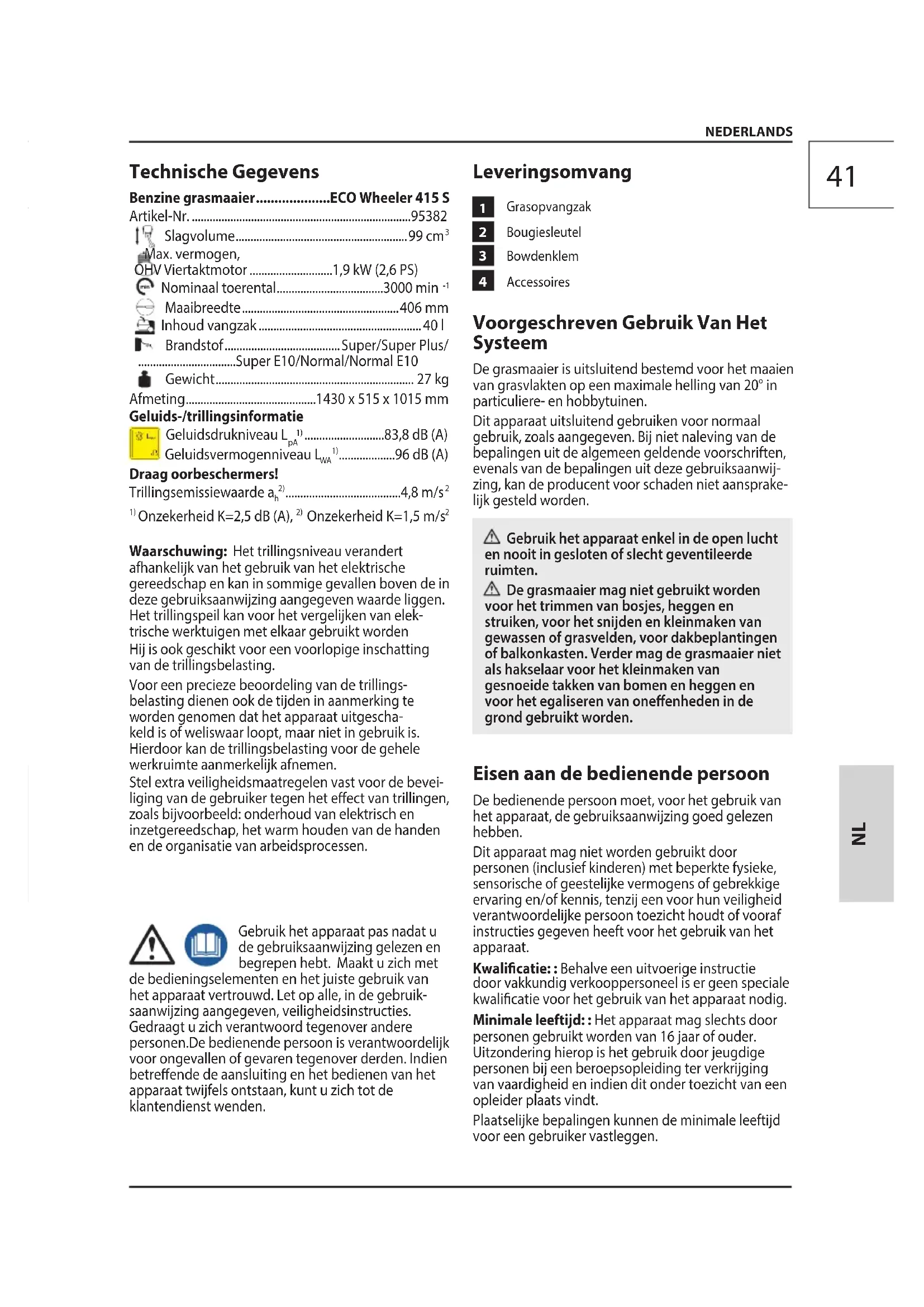 Accessoires Voorgeschreven Gebruik Van Het Systeem De grasmaaier is uitsluitend bestemd voor het maaien van grasvlakten op een maximale helling van 20° in particuliere- en hobbytuinen. Dit apparaat uitsluitend gebruiken voor normaal gebruik, zoals aangegeven. Bij niet naleving van de bepalingen uit de algemeen geldende voorschriften, evenals van de bepalingen uit deze gebruiksaanwij- zing, kan de producent voor schaden niet aansprake- lijk gesteld worden. Gebruik het apparaat enkel in de open lucht en nooit in gesloten of slecht geventileerde ruimten. De grasmaaier mag niet gebruikt worden voor het trimmen van bosjes, heggen en struiken, voor het snijden en kleinmaken van gewassen of grasvelden, voor dakbeplantingen of balkonkasten. Verder mag de grasmaaier niet als hakselaar voor het kleinmaken van gesnoeide takken van bomen en heggen en voor het egaliseren van oneenheden in de grond gebruikt worden. Eisen aan de bedienende persoon De bedienende persoon moet, voor het gebruik van hetapparaat, de gebruiksaanwijzing goed gelezen hebben. Dit apparaat mag niet worden gebruikt door personen (inclusief kinderen) met beperkte fysieke, sensorische of geestelijke vermogens of gebrekkige ervaring en/of kennis, tenzij een voor hun veiligheid verantwoordelijke persoon toezicht houdt of vooraf instructies gegeven heeft voor het gebruik van het apparaat. Kwalicatie:: Behalve een uitvoerige instructie doorvakkundig verkooppersoneel is er geen speciale kwalicatievoor het gebruik van het apparaat nodig. Minimale leeftijd:: Het apparaat mag slechts door personen gebruikt worden van 16 jaar of ouder. Uitzondering hierop is het gebruik door jeugdige personen bij een beroepsopleiding ter verkrijging van vaardigheid en indien dit onder toezicht van een opleider plaats vindt. Plaatselijke bepalingen kunnen de minimale leeftijd voor een gebruiker vastleggen.42