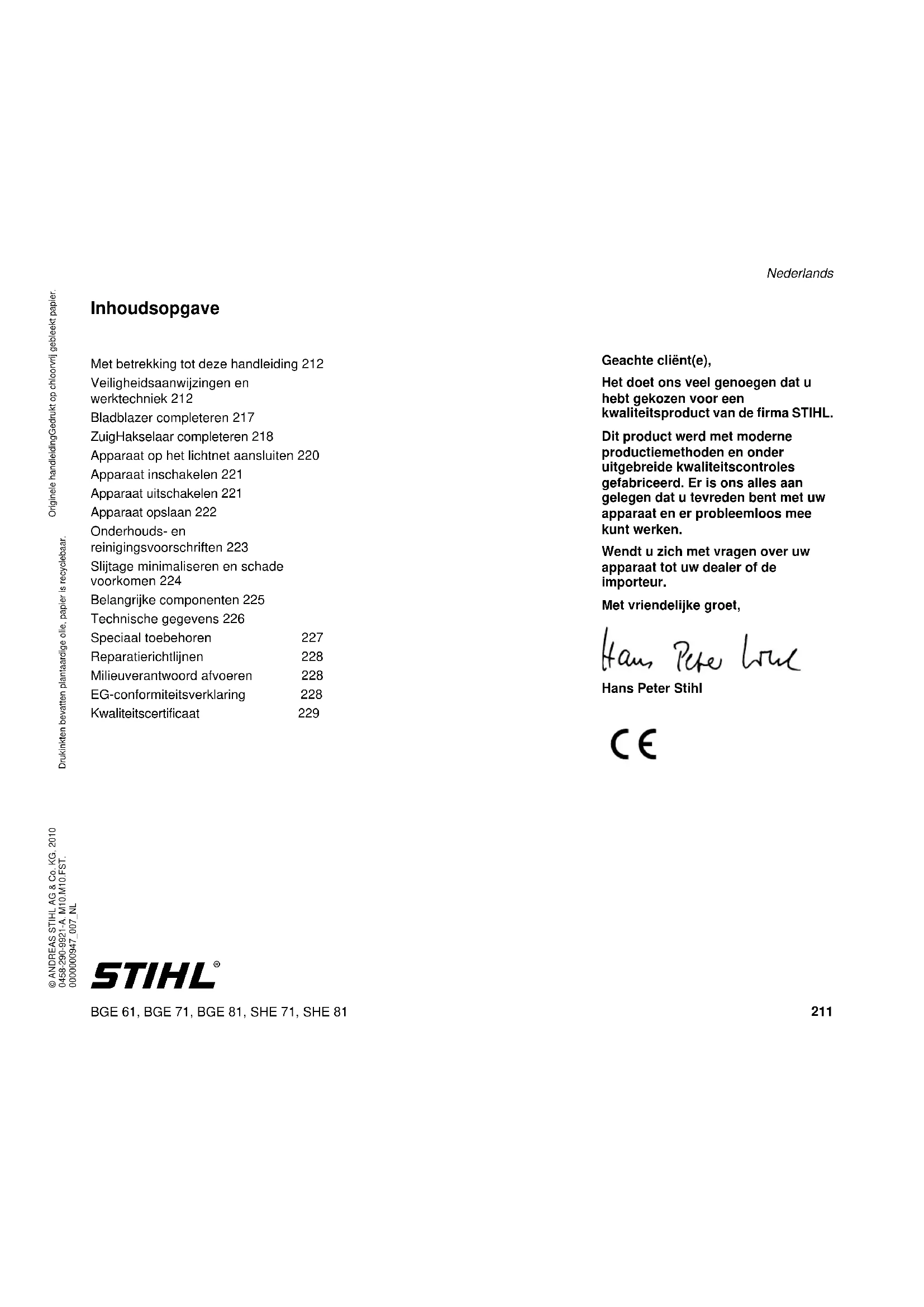 Inhoudsopgave Geachte cliënt(e), Het doet ons veel genoegen dat u hebt gekozen voor een kwaliteitsproduct van de firma STIHL. Dit product werd met moderne productiemethoden en onder uitgebreide kwaliteitscontroles gefabriceerd. Er is ons alles aan gelegen dat u tevreden bent met uw apparaat en er probleemloos mee kunt werken. Wendt u zich met vragen over uw apparaat tot uw dealer of de importeur. Met vriendelijke groet, Hans Peter Stihl Met betrekking tot deze handleiding 212 Veiligheidsaanwijzingen en werktechniek 212 Bladblazer completeren 217 ZuigHakselaar completeren 218 Apparaat op het lichtnet aansluiten 220 Apparaat inschakelen 221 Apparaat uitschakelen 221 Apparaat opslaan 222 Onderhouds- en reinigingsvoorschriften 223 Slijtage minimaliseren en schade voorkomen 224 Belangrijke componenten 225 Technische gegevens 226 Speciaal toebehoren 227 Reparatierichtlijnen 228 Milieuverantwoord afvoeren 228 EG-conformiteitsverklaring 228 Kwaliteitscertificaat 229BGE 61, BGE 71, BGE 81, SHE 71, SHE 81 Nederlands