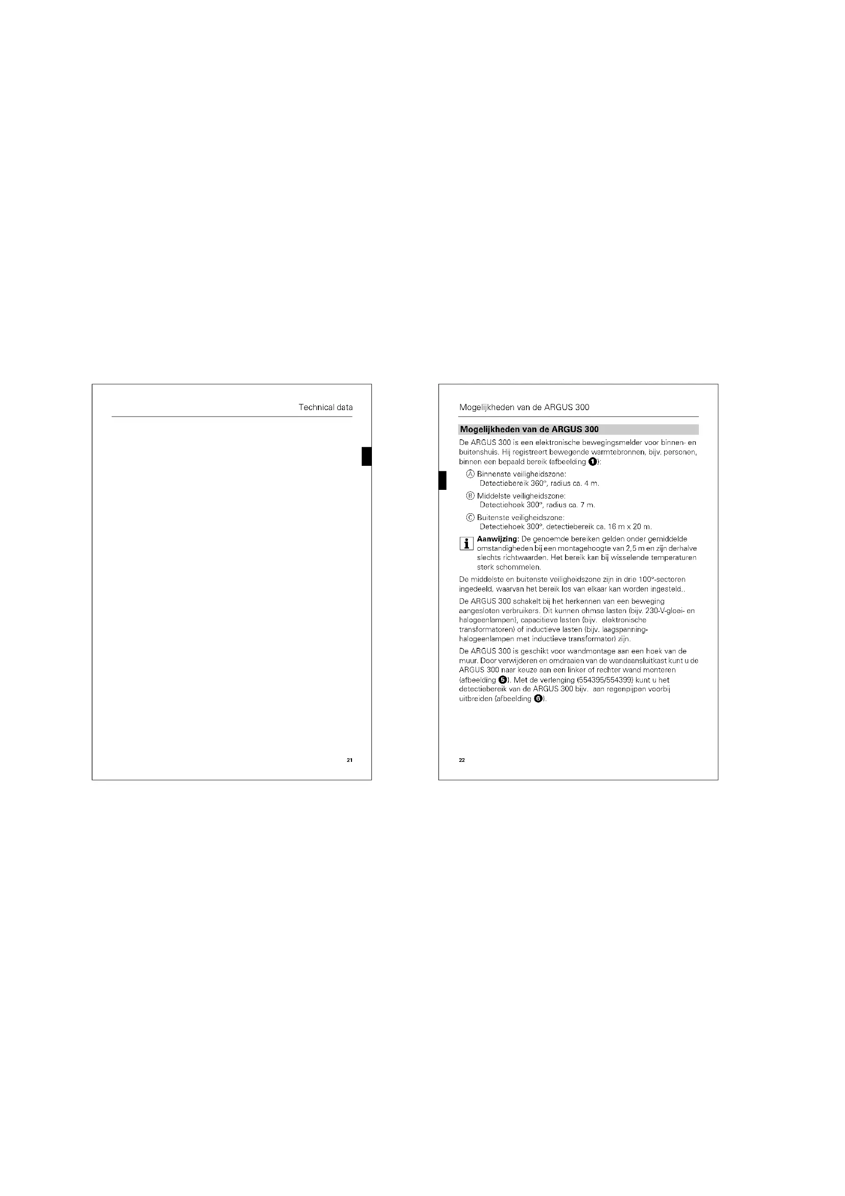 De ARGUS 300 is geschikt voor Wandmonlage aan een hoek van de muur. Door verwijderen en omdraaten van de wandaansluitkast kutu de ARGUS 300 naar keuze aan een linker of rechter wand montere (labefeeling 5). Met de verleending (154395/554399) kutu u het detectiebereik van de ARGUS 300 bijv. aan regenpijden voor bij uittbreiden (labefeinding 6).