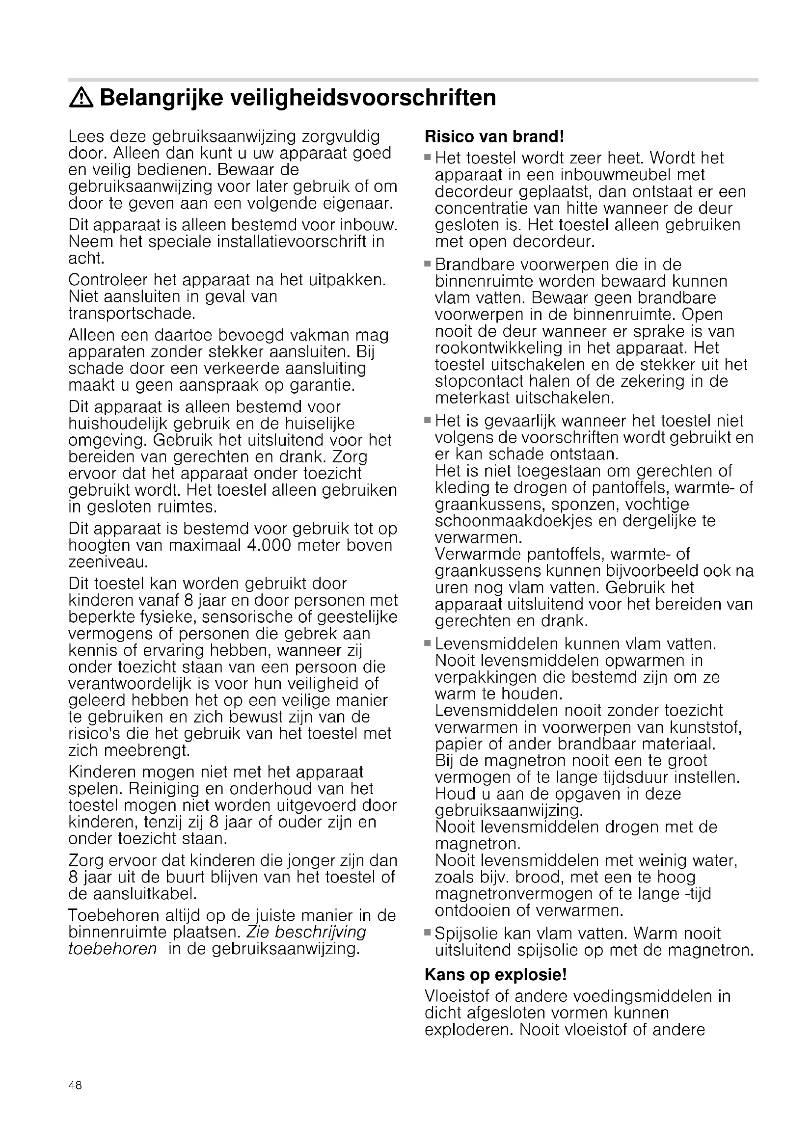 Spijsolie kan vlam vatten. Warm nooit uitsluitend spijsolie op met de magnetron. Kans op explosie! Vloeistof of andere voedingsmiddelen in dicht afgesloten vormen kunnen exploderen. Nooit vloeistof of andere49 voedingsmiddelen verhitten in dicht afgesloten vormen. Ernstig gezondheidsrisico!