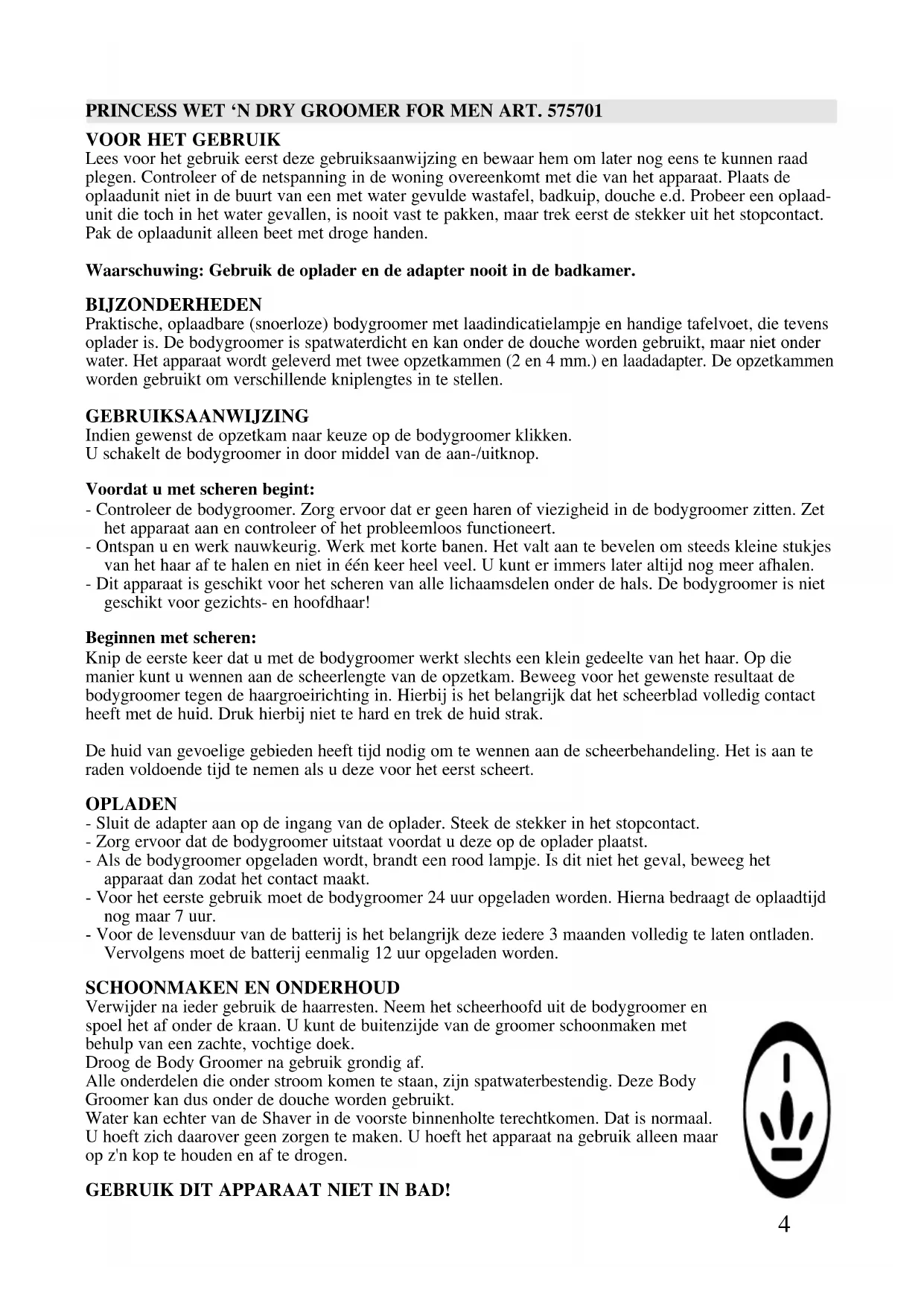 Lees voor het gebruik eerst deze gebruiksaanwijzing en bewaar hem om later nog eens te kunnen raad plegen. Controleer of de netspanning in de woning overeenkomt met die van het apparaat. Plaats de oplaadunit niet in de buurt van een met water gevulde wastafel, badkuip, douche e.d. Probeer een oplaad- unit die toch in het water gevallen, is nooit vast te pakken, maar trek eerst de stekker uit het stopcontact. Pak de oplaadunit alleen beet met droge handen. Waarschuwing: Gebruik de oplader en de adapter nooit in de badkamer. BIJZONDERHEDEN Praktische, oplaadbare (snoerloze) bodygroomer met laadindicatielampje en handige tafelvoet, die tevens oplader is. De bodygroomer is spatwaterdicht en kan onder de douche worden gebruikt, maar niet onder water. Het apparaat wordt geleverd met twee opzetkammen (2 en 4 mm.) en laadadapter. De opzetkammen worden gebruikt om verschillende kniplengtes in te stellen. GEBRUIKSAANWIJZING Indien gewenst de opzetkam naar keuze op de bodygroomer klikken. U schakelt de bodygroomer in door middel van de aan-/uitknop. Voordat u met scheren begint: - Controleer de bodygroomer. Zorg ervoor dat er geen haren of viezigheid in de bodygroomer zitten. Zet het apparaat aan en controleer of het probleemloos functioneert. - Ontspan u en werk nauwkeurig. Werk met korte banen. Het valt aan te bevelen om steeds kleine stukjes van het haar af te halen en niet in één keer heel veel. U kunt er immers later altijd nog meer afhalen. - Dit apparaat is geschikt voor het scheren van alle lichaamsdelen onder de hals. De bodygroomer is niet geschikt voor gezichts- en hoofdhaar! Beginnen met scheren: Knip de eerste keer dat u met de bodygroomer werkt slechts een klein gedeelte van het haar. Op die manier kunt u wennen aan de scheerlengte van de opzetkam. Beweeg voor het gewenste resultaat de bodygroomer tegen de haargroeirichting in. Hierbij is het belangrijk dat het scheerblad volledig contact heeft met de huid. Druk hierbij niet te hard en trek de huid strak. De huid van gevoelige gebieden heeft tijd nodig om te wennen aan de scheerbehandeling. Het is aan te raden voldoende tijd te nemen als u deze voor het eerst scheert. OPLADEN - Sluit de adapter aan op de ingang van de oplader. Steek de stekker in het stopcontact. - Zorg ervoor dat de bodygroomer uitstaat voordat u deze op de oplader plaatst. - Als de bodygroomer opgeladen wordt, brandt een rood lampje. Is dit niet het geval, beweeg het apparaat dan zodat het contact maakt. - Voor het eerste gebruik moet de bodygroomer 24 uur opgeladen worden. Hierna bedraagt de oplaadtijd nog maar 7 uur. - Voor de levensduur van de batterij is het belangrijk deze iedere 3 maanden volledig te laten ontladen. Vervolgens moet de batterij eenmalig 12 uur opgeladen worden.