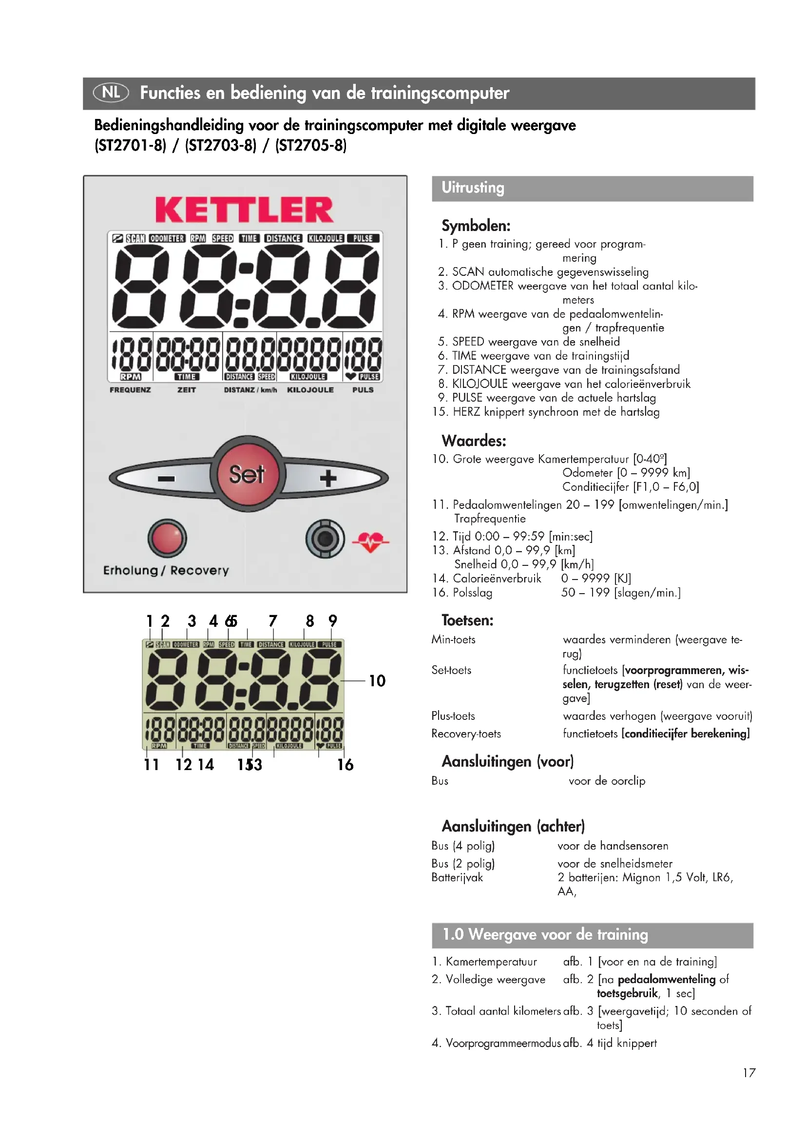 - Houd uw handen rustig en vermijd contracties en wrijven op de contactvlakken. Met cardio-puls-set Zie de daarbij horende handleiding. Storingen in de polsslagweergave Als er zich toch een keer problemen voordoen bij de polsslagme- ting, controleert u dan nogmaals bovenstaande punten. Controleer de spanning van de batterijen. Storingen met de trainingscomputer Bij merkwaardig gedrag van de trainingscomputer dient u de bat- terijen te verwijderen, de spanning van de batterijen te controle- ren en de batterijen weer terug te plaatsen. Noteer vooraf de ki- lometerstand. De opgeslagen totaal aantal kilometers gaan bij verwisseling van de batterijen verloren. ■ Raadpleeg alvorens met de training te beginnen uw huisarts en vraag of de training met dit apparaat voor u geschikt is. Zijn diagnose is belangrijk voor het bepalen van de intensiviteit van uw training. Een verkeerd uitgevoerde of te intensieve training kan uw gezondheid negatief beïnvloeden. Deze hometrainer is speciaal voor de recreatieve sporter ontwik- keld en uitstekend geschikt voor hart- en bloedsomlooptraining. De training met de hometrainer dient te geschieden volgens een bepaalde methode en de principes van de duurtraining. Daardo- or ontstaan vooral veranderingen en aanpassingen van het hart en het bloedomloopsysteem, zoals een lagere polsslag in rust en tijdens de training. Hierdoor heeft het hart meer tijd voor het vul- len van de hartkamers en voor de doorbloeding van de hartspie- ren (door de kransslagaders). Tevens neemt de diepte van de ademhaling en het de hoeveelheid lucht die kan worden ingea- demd toe (vitale capaciteit). Verdere positieve veranderingen vin- den plaats in de stofwisseling. Om deze positieve veranderingen te bereiken, moet men de training volgens bepaalde regels door- voeren. Trainingsintensiteit (Hometrainer) De intensiteit wordt bij het oefenen met de hometrainer deels door de trapfrequentie en deels door de trapweerstand geregeld. De trainende persoon bepaalt de trapweerstand d.m.v. de rem- krachtverstelling aan de stuurkolom. Let er steeds op dat U niet te intensief traint, zodat overbelasting vermeden wordt. Trainingsintensiteit (Cross-trainer) De intensiteit wordt bij het oefenen met de crosstrainer deels door de trapfrequentie en deels door de trapweerstand geregeld. De trapweerstand bepaald de oefenaar met de 10-delige schake- laar. Let er steeds op dat U de intensiteit niet te hoog neemt, om overbelasting te vermijden. Foutieve of overmatige training kan schadelijk zijn voor de ge- zondheid. Controleer daarom tijdens de training aan de hand van uw polsslag, of U uw trainingsintensiteit juist bepaald heeft. De vuistregel voor een juiste polsslag is: Hieruit volgt, dat bijv. een 50-jarige persoon zijn duurtraining met een polsslag van 130 zou moeten uitvoeren. Trainingsaanbevelingen op basis van deze berekeningen worden door talrijke gewaardeerde sportartsen als gunstig beschouwd. Dien ten gevolge dient U de trapfrequentie en de trapweerstand tijdens de training zo in te stellen, dat U uw optimale polsslag vol- gens de bovengenoemde vuistregel bereikt. Deze aanbevelingen zijn enkel van toepassing op gezonde perso- nen en gelden niet voor mensen met aandoeningen aan hart en/of bloedsomloop. Belastingsomvang Een beginner verhoogt geleidelijk de intensiteit van zijn training. De eerste trainingseenheden zouden relatief kort en volgens een intervaltraining moeten worden opgebouwd. Sportartsen beschouwen de volgende intensiteit als effectief: 180 minus leeftijd